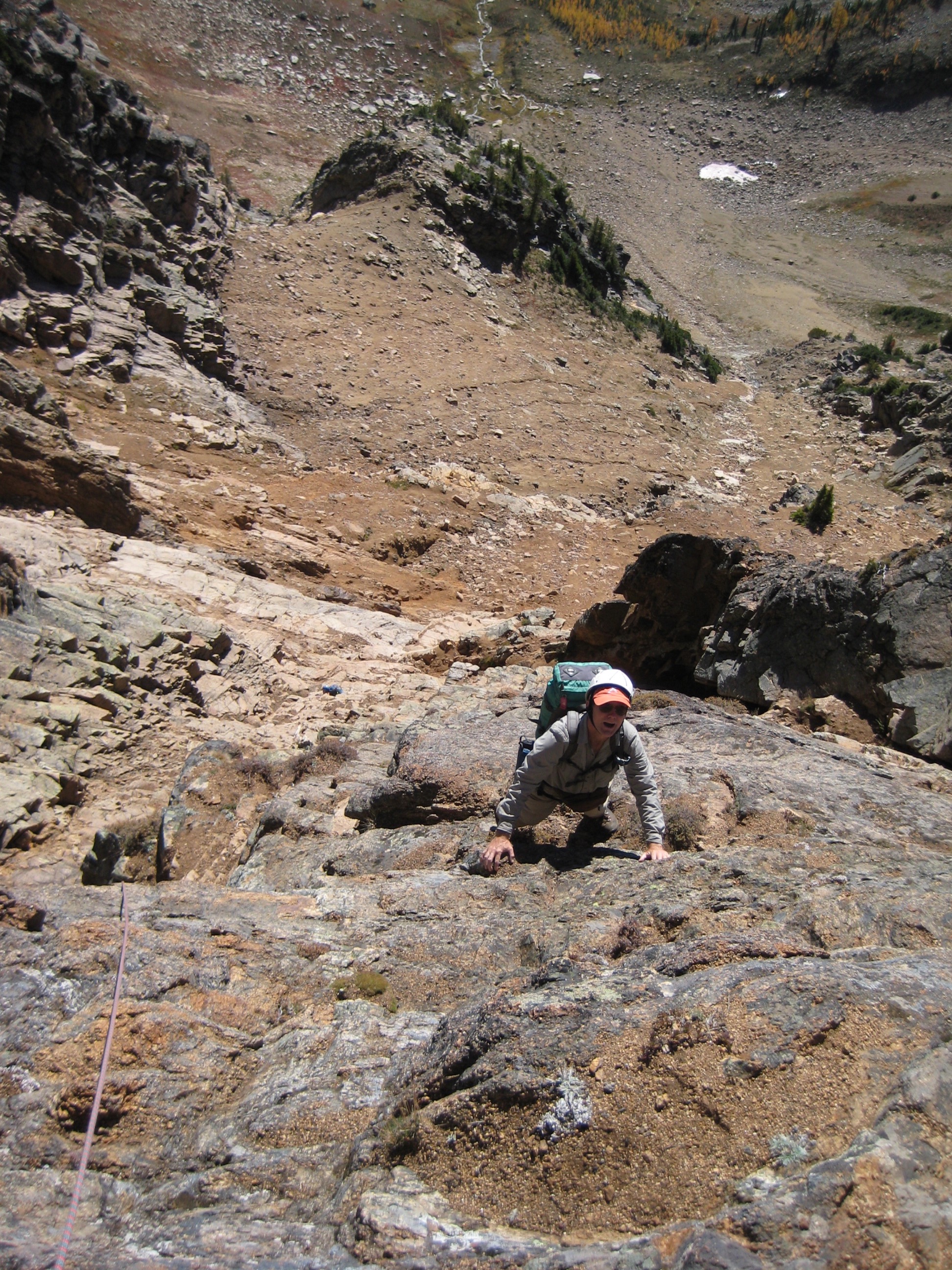 Norm and Nick were already making their way up what we (and they) initially thought to be the “first southwest gully.” We soon decided to scratch that option, based on their slow progress and the scary sound of rockfall. After re-reading several route descriptions, however, we concluded that they were actually in the SECOND gully rather than the FIRST.