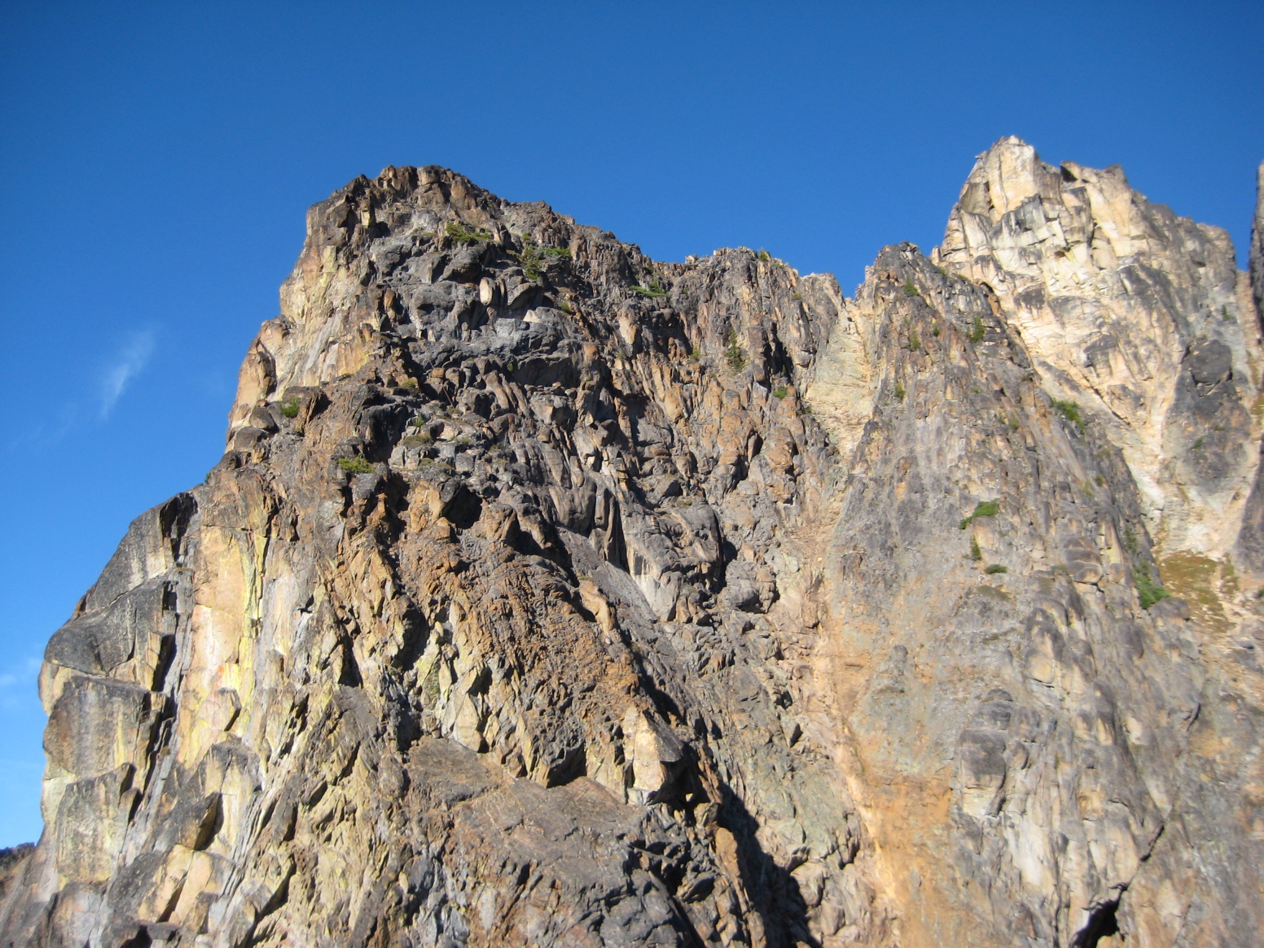 Views from this saddle were marvelous, but the peak was guarded by a daunting west buttress. We pondered our route options, which Beckey describes as (1) an unprotectable and intimidating Class 3-4 scramble up the buttress, (2) a poorly protected Class 3-4 scramble up the crumbly “first southwest gully,” and (3) a poorly protected Class 3-4 scramble up the loose “second southwest gully.” Our fourth option was to go home, and that was starting to look pretty good.