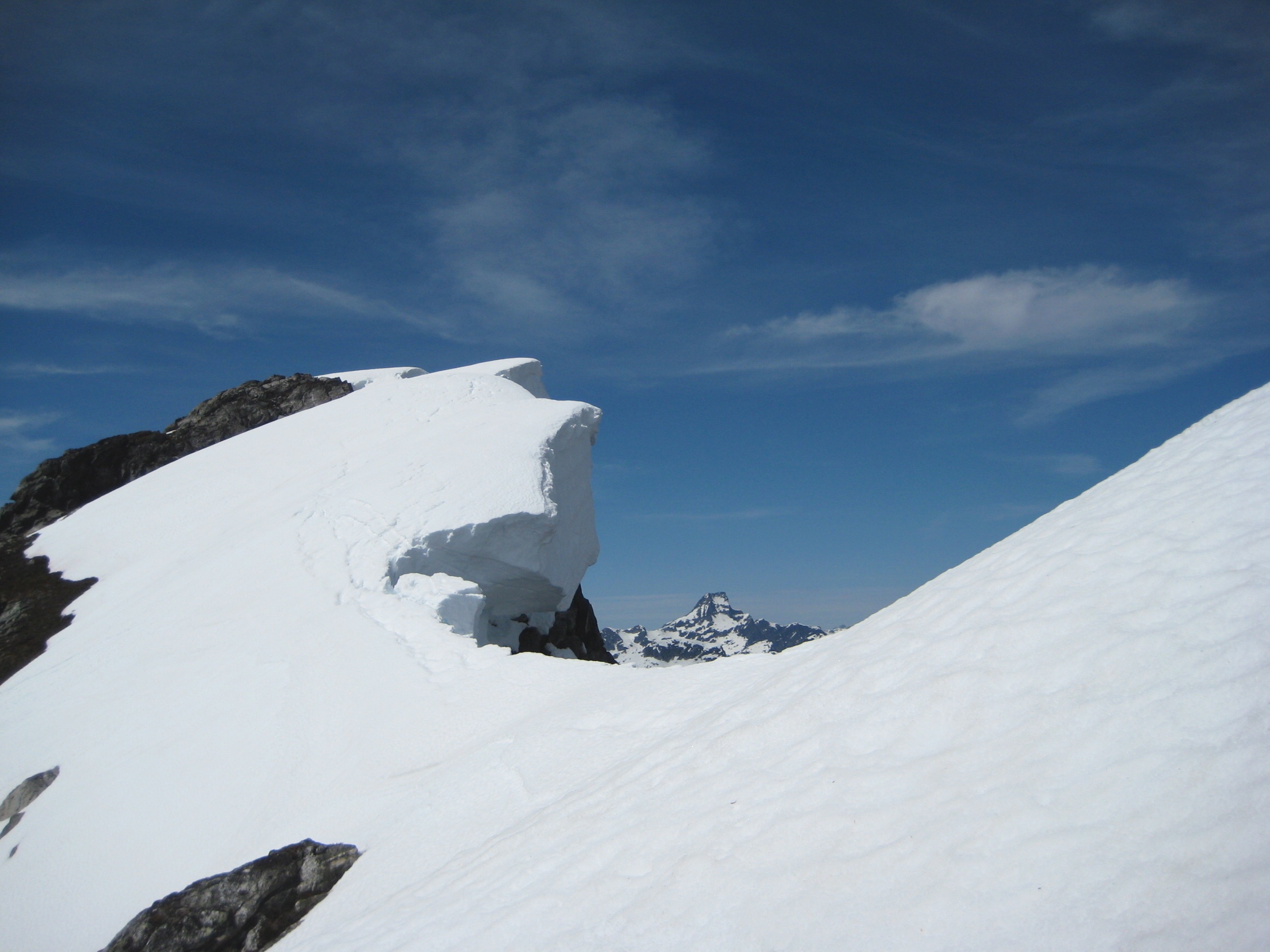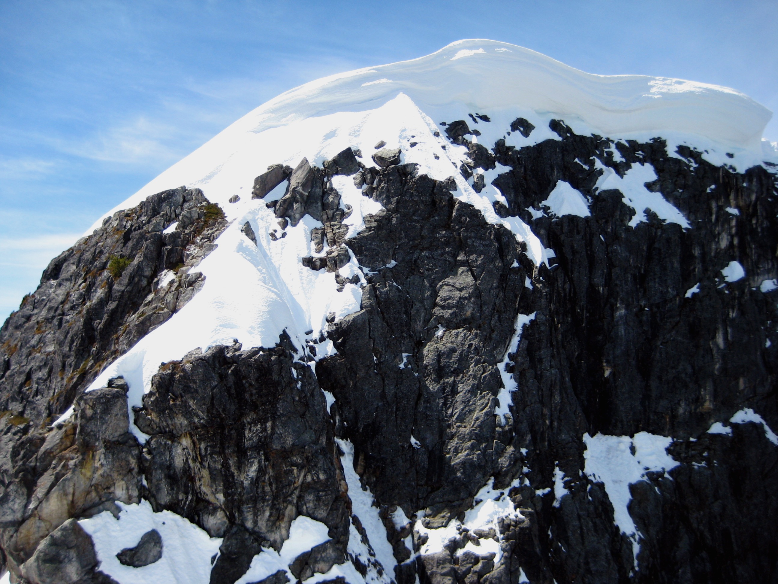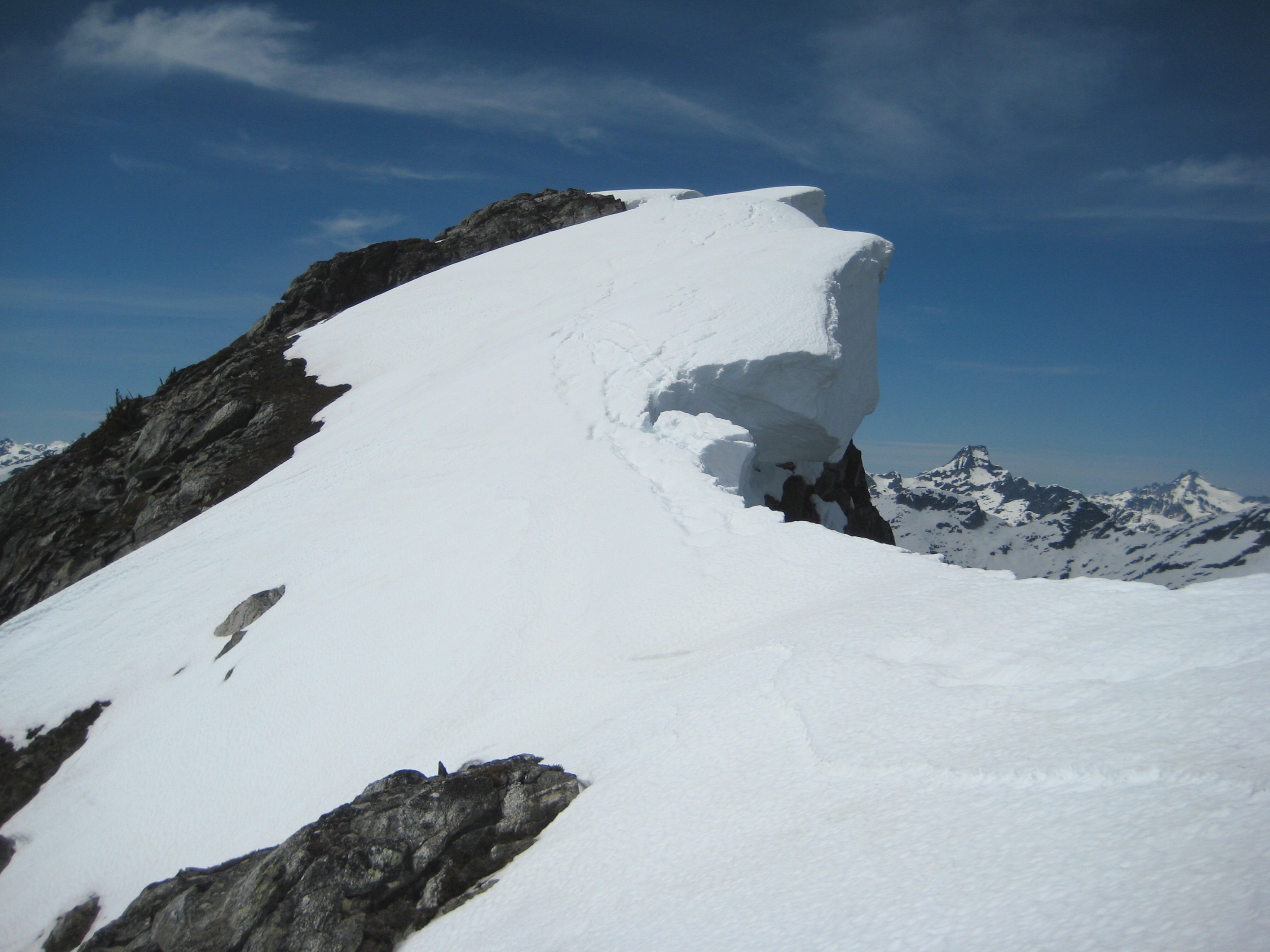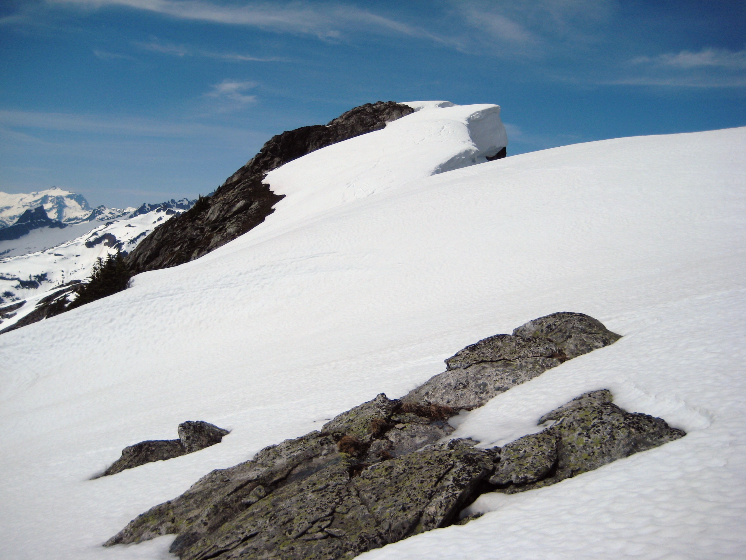 We traversed under the cliffy south ridge, with its impressive cornices, then ascended a steep snowfinger that terminated on the east ridge crest.