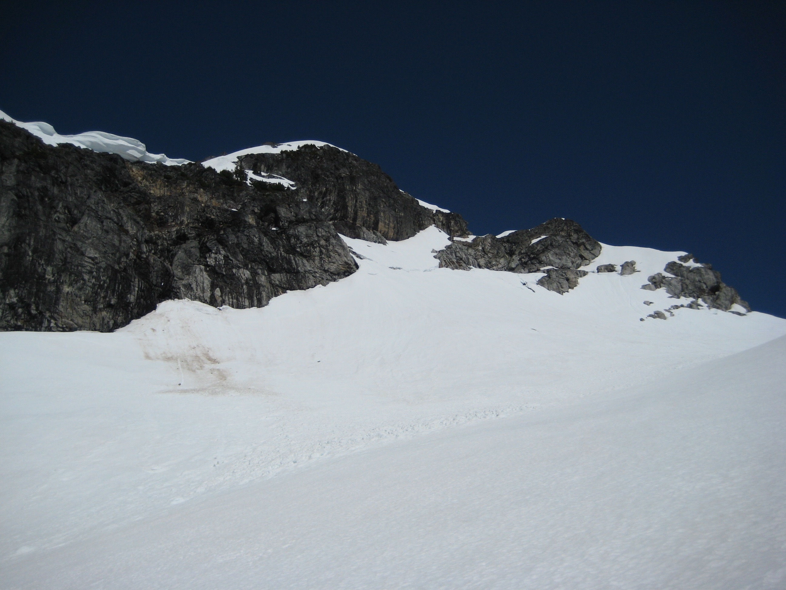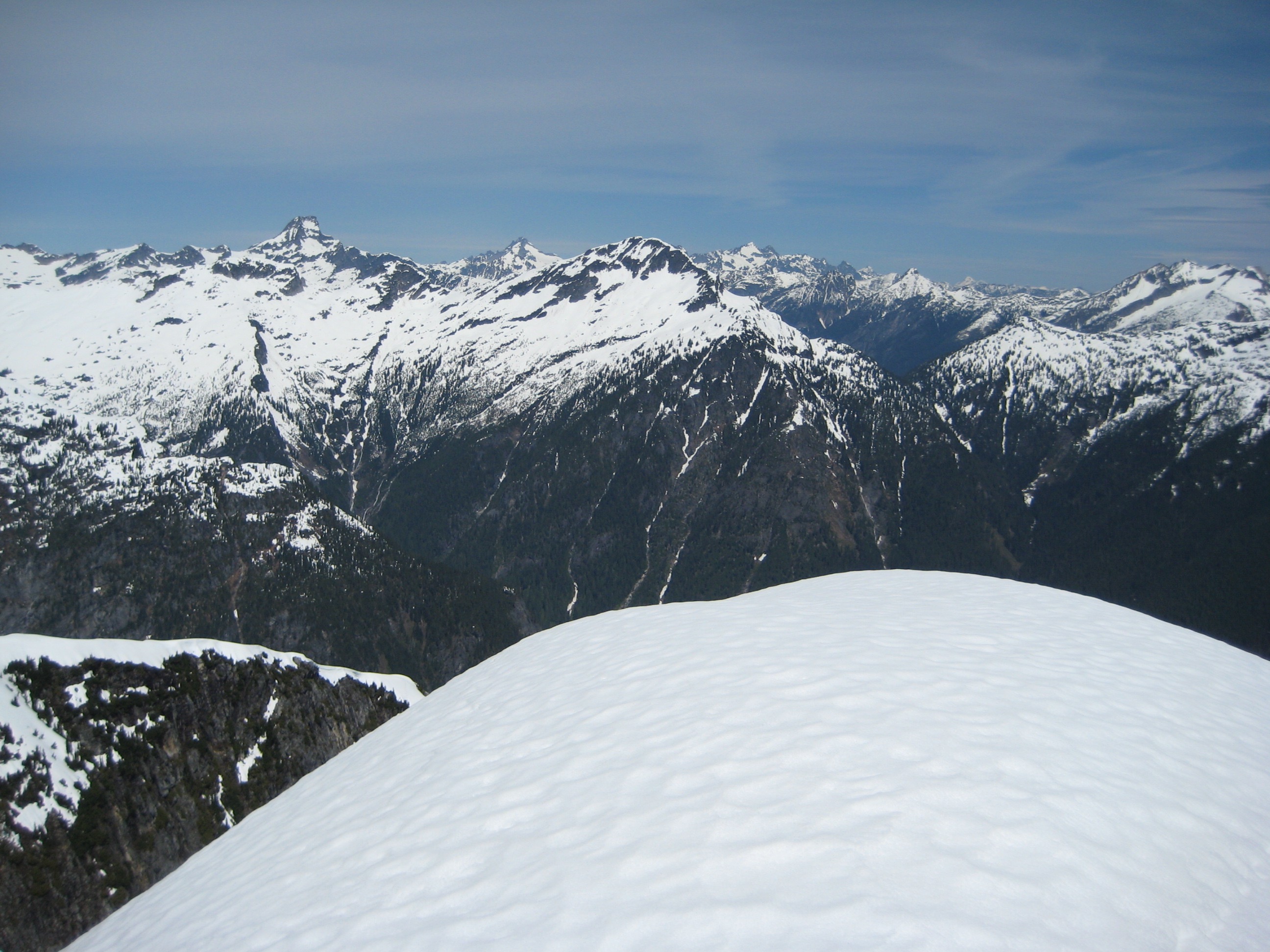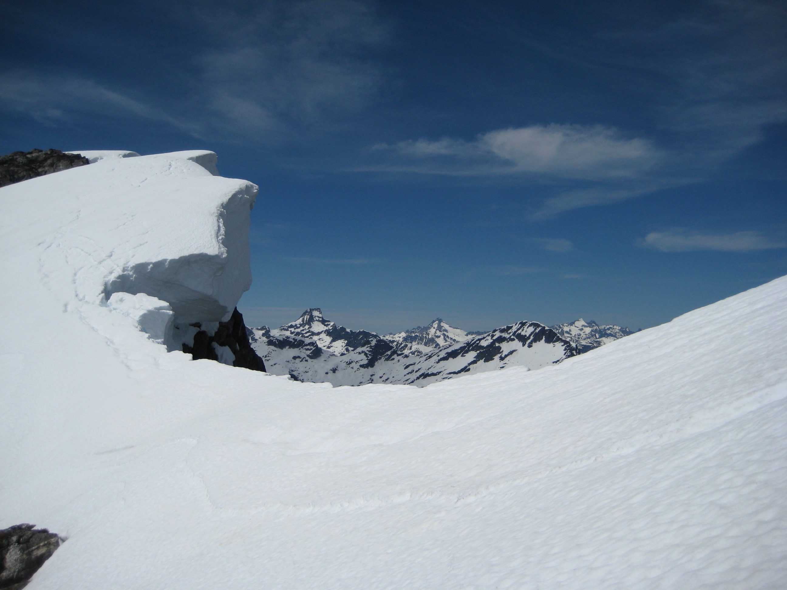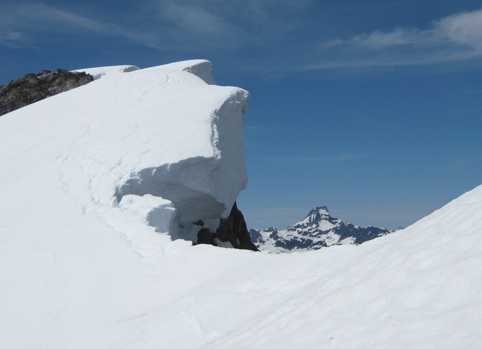 We traversed under the cliffy south ridge, with its impressive cornices, then ascended a steep snowfinger that terminated on the east ridge crest.
