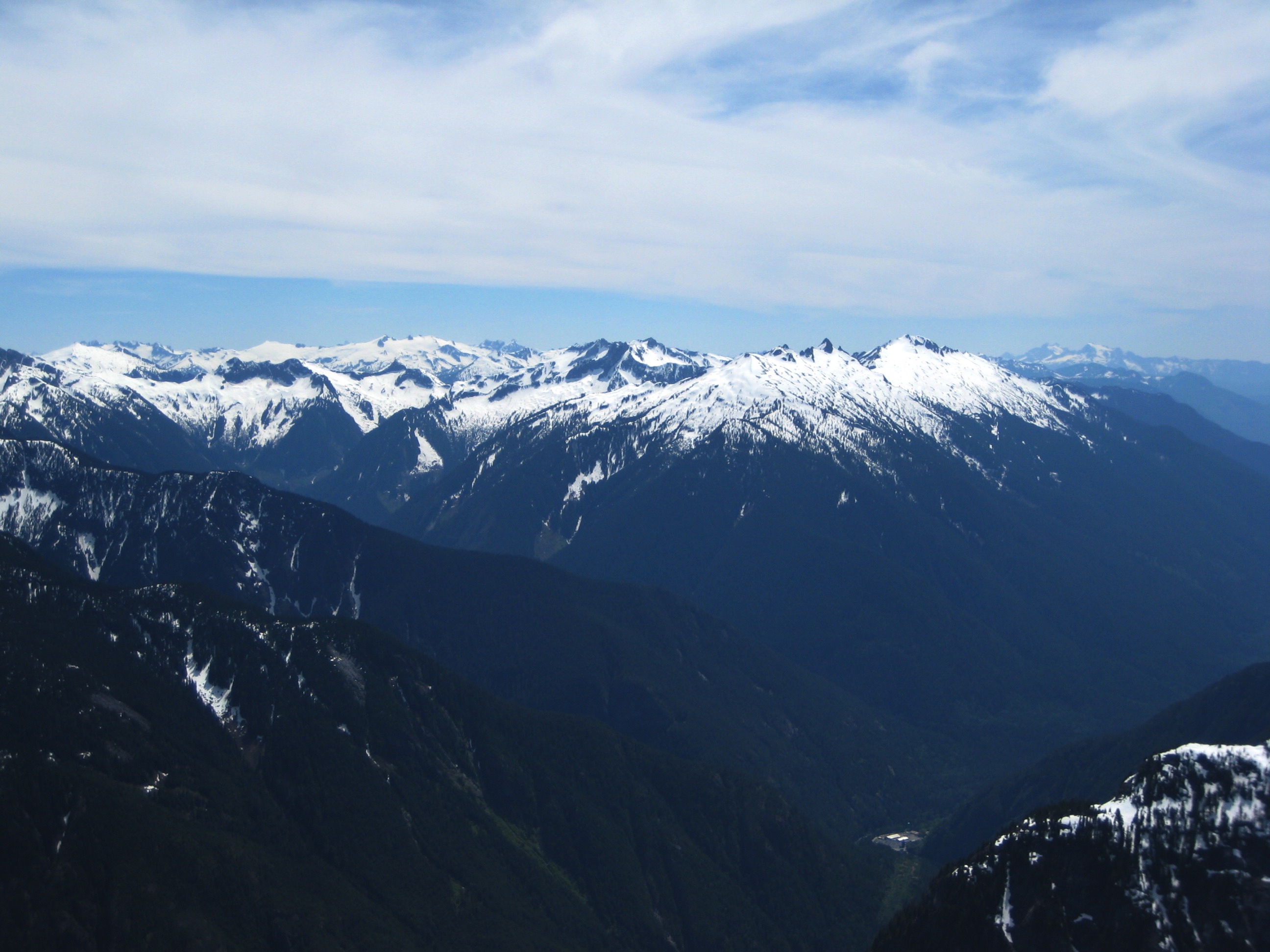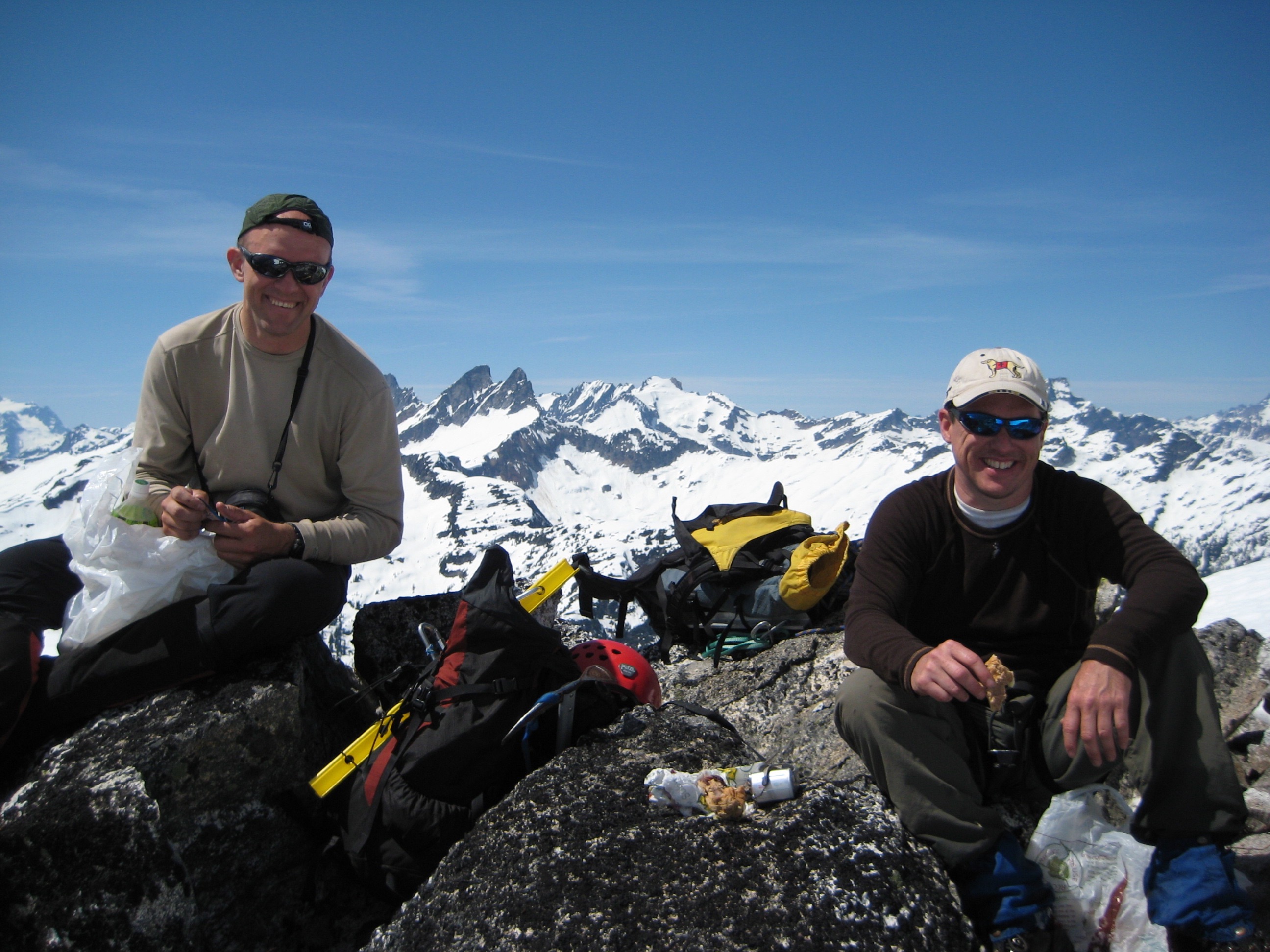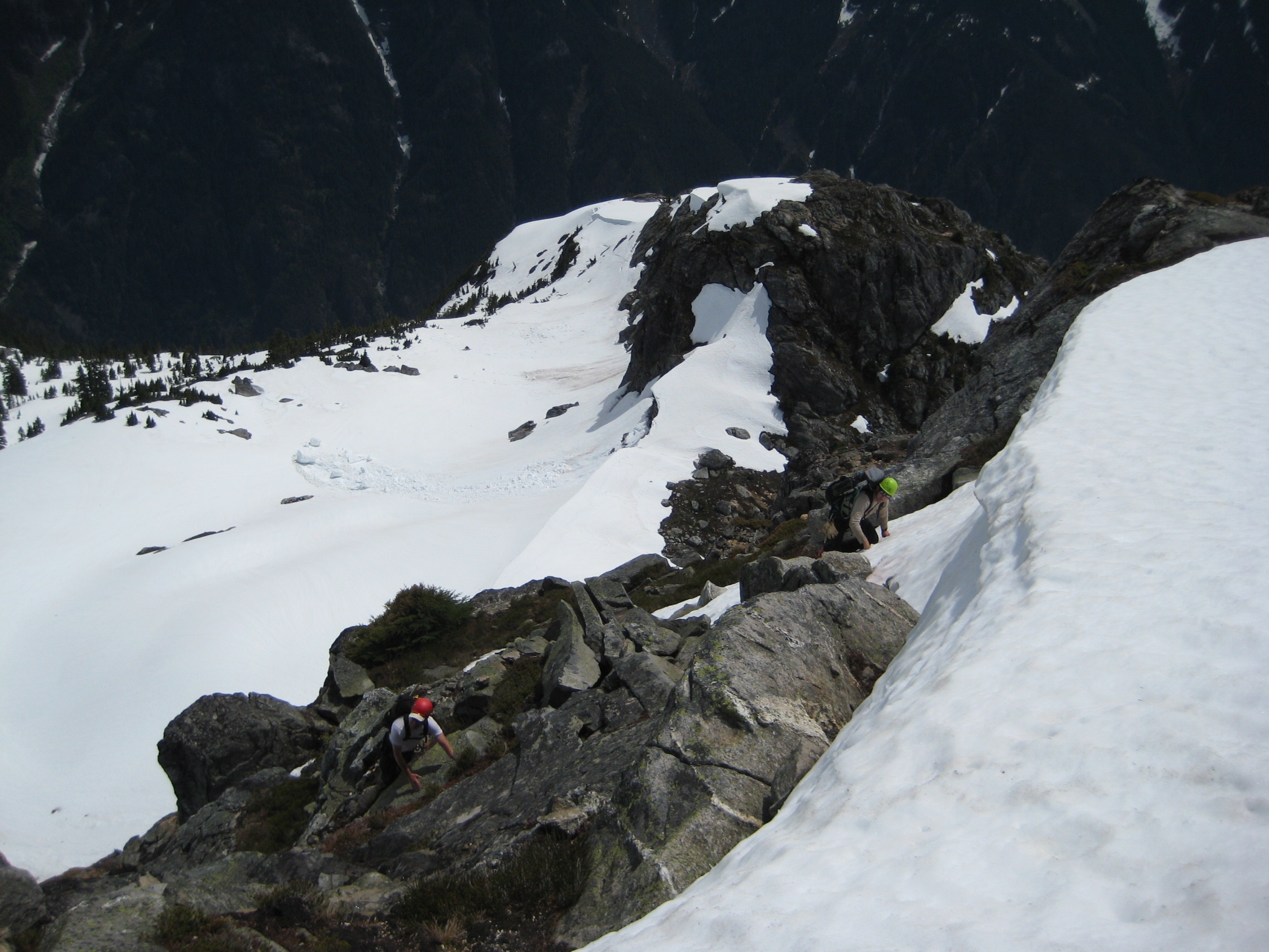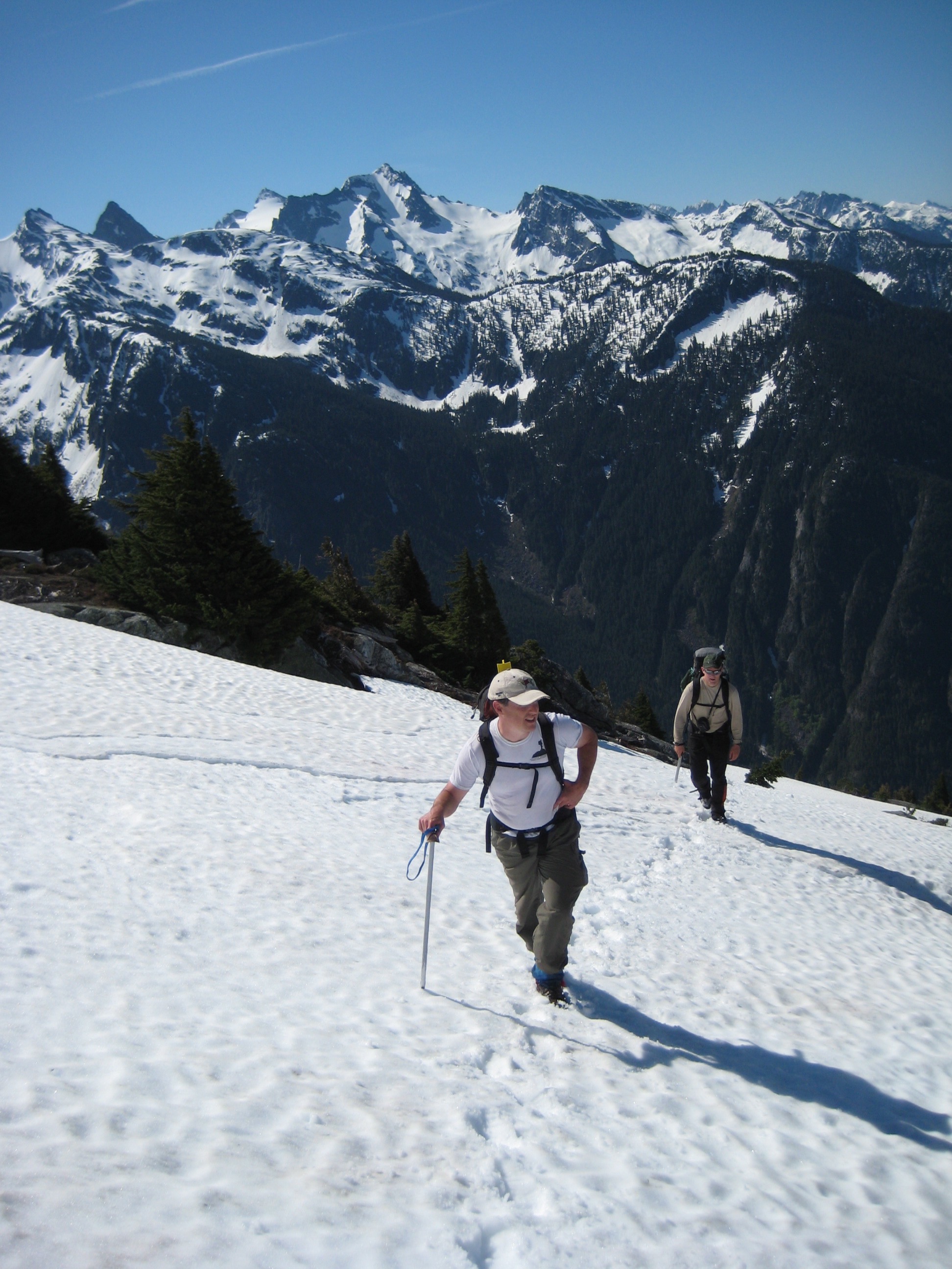 Once off the snow, we traversed leftward into dense timber and began a 3000-foot plunge to the car. Kevin did a nice job of leading us down open forest. We somehow completely missed the upper cliff band but not the lower cliff band, which was dispatched by another single-rope rappel. We continued plunging down through noisy salal and finally stepped onto the emphatically level surface of Highway 20 at 7:30pm (4.1 hours from summit) to end a great day on a great mountain.