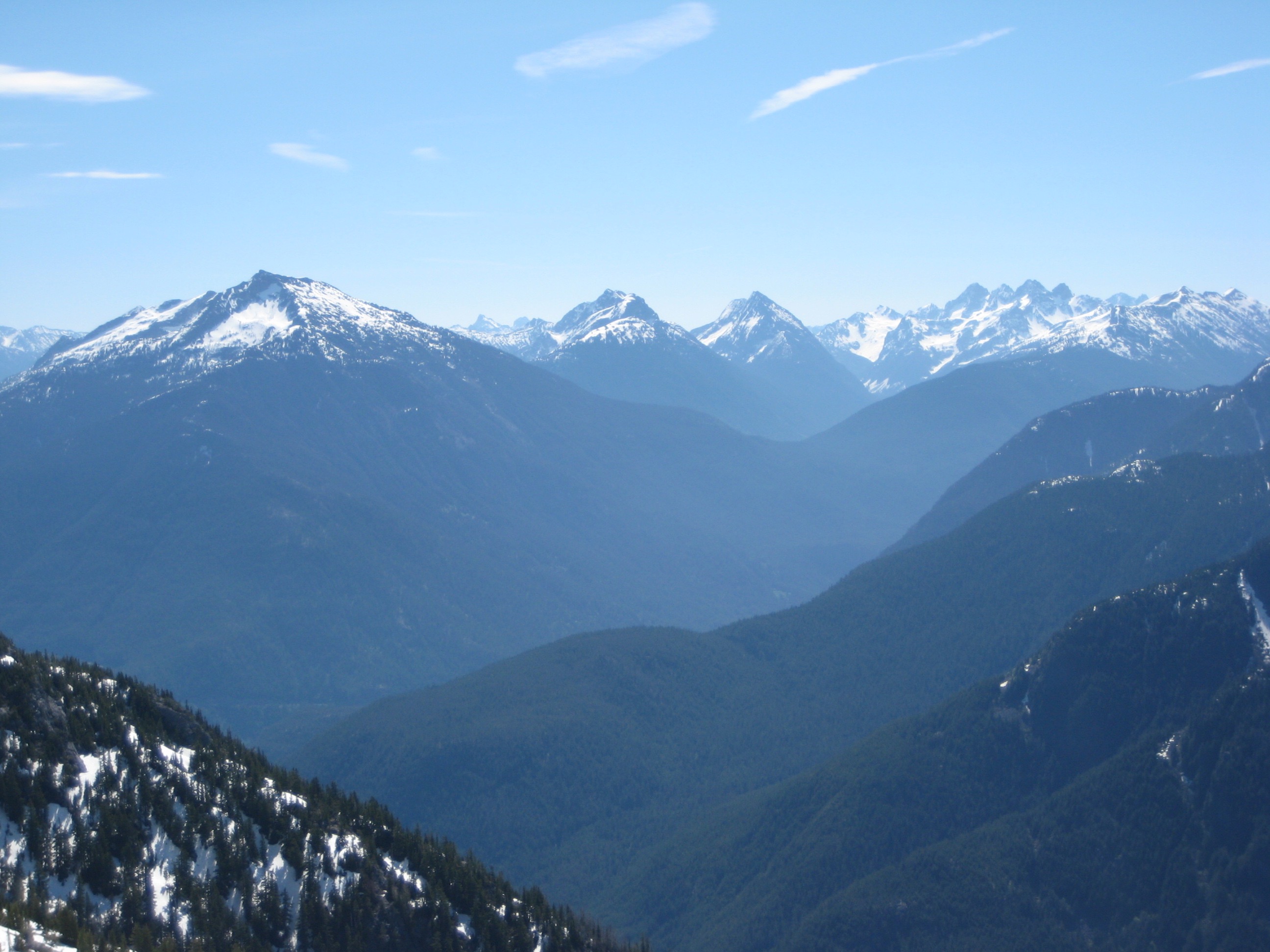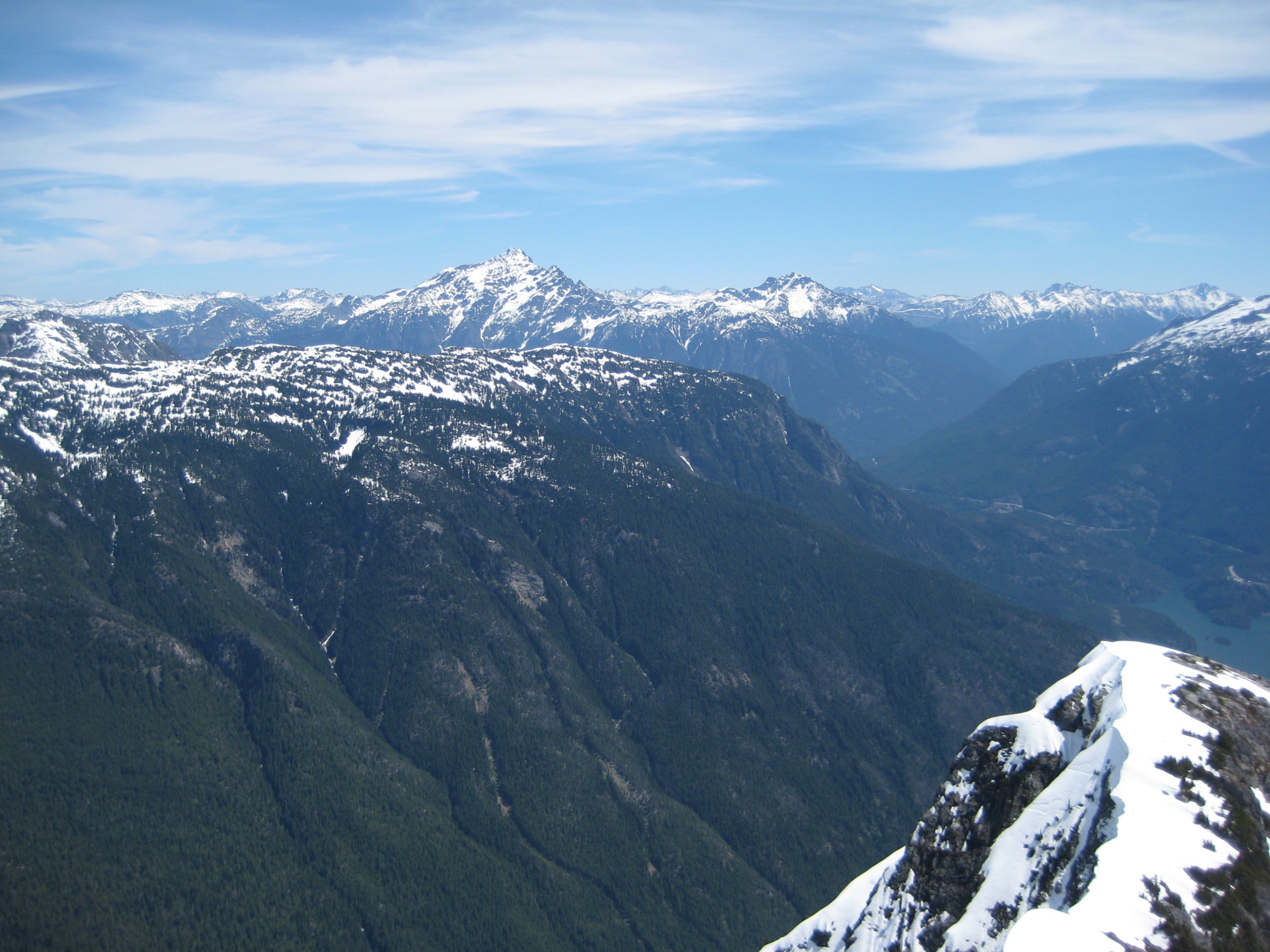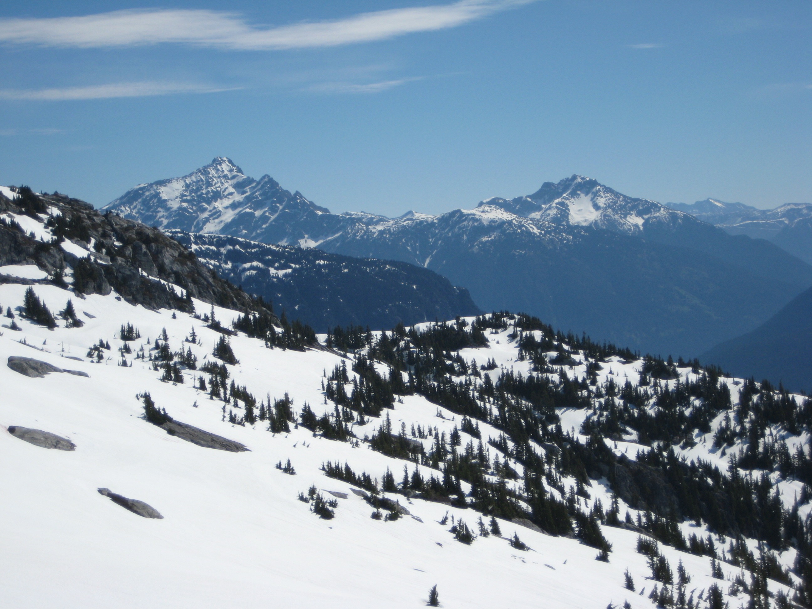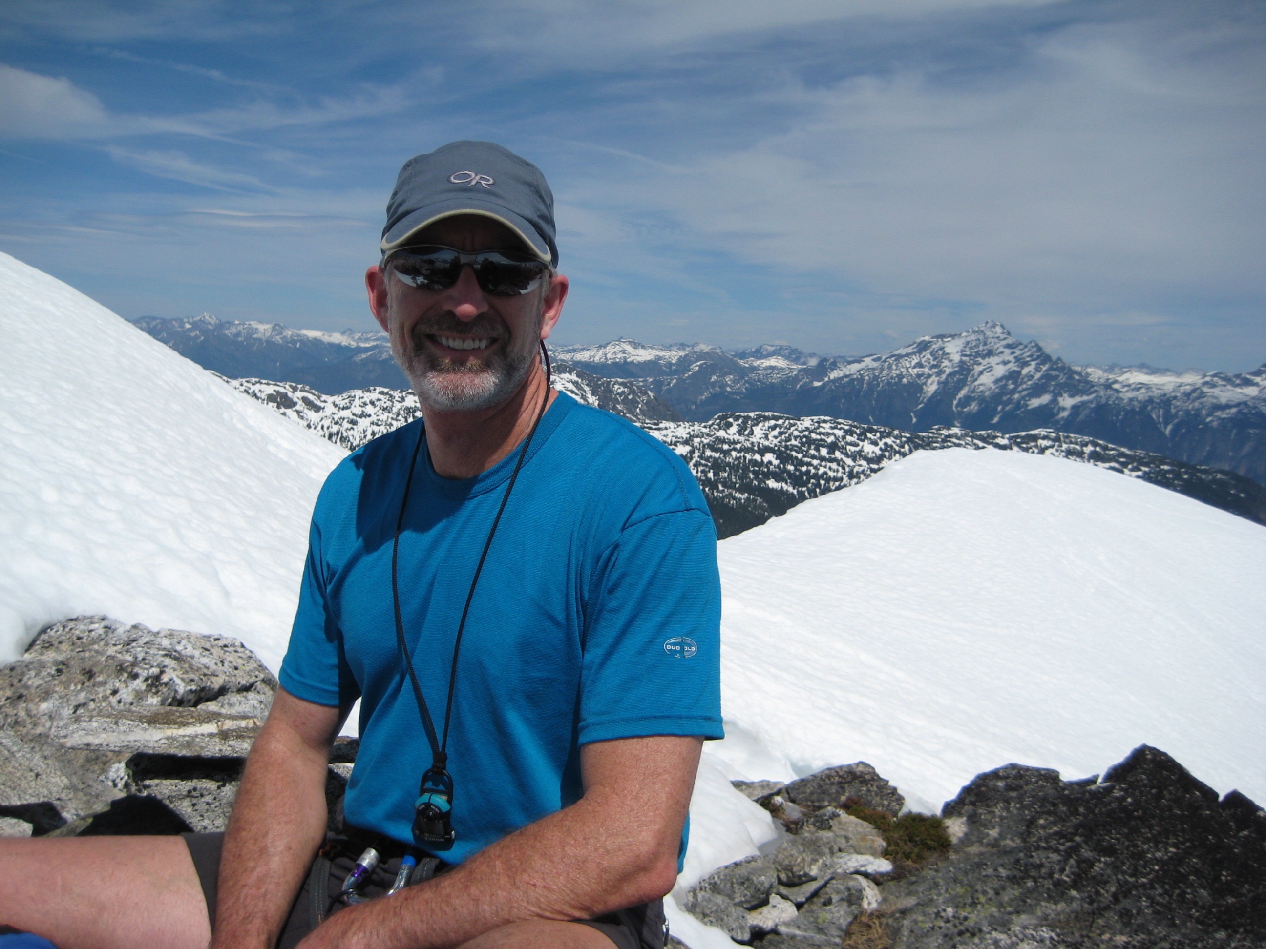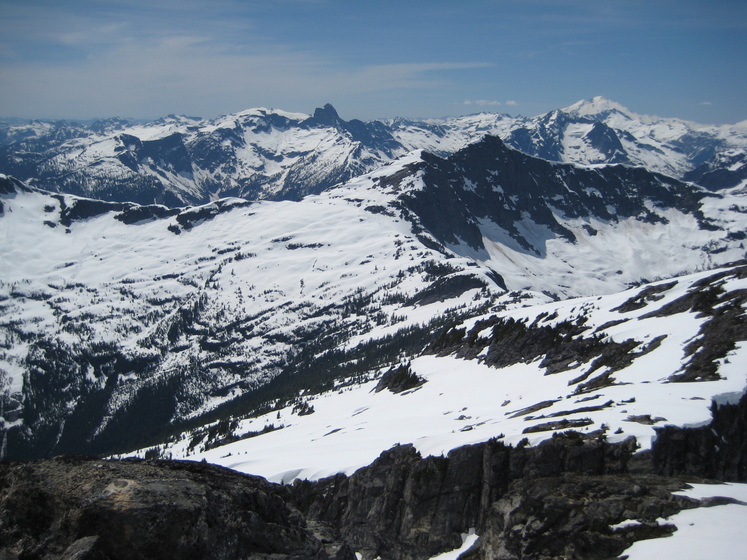 Once off the snow, we traversed leftward into dense timber and began a 3000-foot plunge to the car. Kevin did a nice job of leading us down open forest. We somehow completely missed the upper cliff band but not the lower cliff band, which was dispatched by another single-rope rappel. We continued plunging down through noisy salal and finally stepped onto the emphatically level surface of Highway 20 at 7:30pm (4.1 hours from summit) to end a great day on a great mountain.