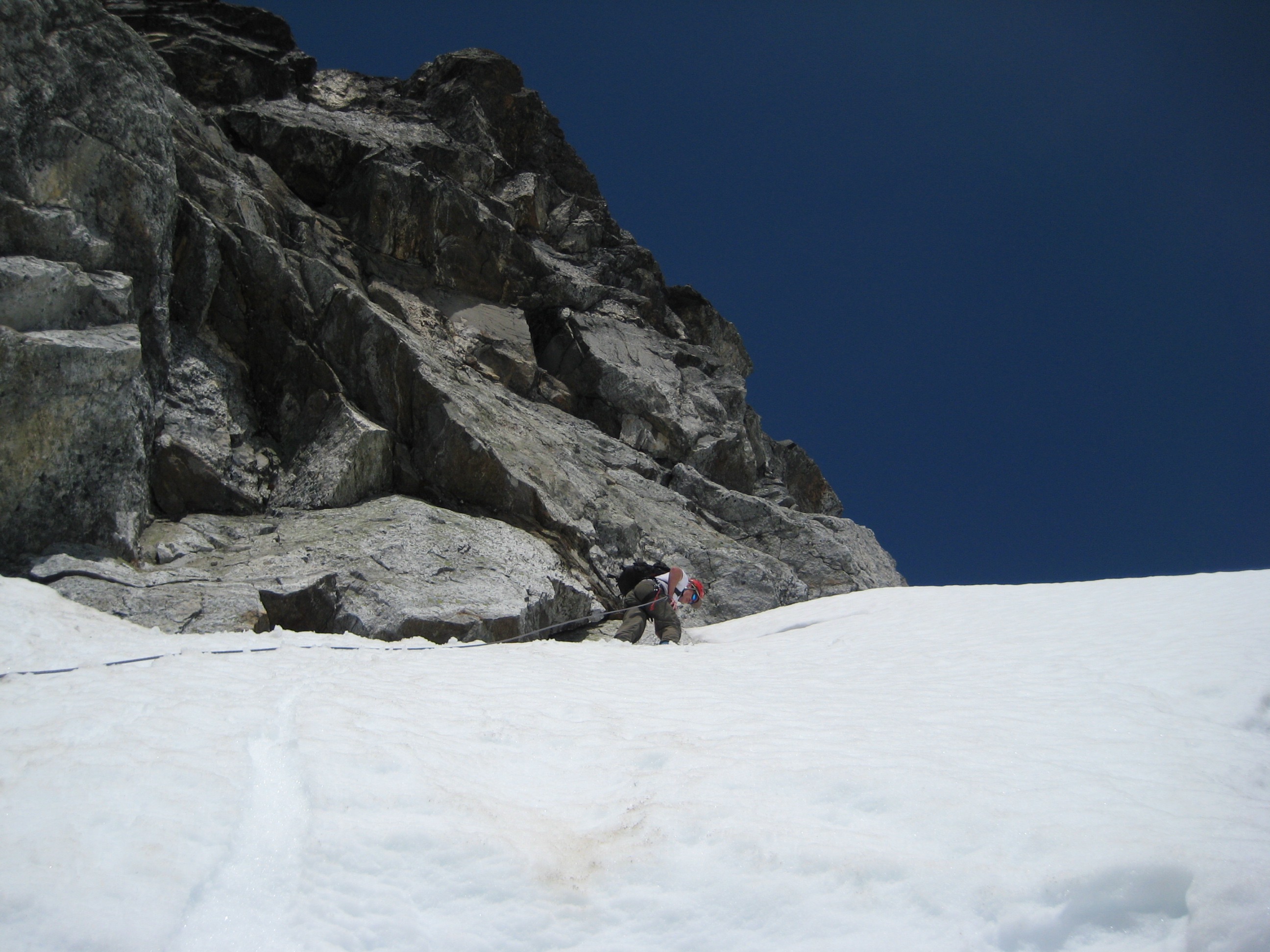 This is where fate intervened with a bizarre twist. As John crossed the moat, he suddenly fell backwards and started sliding headfirst down the lower snow slope! When the belay rope came taut, it was somehow twisted around his right thumb, which took the full brunt of rope tension. After he came to a stop, we did a quick assessment and determined that his thumb was slightly dislocated but not broken.