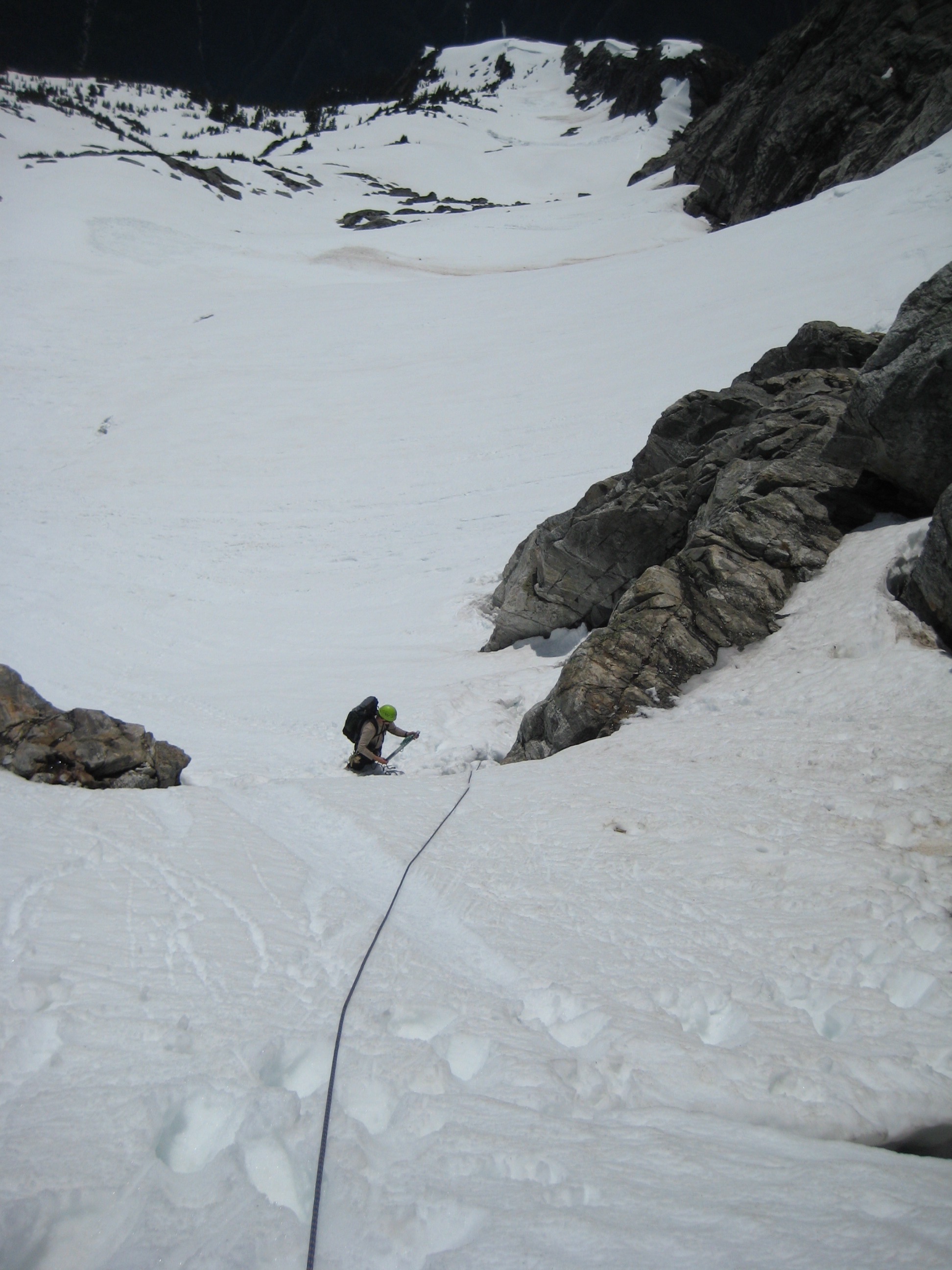 We quickly descended the south ridge to the rock buttress, then made a single-rope rappel over the slimy upper slabs to a ledge below. Soon we were back around Point 5872 and able to glissade the snow slopes and snow gully to Elev. 4100 feet. Snow conditions had been perfect in both directions on this day: firm in the morning, soft in the afternoon.