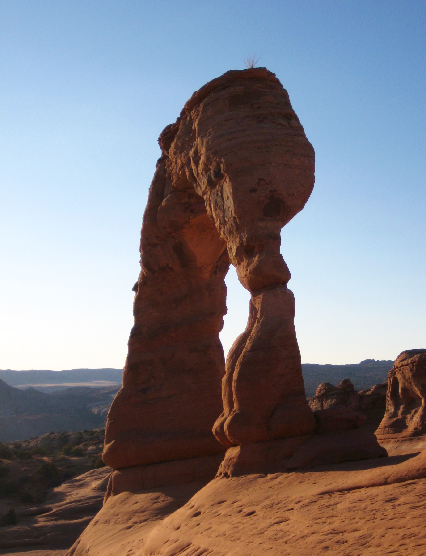 Utah is the proud home of no less than five national parks, each containing an uncountable number of geological marvels. Against such tremendous competition, one natural feature stands above all others to serve as an icon for the entire state: Delicate Arch. This fabulous sandstone crescent appears on license plates, in tourism ads, on postage stamps, on commercial signs, and many other places. The Olympic torch was carried under the arch in 2002, and the crown of the arch became the crime scene for a scandalous rock climb in 2006. Needless to say, Eileen and Brooke and I had to make a visit during our Utah vacation.