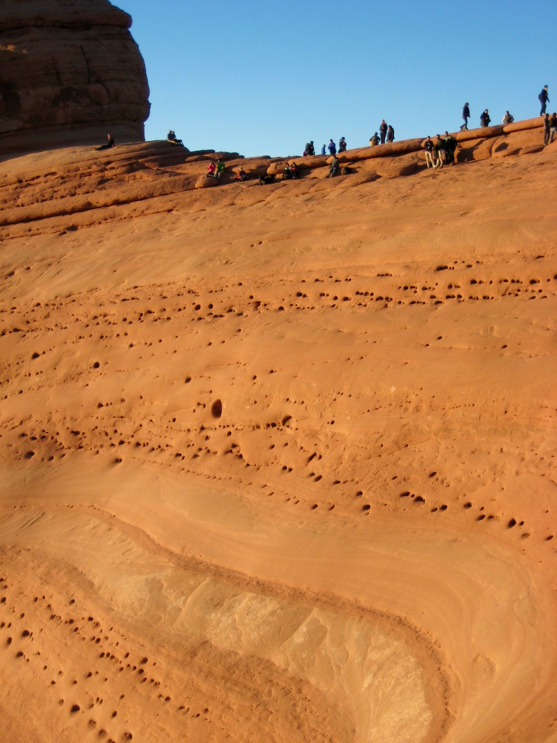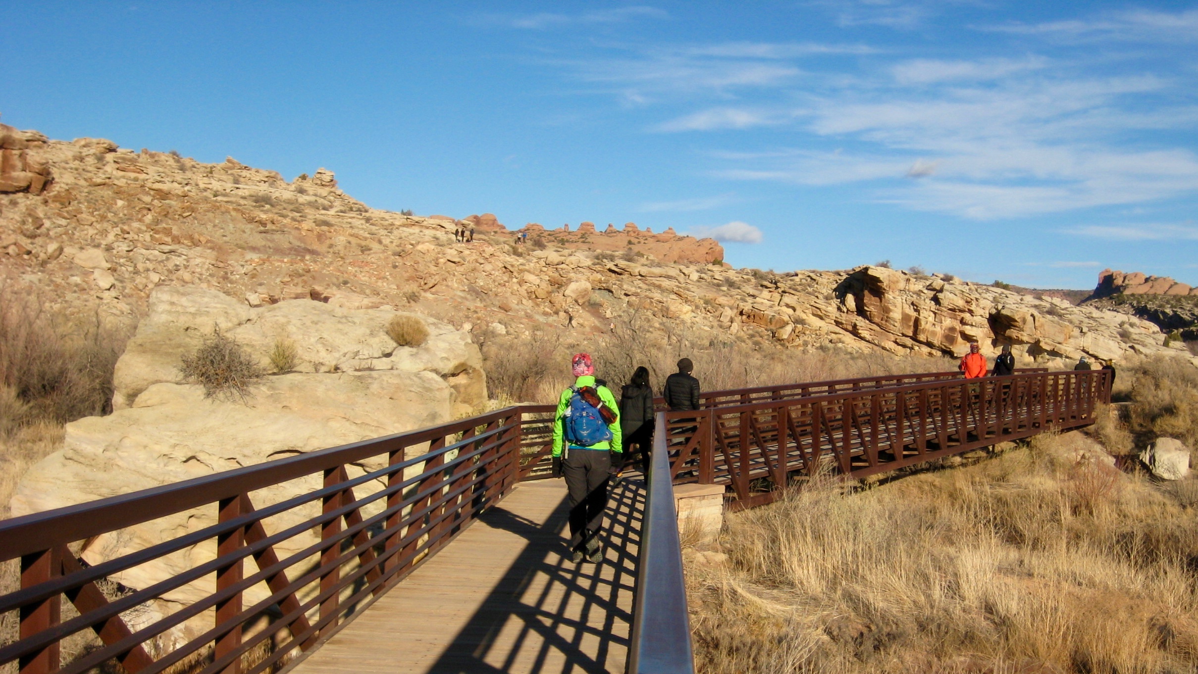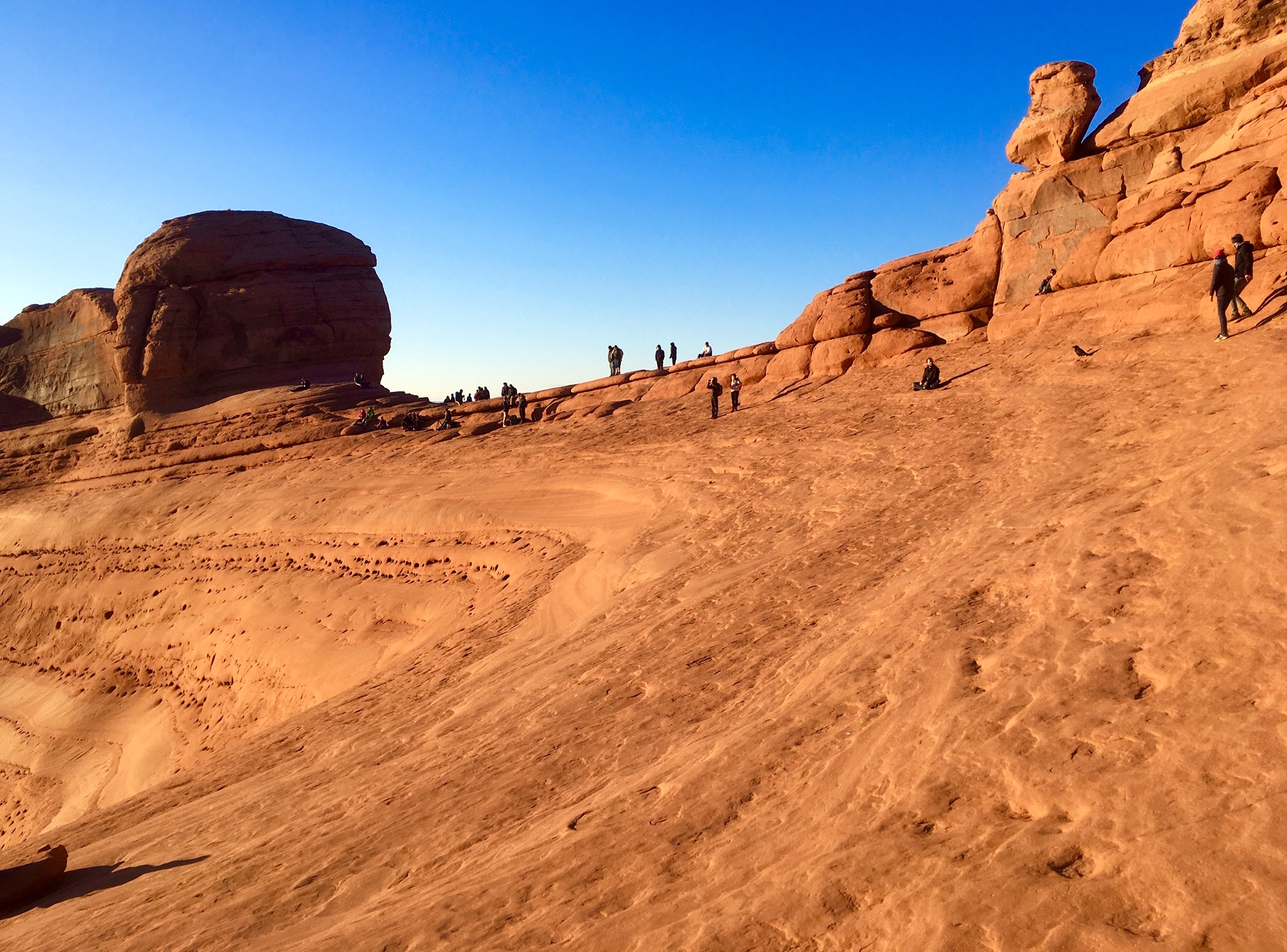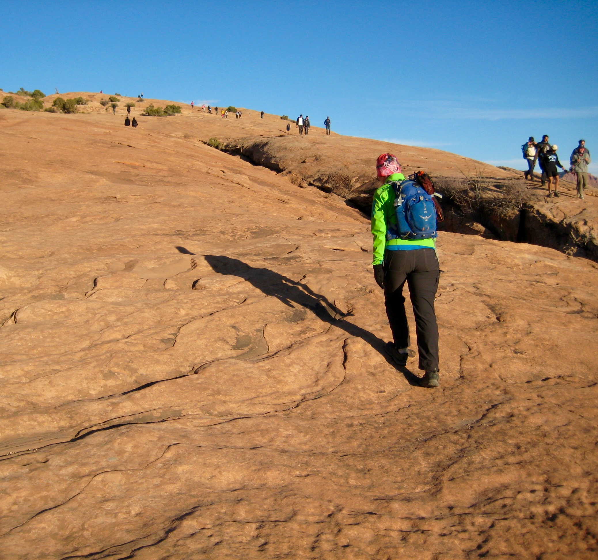 With a plan of seeing Delicate Arch at sunset, we set out from the trailhead in late afternoon. The well-trodden trail starts by crossing Salt Wash on a long steel bridge and then traversing above Winter Camp Wash on single-track. In about ¾ mile, the trail spills onto a large expanse of gently inclined sandstone. Looking up at the numerous groups of people ascending and descending the slabby rock, I realized that this is not so much a hike as it is a pilgrimage.