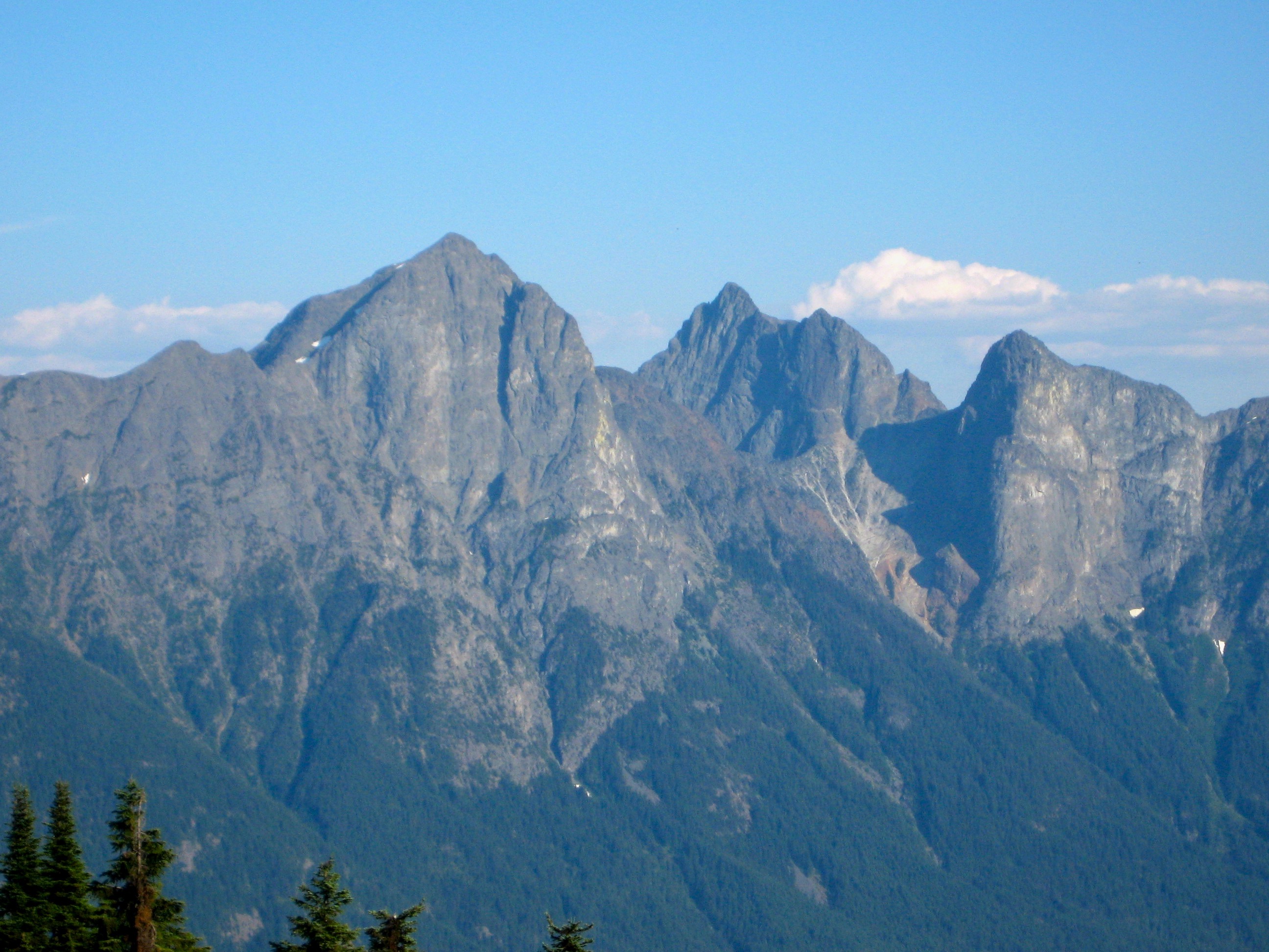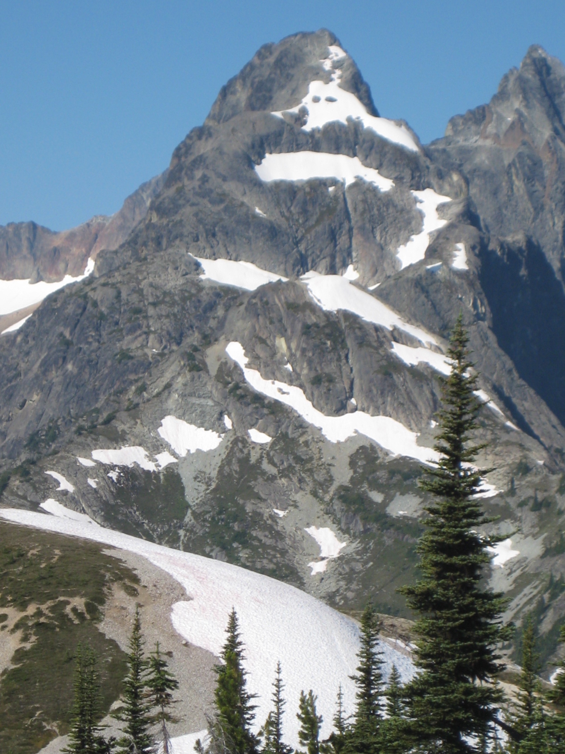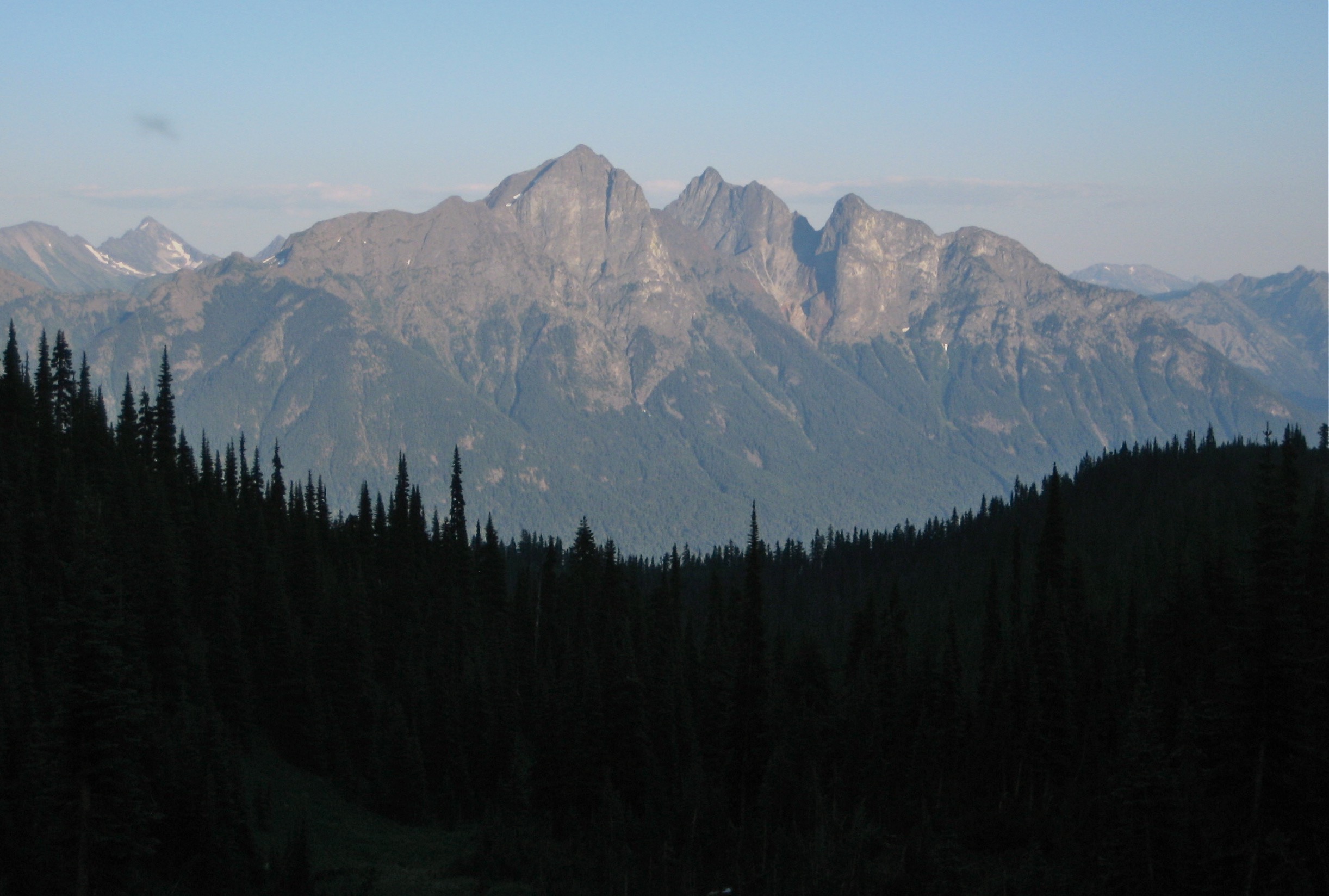 I look forward to hooking up with Mike T and Fay at least once every summer to do a climb, but it has become increasingly difficult to find a peak that neither of them has already done. This year, I hit the jackpot by suggesting Devil’s Tongue, a relatively obscure peak in the American Chilliwack Mountains. My interest in Devil’s Tongue began a few years ago, when I first saw the new North Cascades National Park commemorative license plates; the “Tongue” stands out like a stone beacon in Lee Mann’s remarkable long-distance photograph. Mike and Fay had their own reasons for wanting this peak. Ultimately, it proved to be a worthy summit in an incredibly scenic part of the Cascades, but the Devil managed to get plenty of licks in.