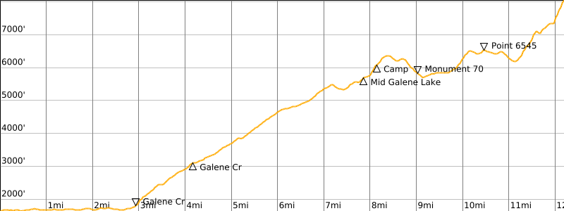Around 5:30pm, Mike and Fay arrived at the lake, which had some agreeable campsites, but we decided to ascend another 500 feet to Upper Galene Lake in hopes of getting above the bugs. This strategy did not pan out at all, because the mosquitoes were every bit a prevalent when we arrived at 7:00pm (7.4 hours from car). On the positive side, we had better views and were closer to our objective peak.