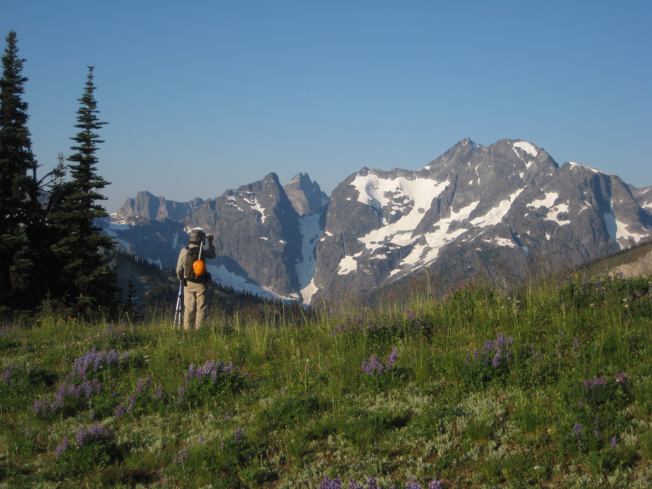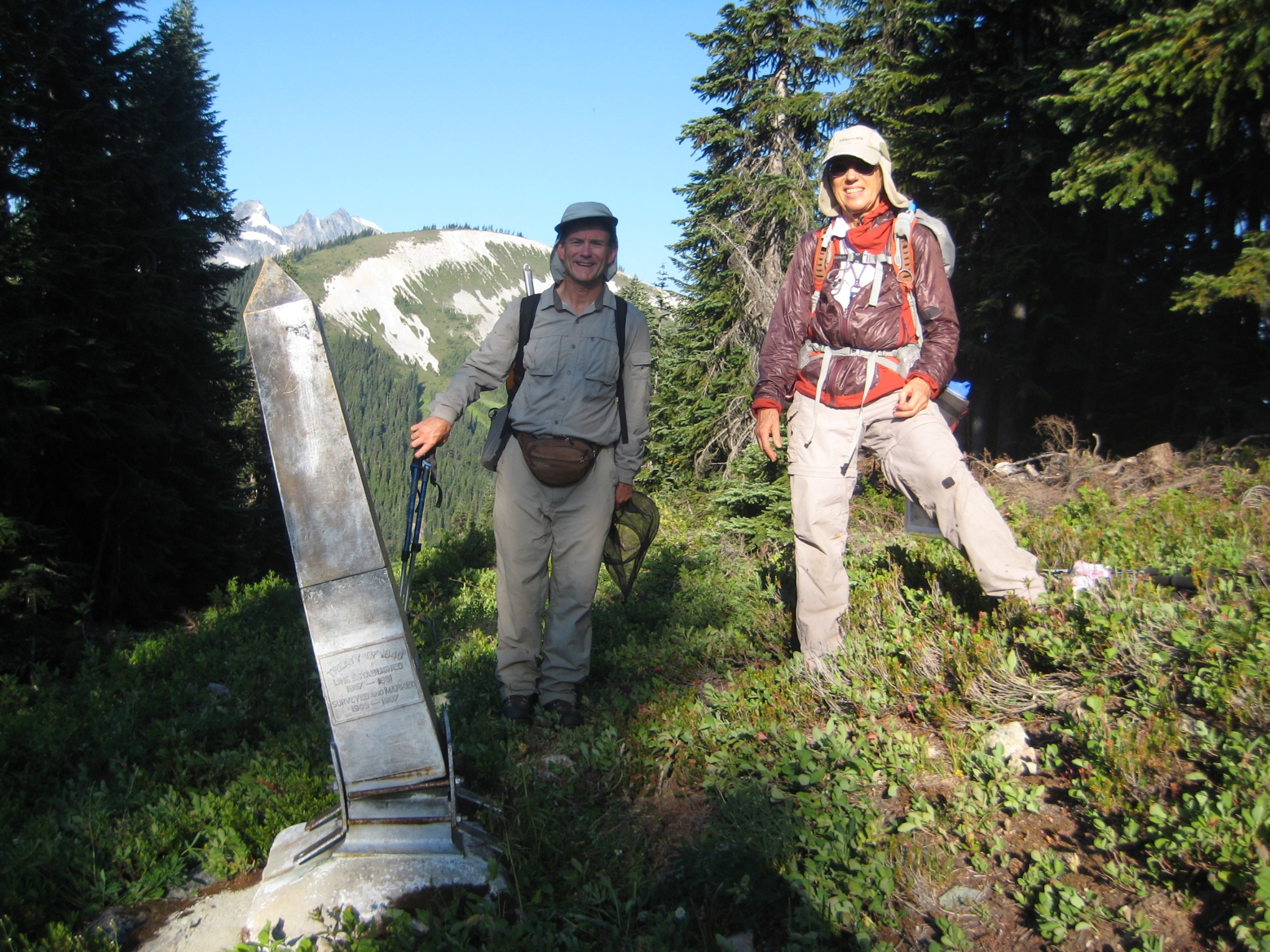 Getting off the summit and back to Monument 70 in the dark was made somewhat more interesting by the fact that both Fay’s and Mike’s GPS units suffered power failures. No matter; our IFR navigation quickly turned to nighttime VFR, and with the help of my trusty analog compass, we soon located the monument. From there, we were able to take advantage of a full moon illuminating the wide-open wildflower meadows. If not for the return of mosquito swarms, this would have been pure delight. We stumbled into camp at 9:30pm (6.0 hours from summit).