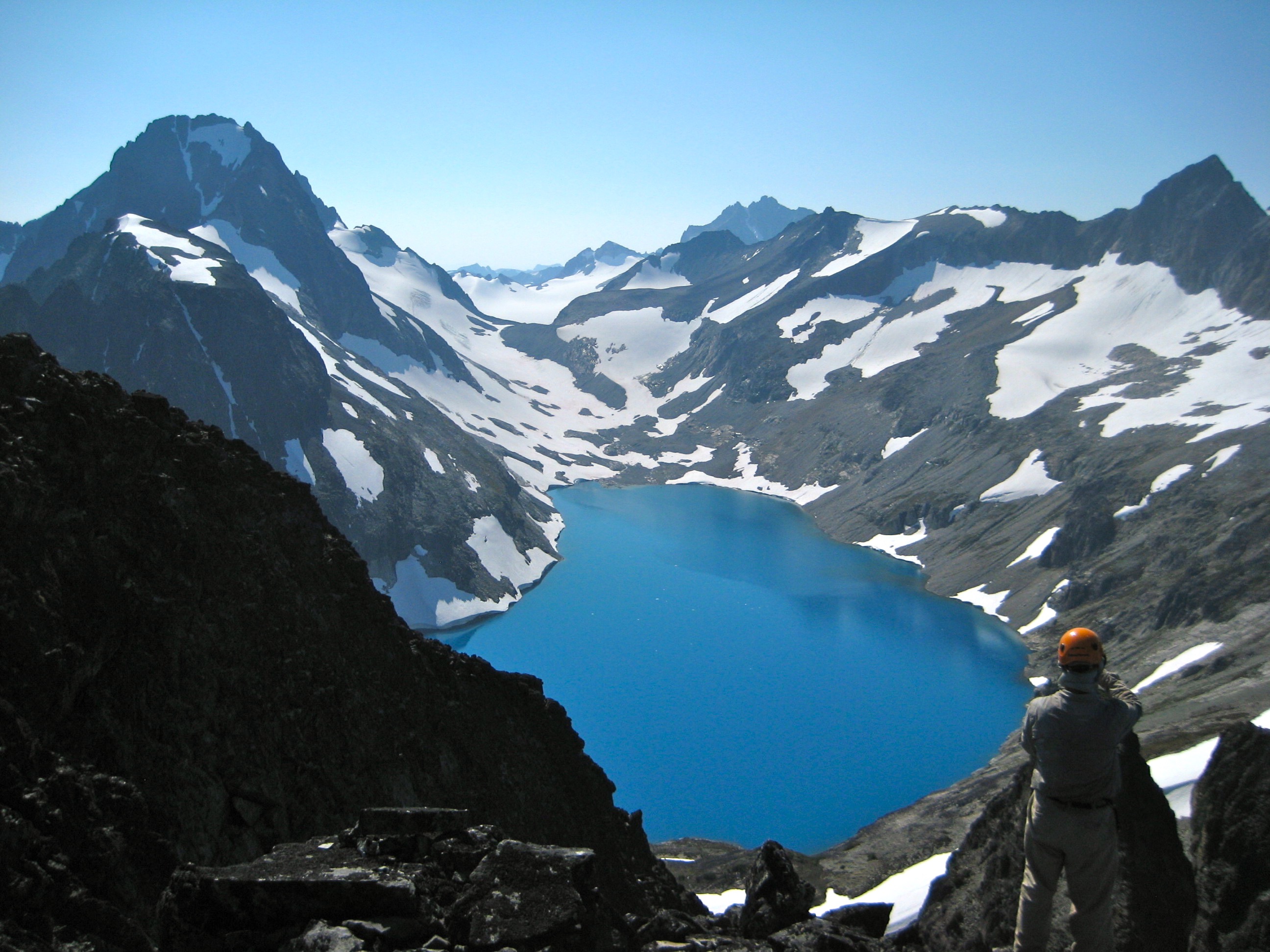 We reached the seldom-visited summit at 2:30pm (6.8 hours from camp). Mt. Spickard and Custer Ridge rise above the summit and form a ring around the unearthly blue water of Silver Lake. Perhaps more than any other summit scene that I can recall, this one seems like a painting. The total absence of mosquitoes here made for a truly enjoyable visit.