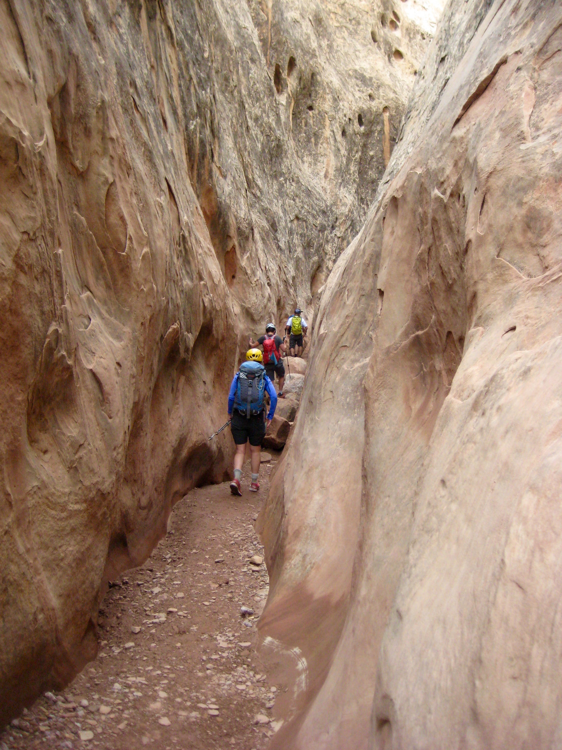 After moving our camp from Goblin Valley State Park to a nearby informal campsite on BLM property, Kevin, Lisa, Dwayne, Eileen, and I headed out for an afternoon of canyoneering in the San Rafael Swell. The “Swell” is what locals call a broad geologic anticline (ridge or dome) that was pushed up here and later breached by erosion.