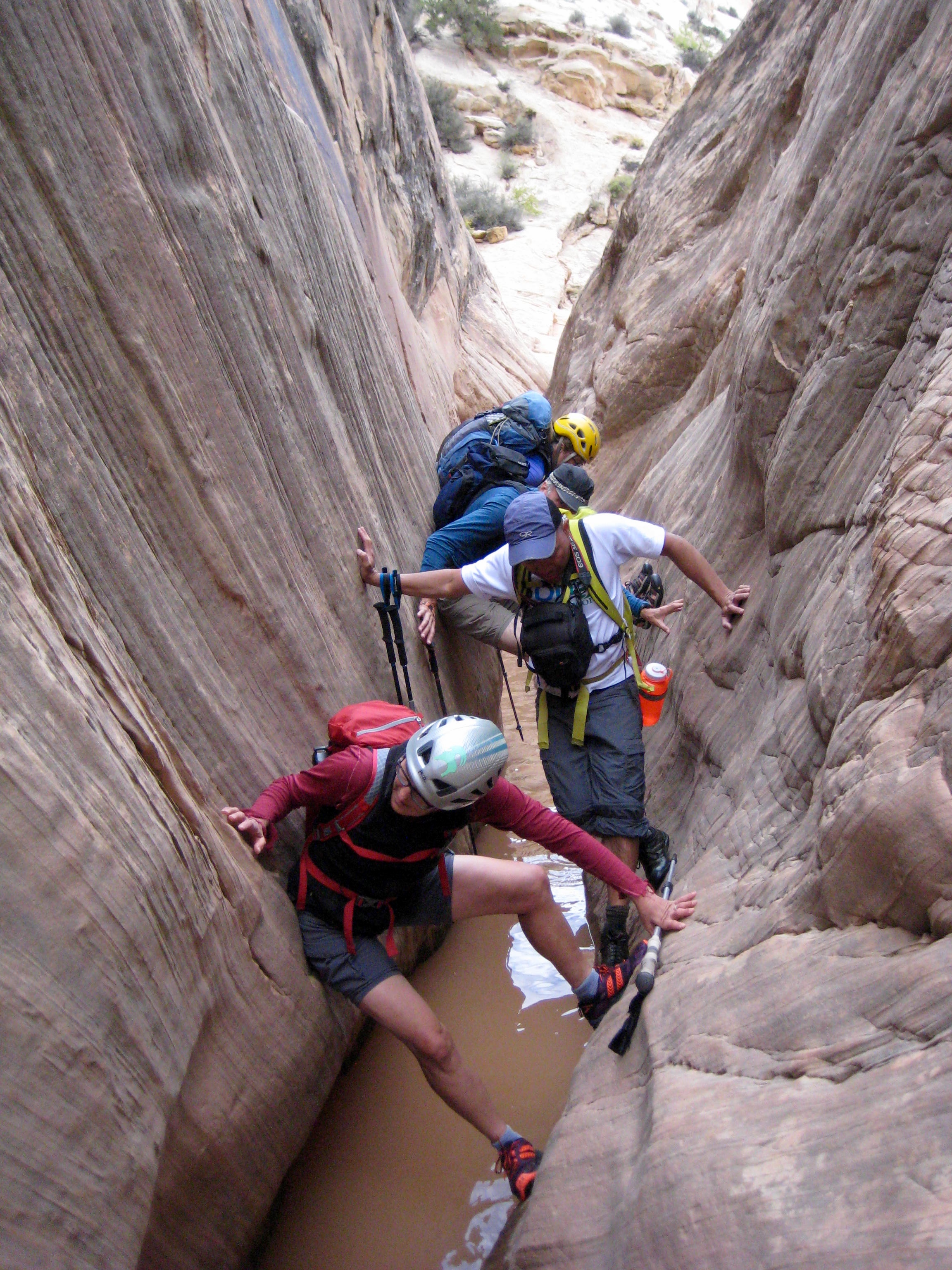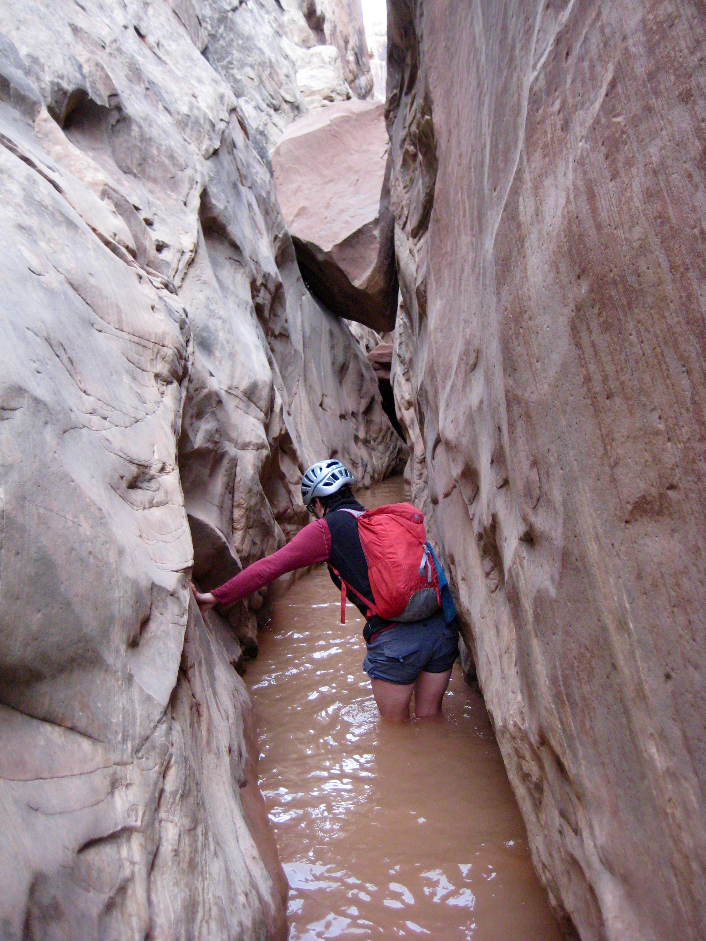 Gradually, the slot canyon grew very narrow and filled with water. We rolled up our cuffs and waded in.