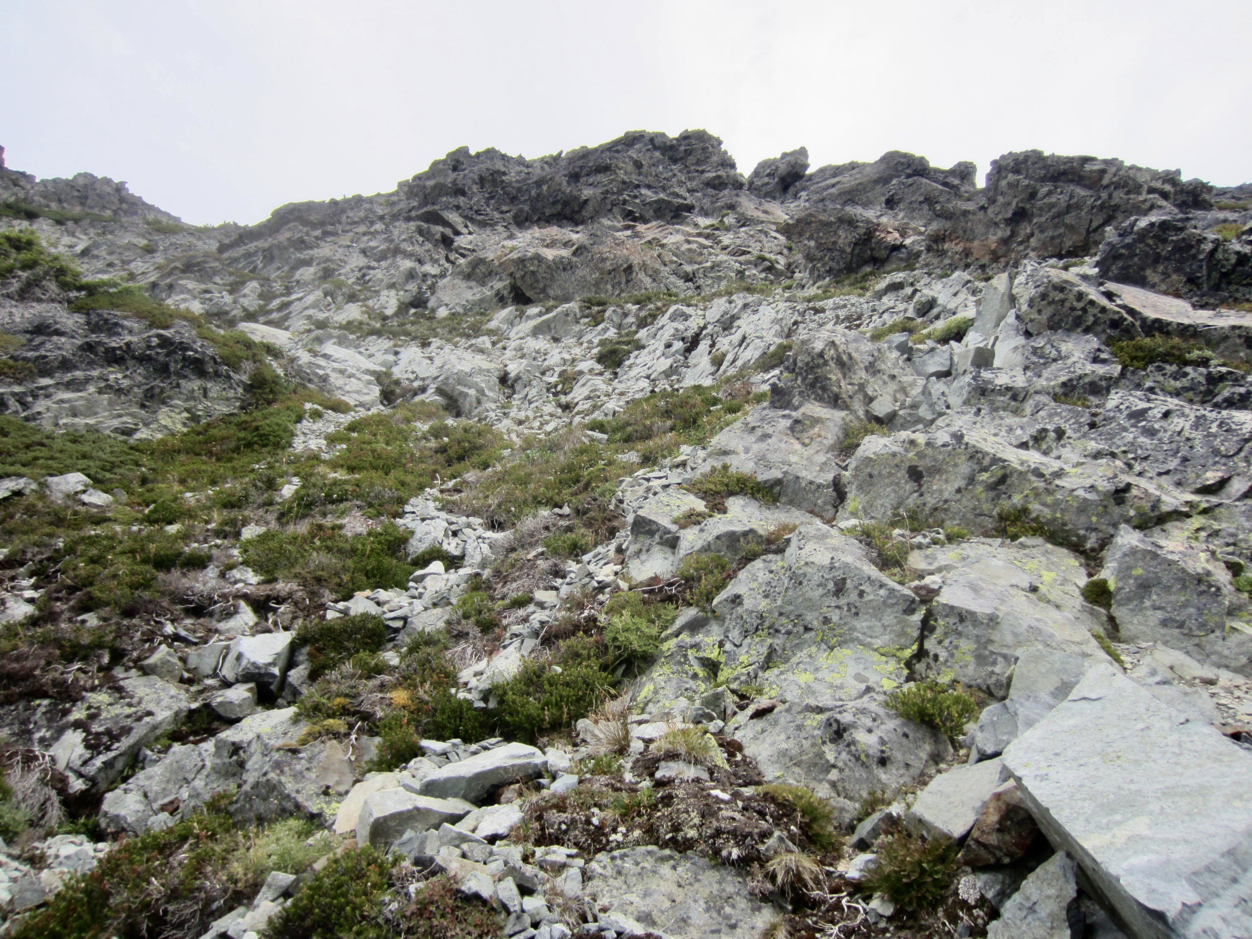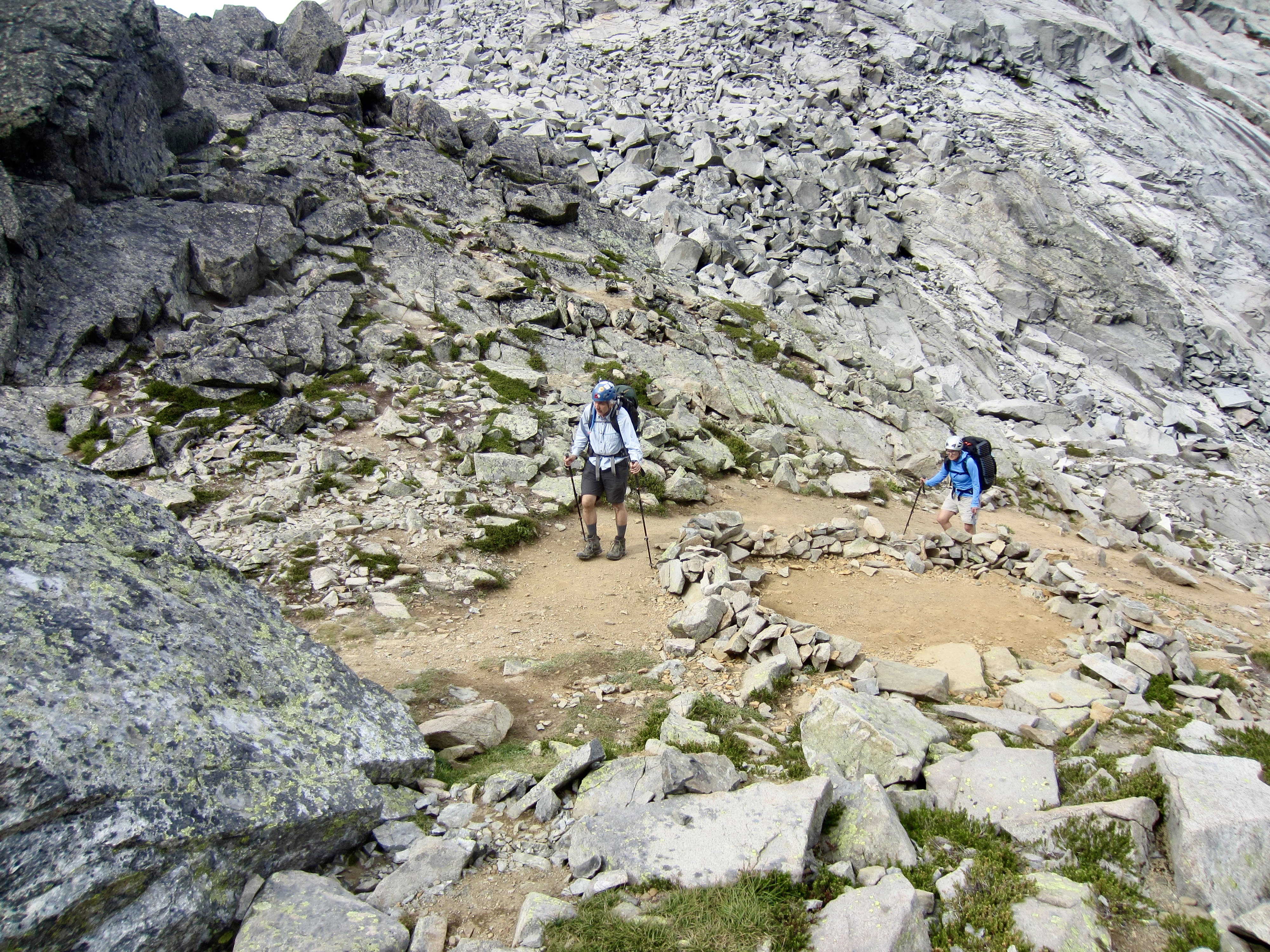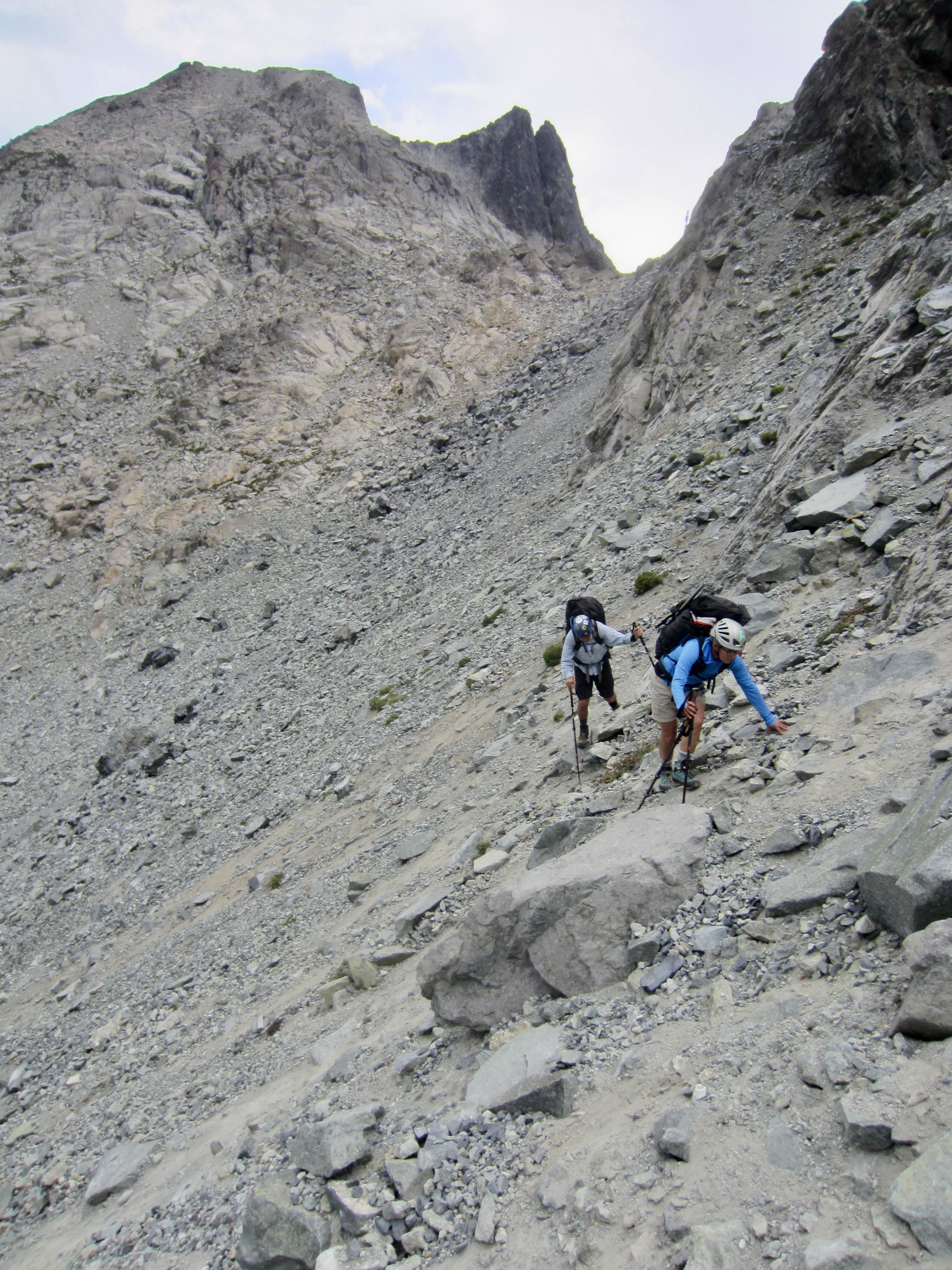 During previous treks over Dip Top Gap, I had been able to boot down and across large patches of snow. Today, we were left with only steep, barren slopes of scree, talus, and dirt, perched above scary cliffs. It was truly unpleasant and treacherous terrain! Fortunately, the rainstorm was short-lived, so we at least had dry weather all afternoon.