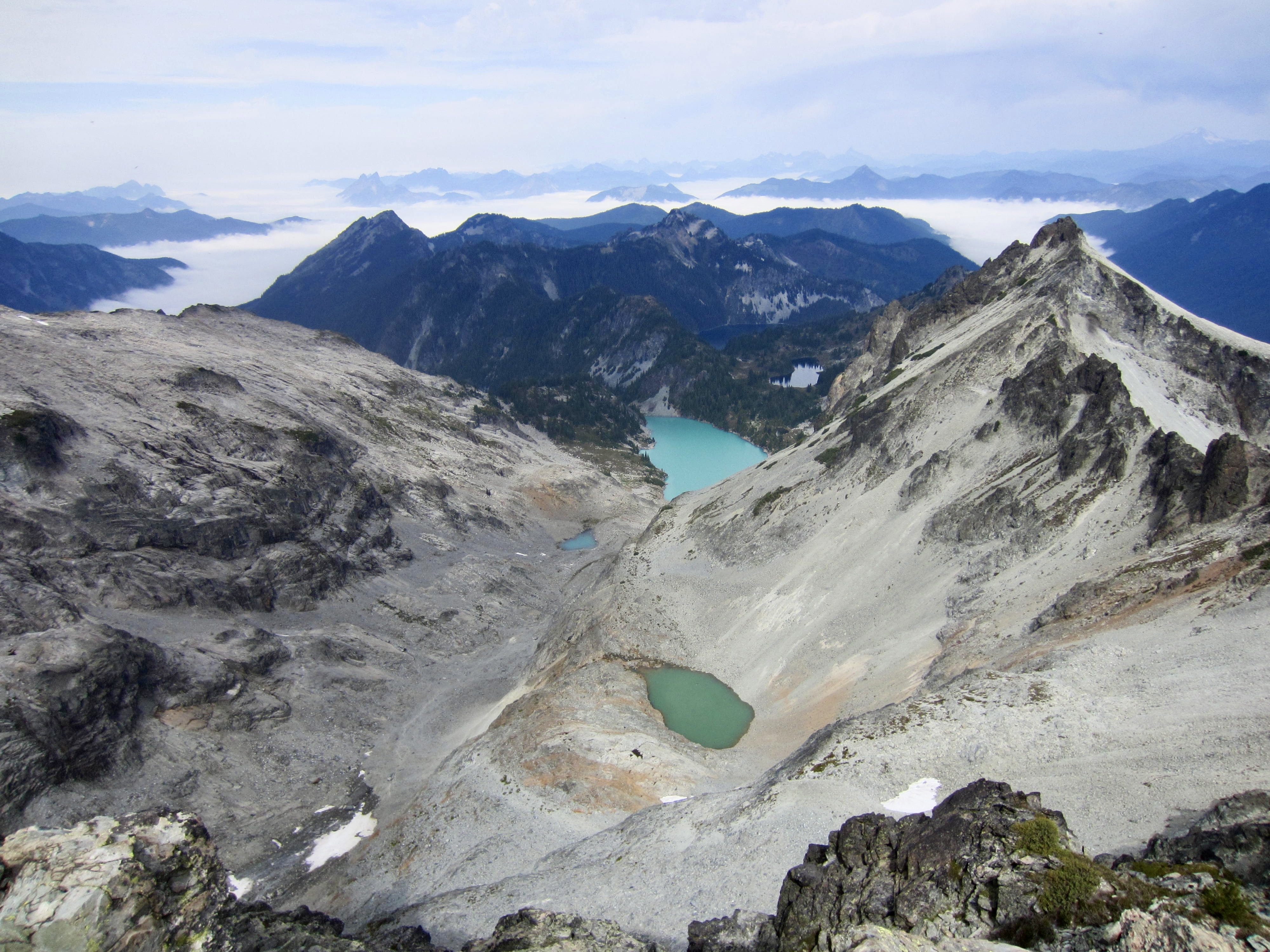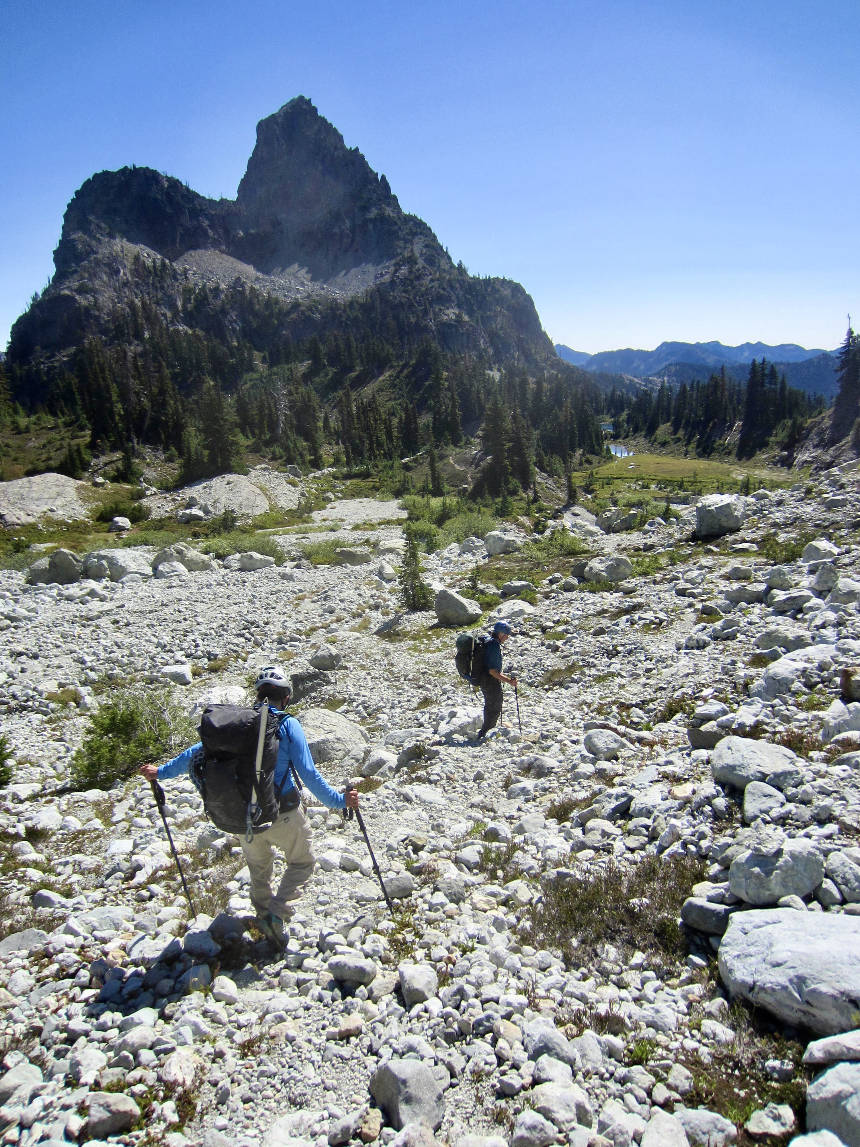 A final bit of snow and rock scrambling brought us to 6650-foot Dip Top Gap in mid-morning (2.6 hours + 1000 feet from Camp 1). We were instantly smacked in the face by a breathtaking view of Mt. Daniel, with its multiple summit horns piercing the sky, and the Lynch Glacier spilling into Pea Soup Lake. This was my fourth visit to the gap, and it still delivered a feeling of WOW! There is a good reason why so many trekkers are willing to make the rugged ascent from Marmot Lake to Dip Top Gap every summer. Hardy trekkers who want an exceptionally memorable camping experience can take advantage of an established tent pad at the gap.