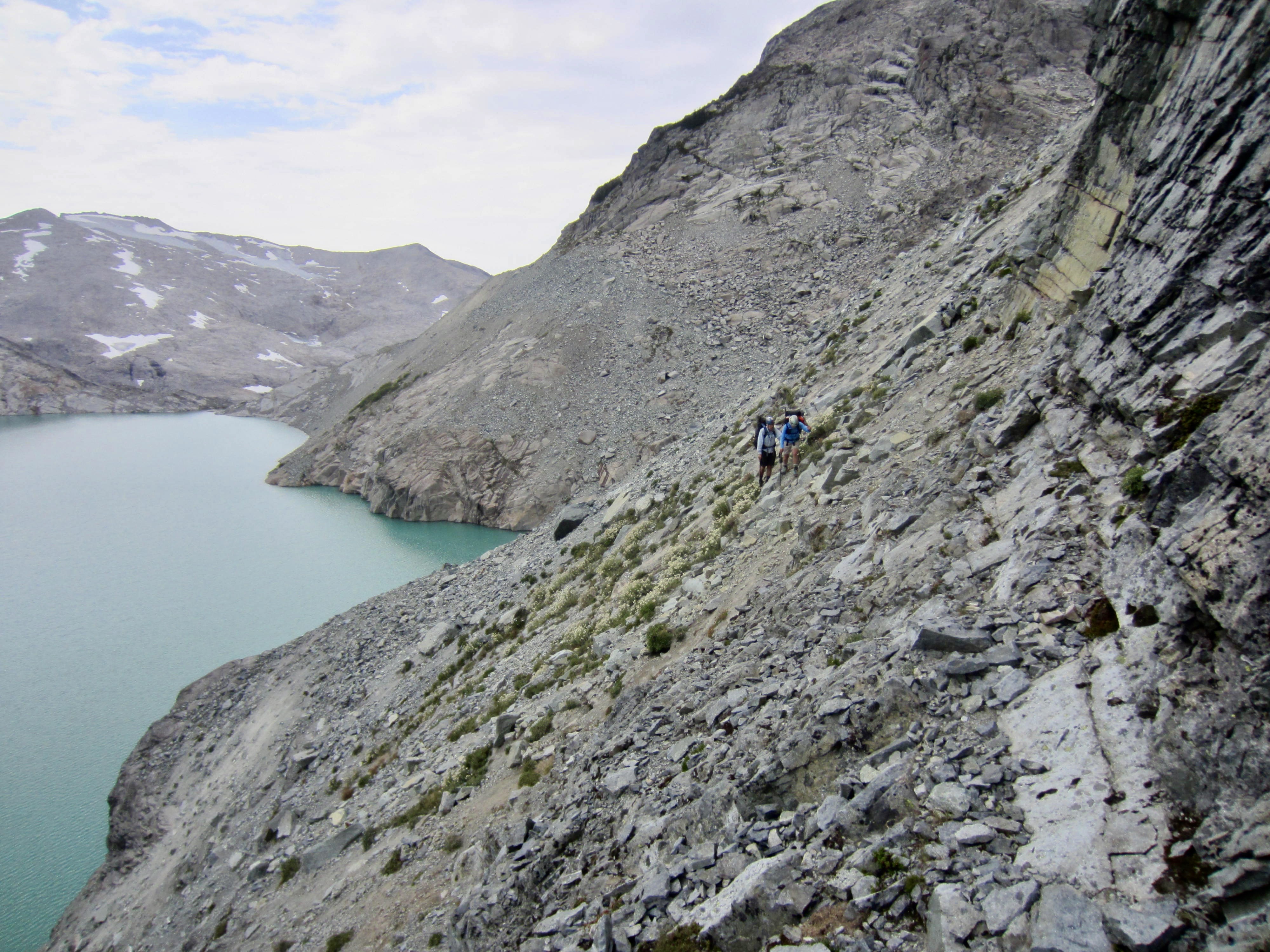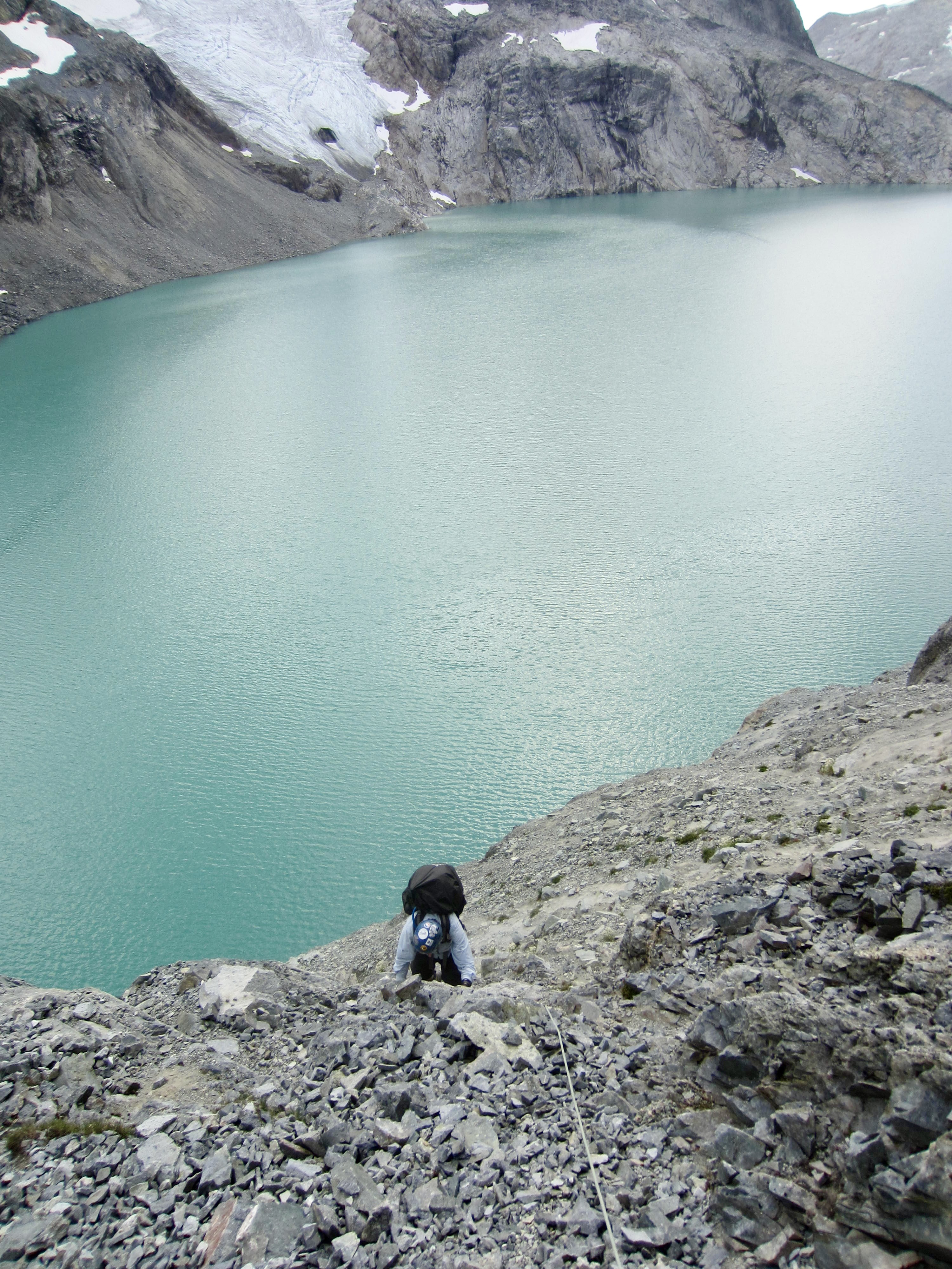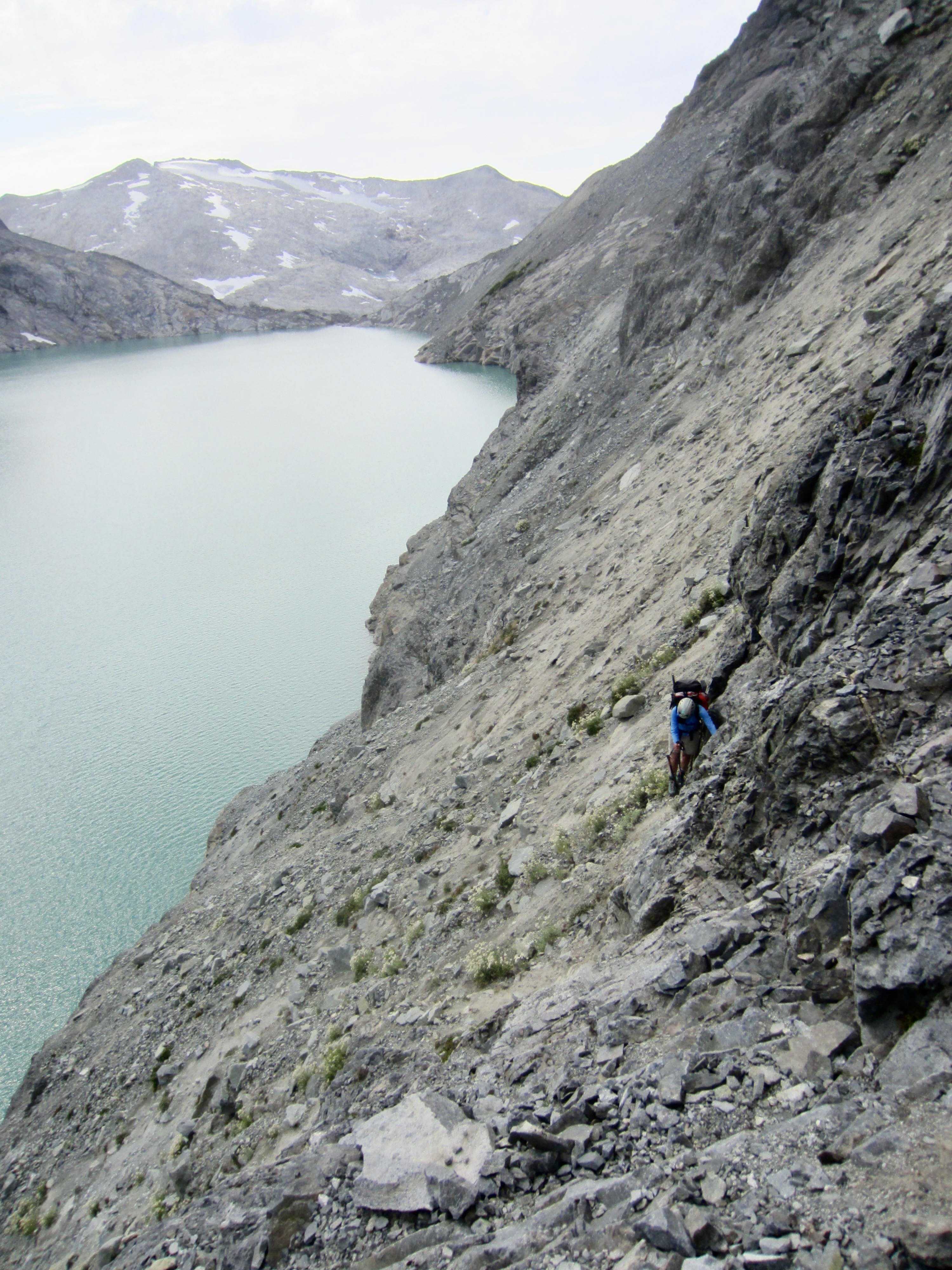 The most difficult part of our traverse occurred as we got closer to the eastern end of the lake, where a super-steep dirt slope squeezes between upper and lower sets of cliff bands on Lynch Peak’s southern flank. We hugged the base of the upper cliff band, desperately groping for handholds in the rock while trying to kick footholds in the hard dirt.