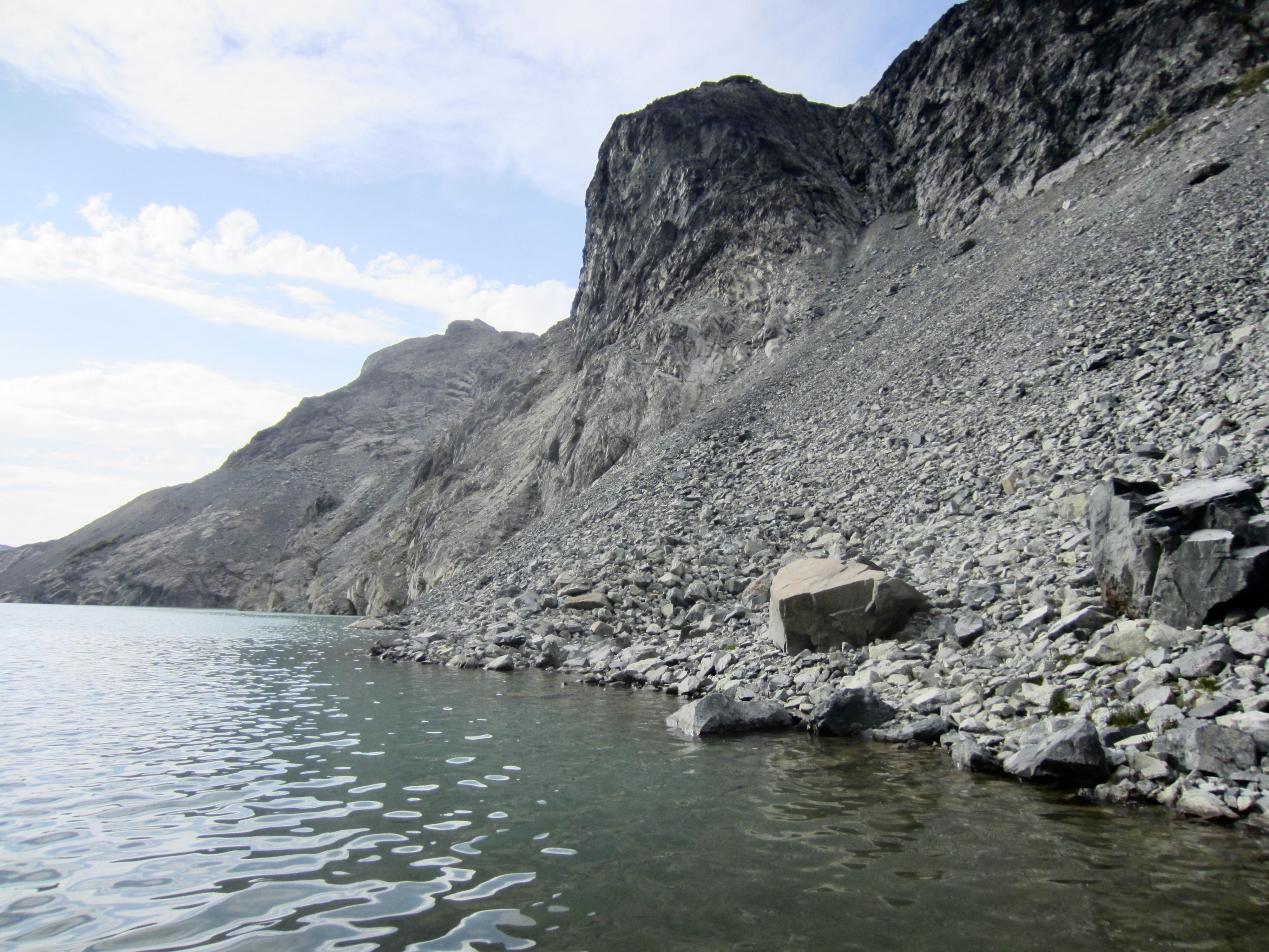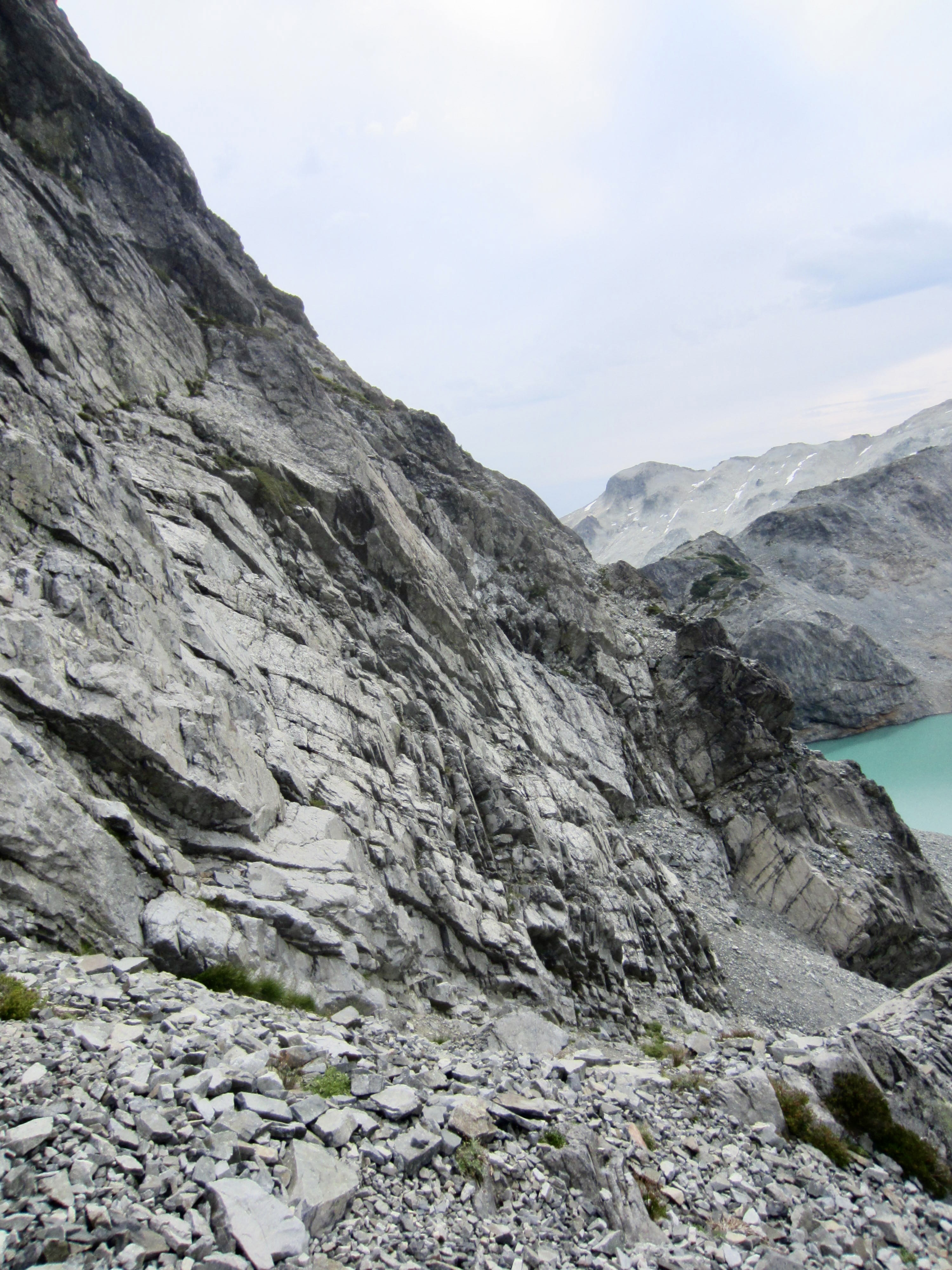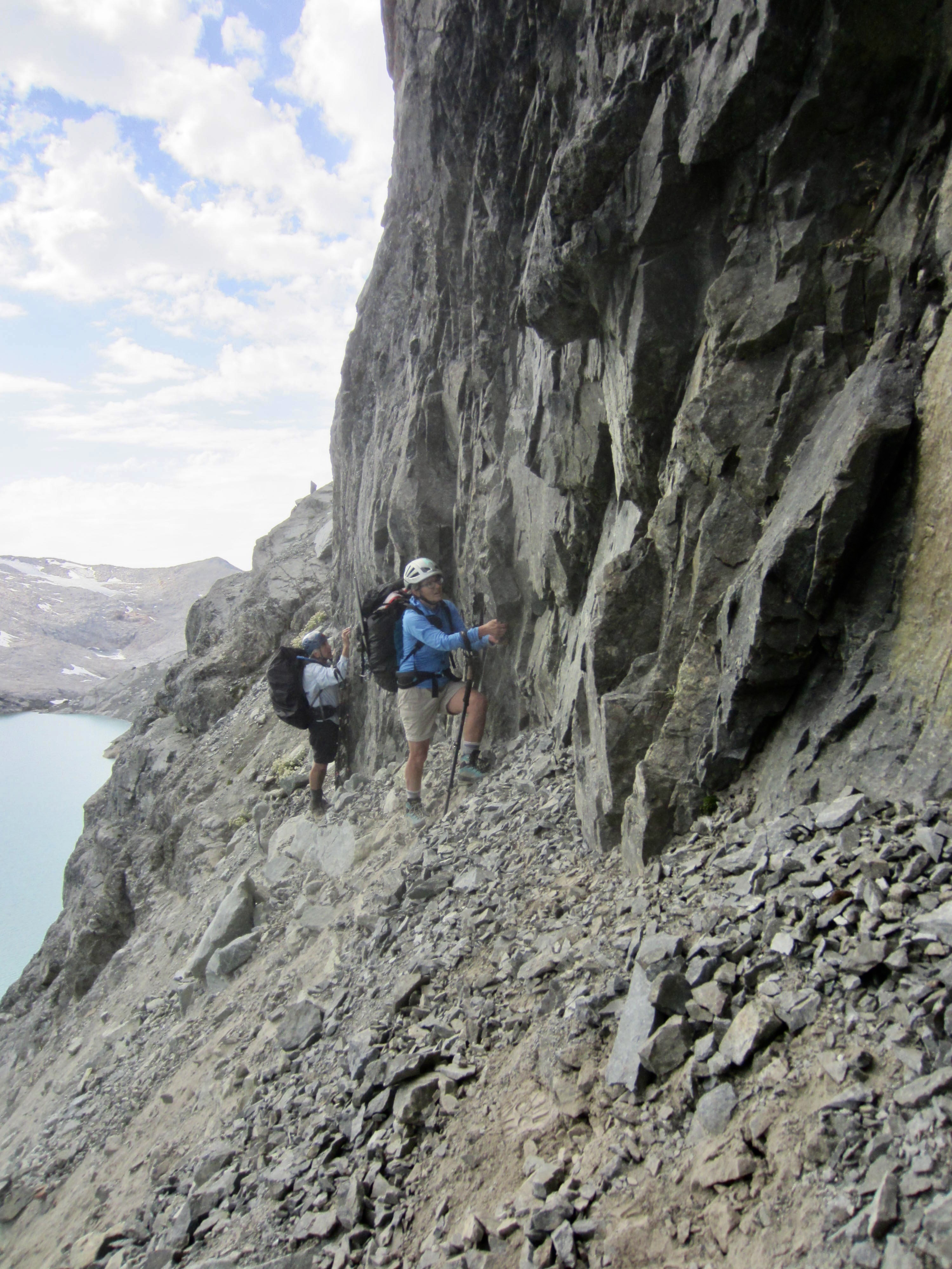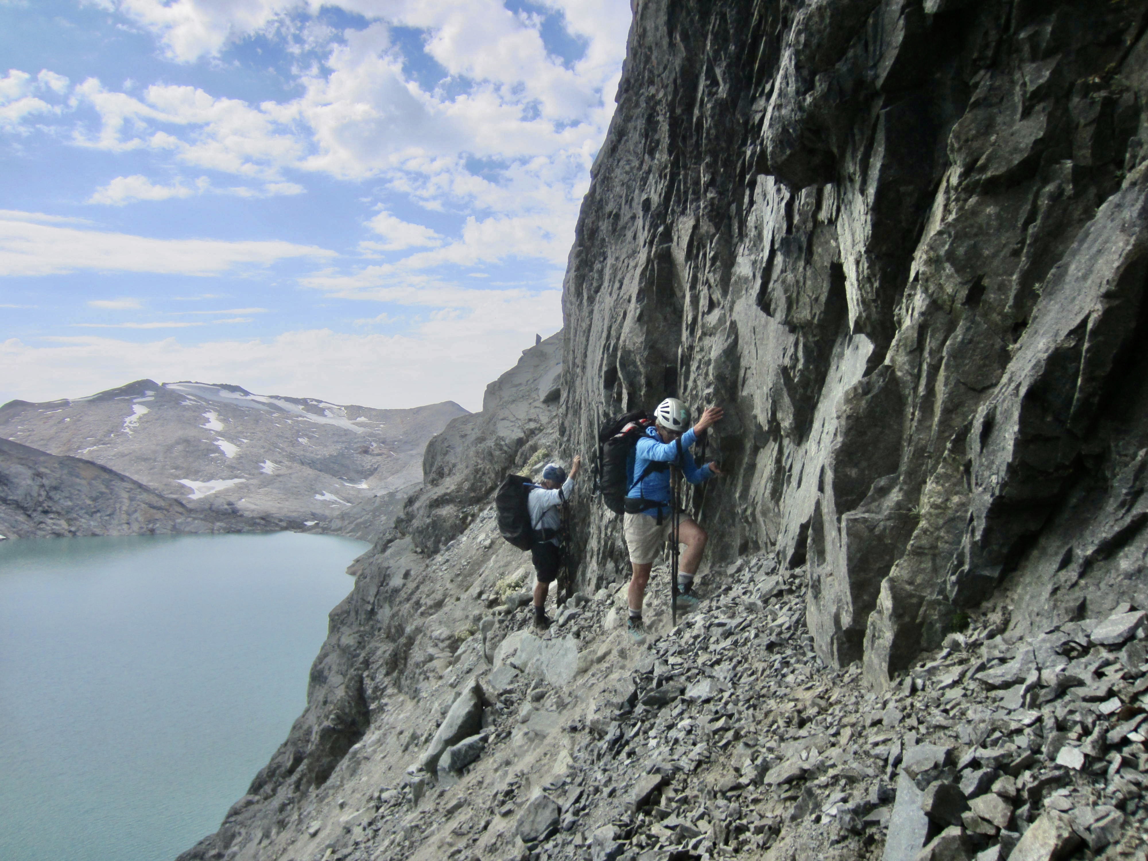 The most difficult part of our traverse occurred as we got closer to the eastern end of the lake, where a super-steep dirt slope squeezes between upper and lower sets of cliff bands on Lynch Peak’s southern flank. We hugged the base of the upper cliff band, desperately groping for handholds in the rock while trying to kick footholds in the hard dirt.
