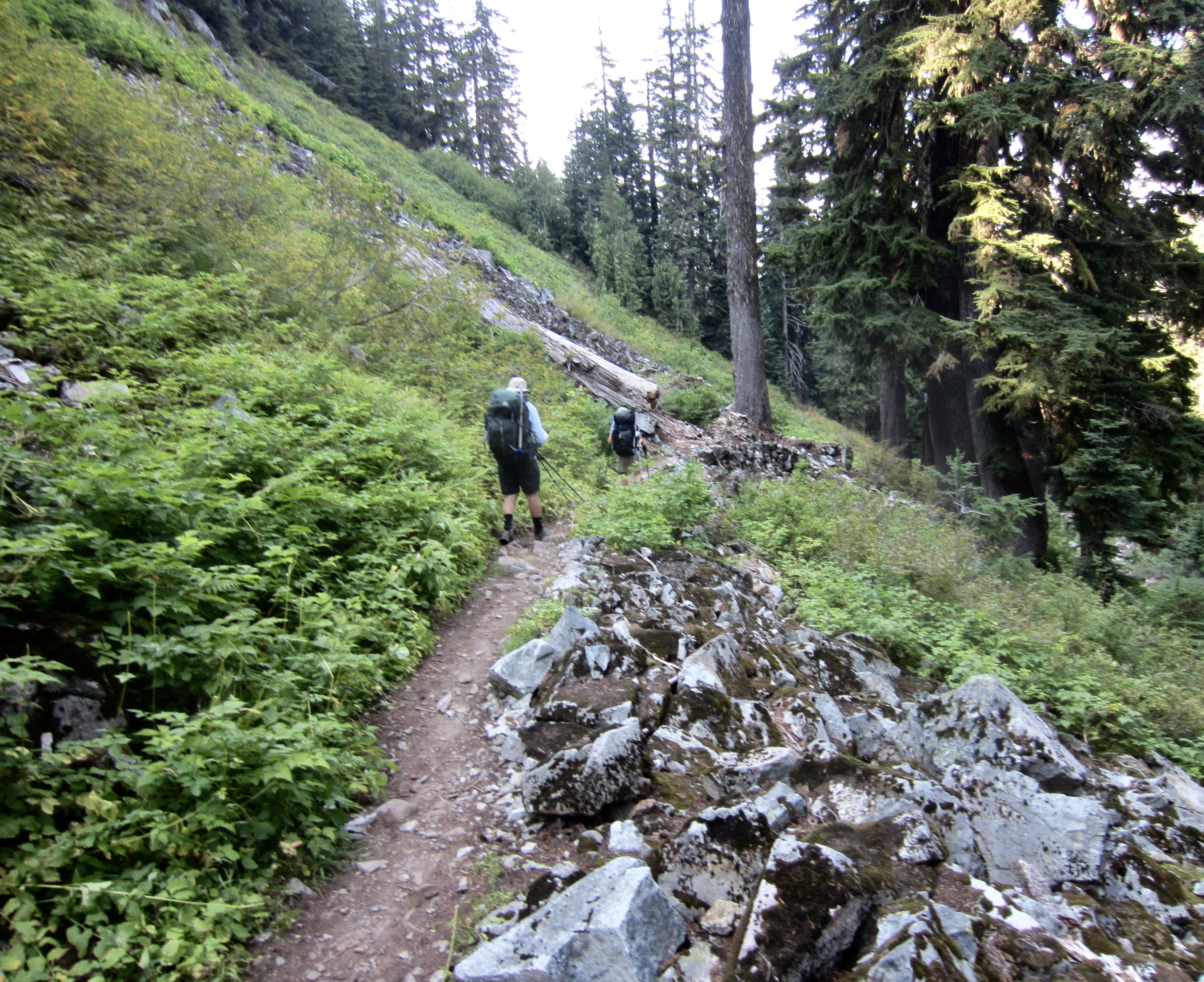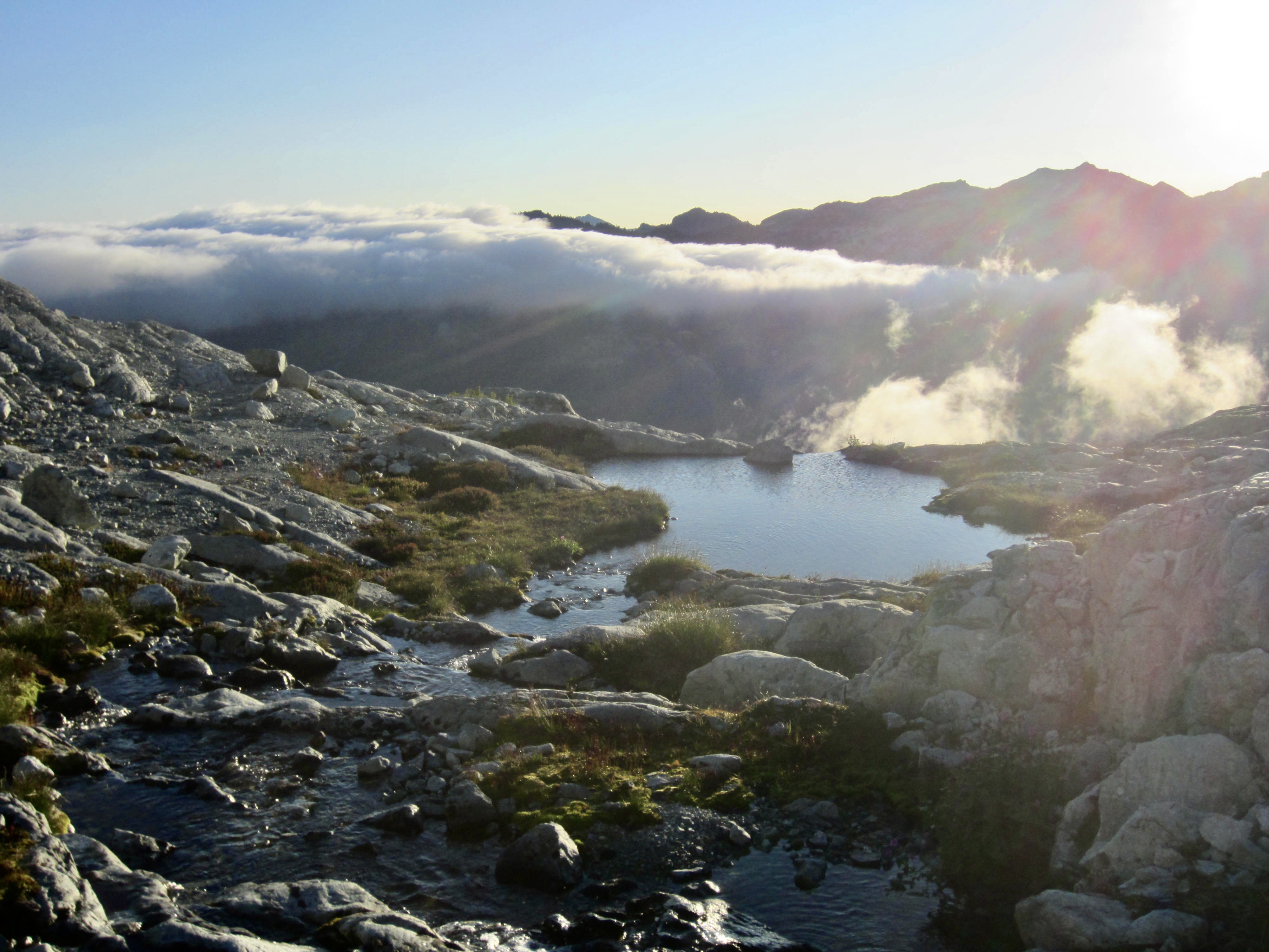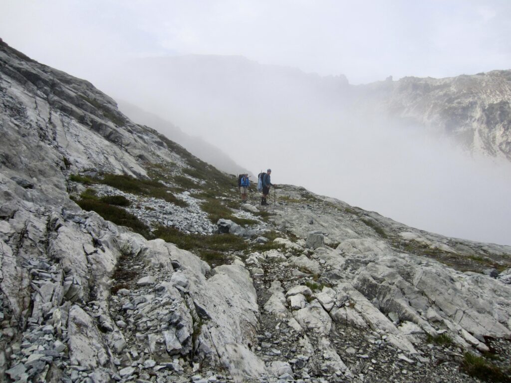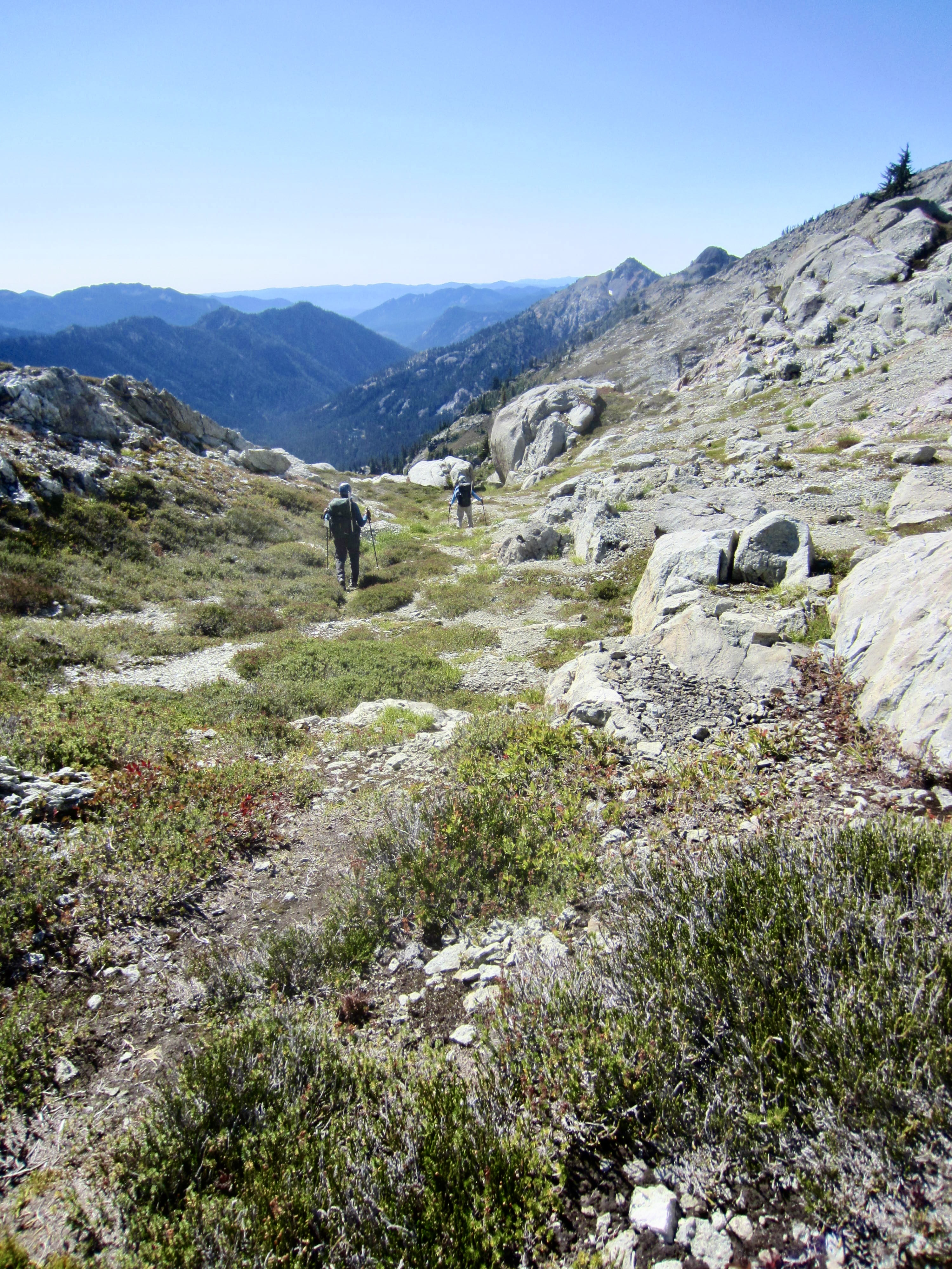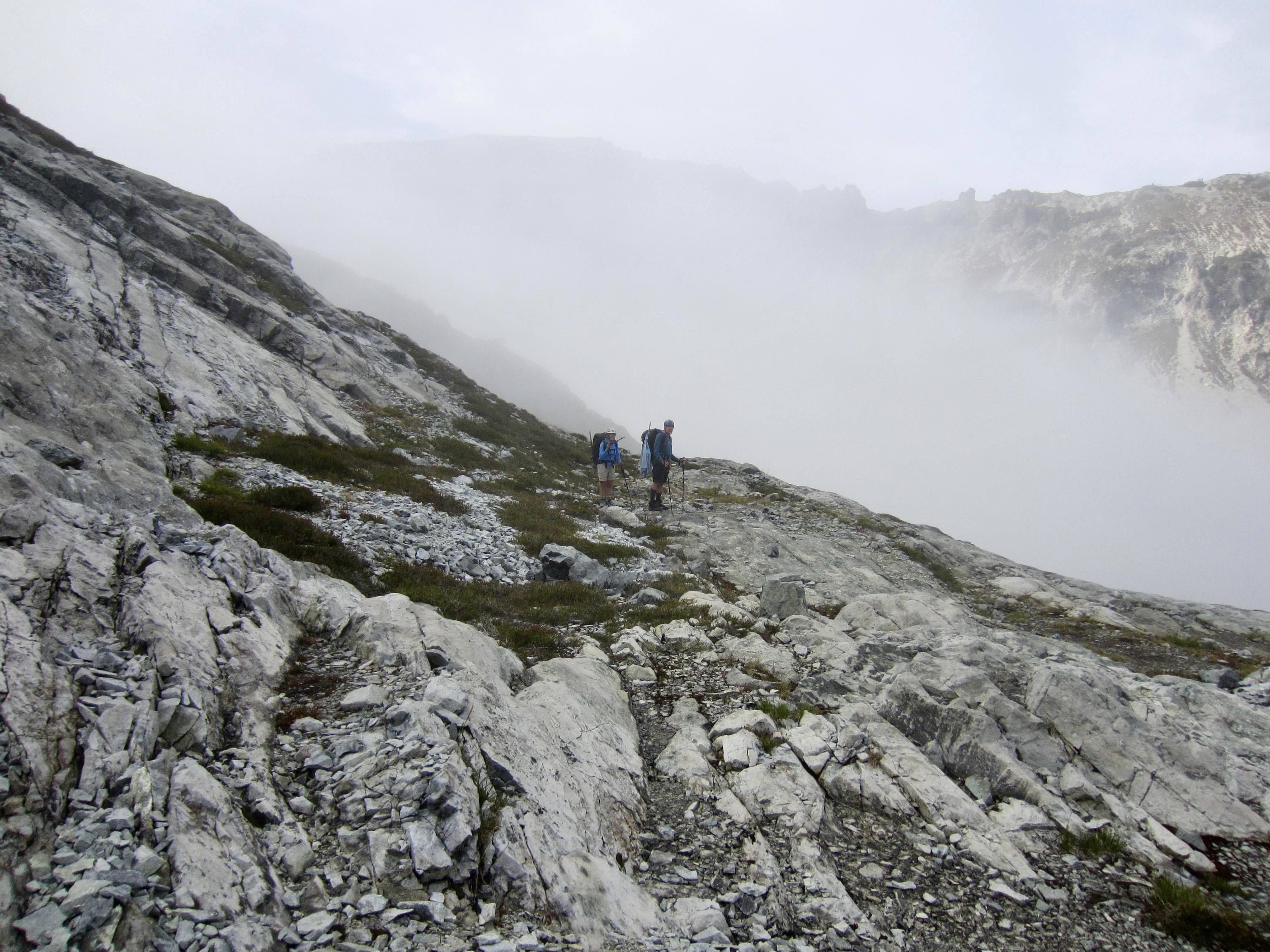 As we sat on the lakeshore, filtering water and snacking, an ominous fog crept over the western end of the lake. This did not bode well for our navigation around Mt. Daniel. We shouldered backpacks and began contouring southward along Daniel’s northeastern ridge, leaving the fog behind. A continuous chain of heather benches at 6400 feet provided a most welcome change from our previous terrain.