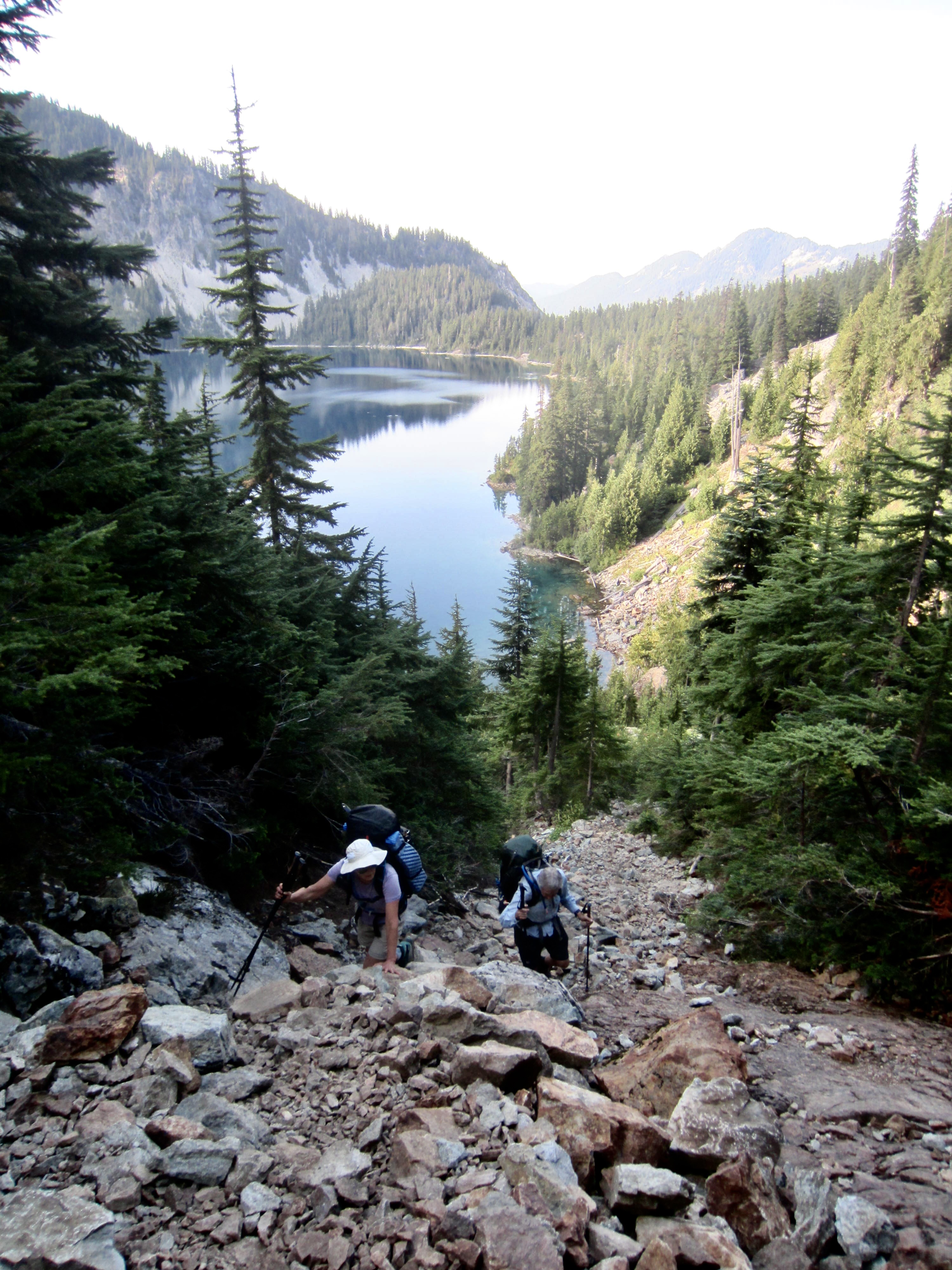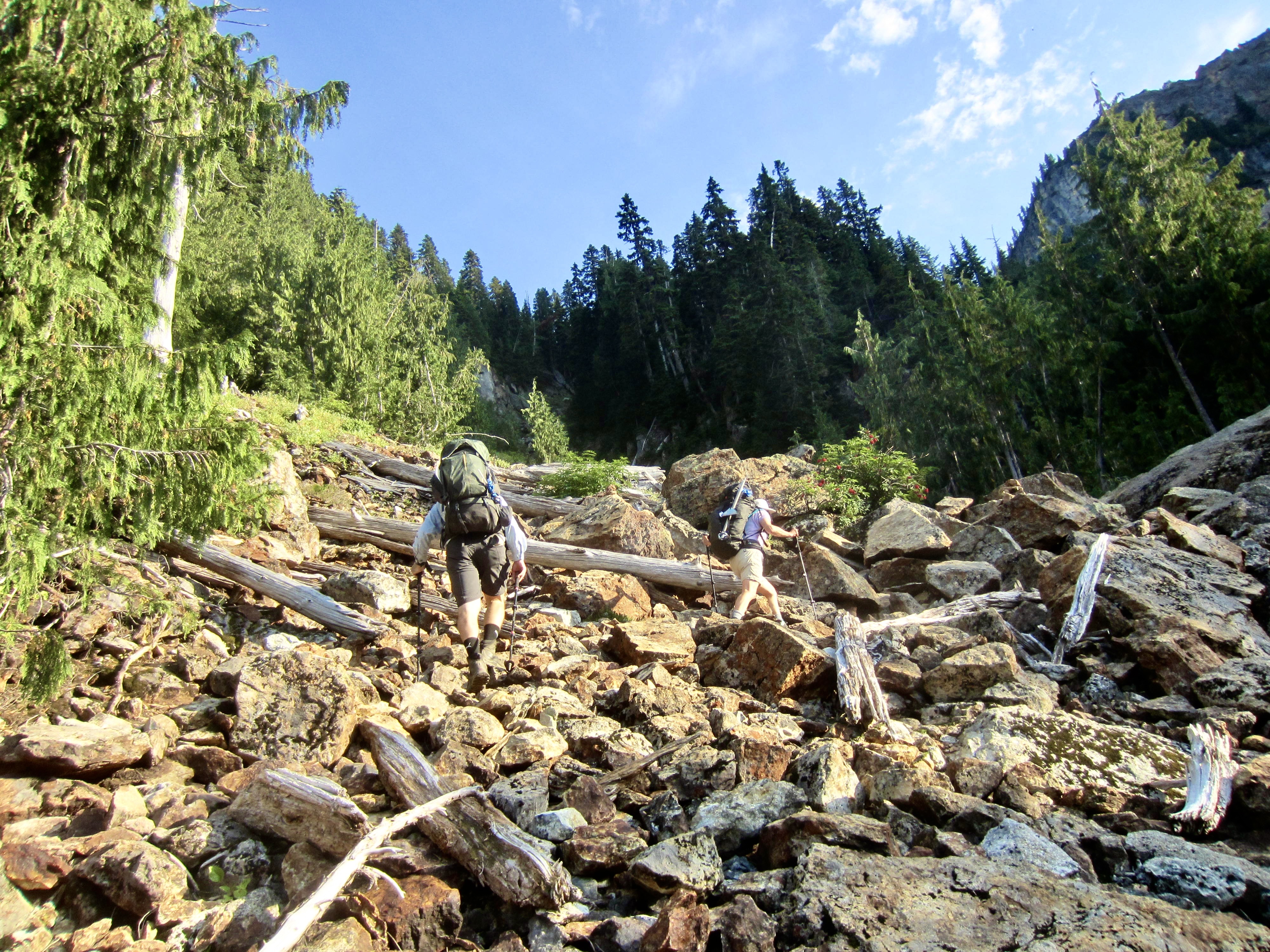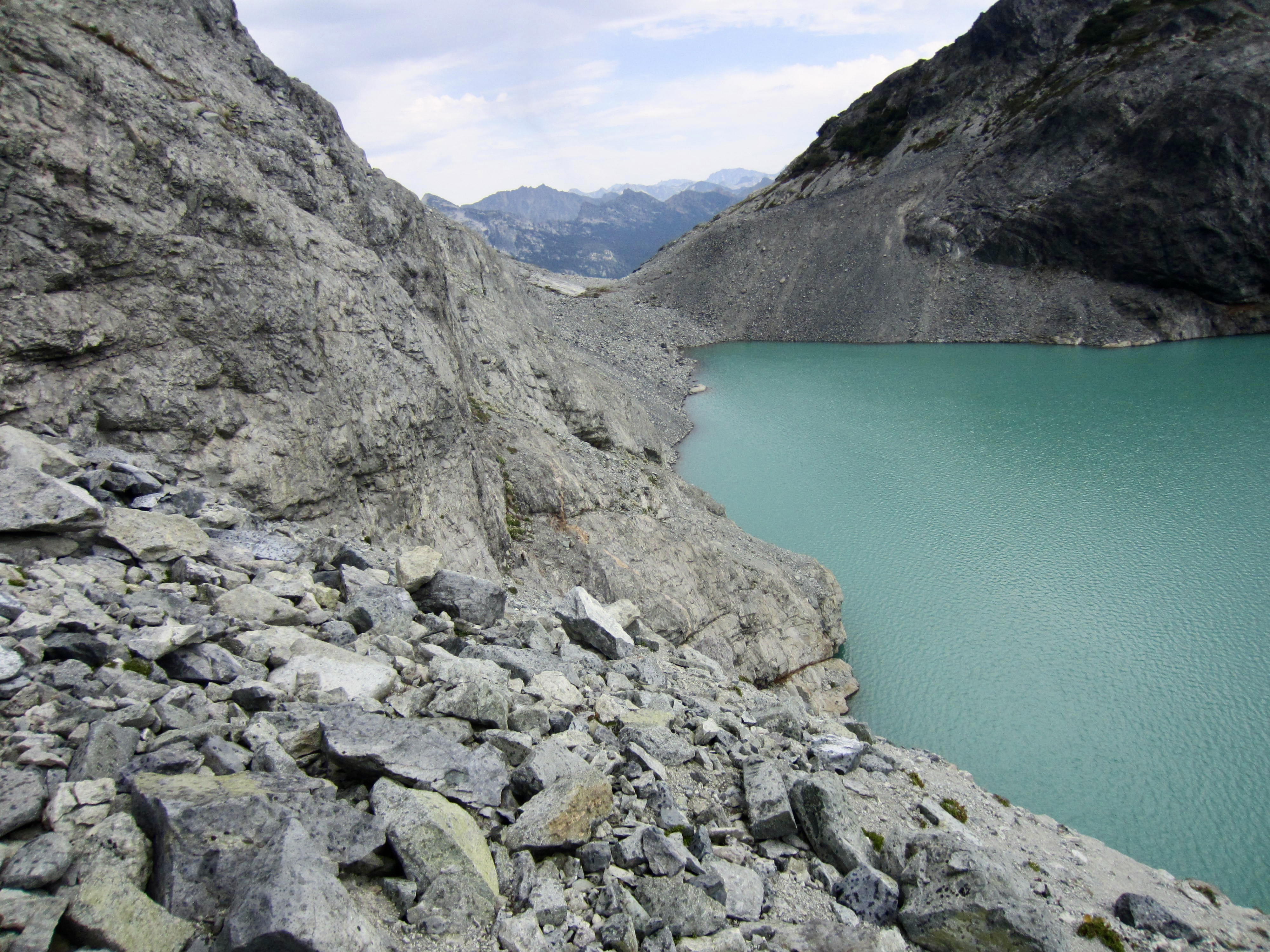 We awoke to mostly clear skies, but there was a chance of thunderstorms in the weather forecast. Would our luck hold out? Andrew hoped to climb Mt. Daniel today, so he sped out of camp and up Dip Top Couloir, leaving Lisa, Kevin, and me to ascend at a more relaxed pace. We followed a crude trekking path around the lake, down to the inlet delta, and then up the rocky couloir.