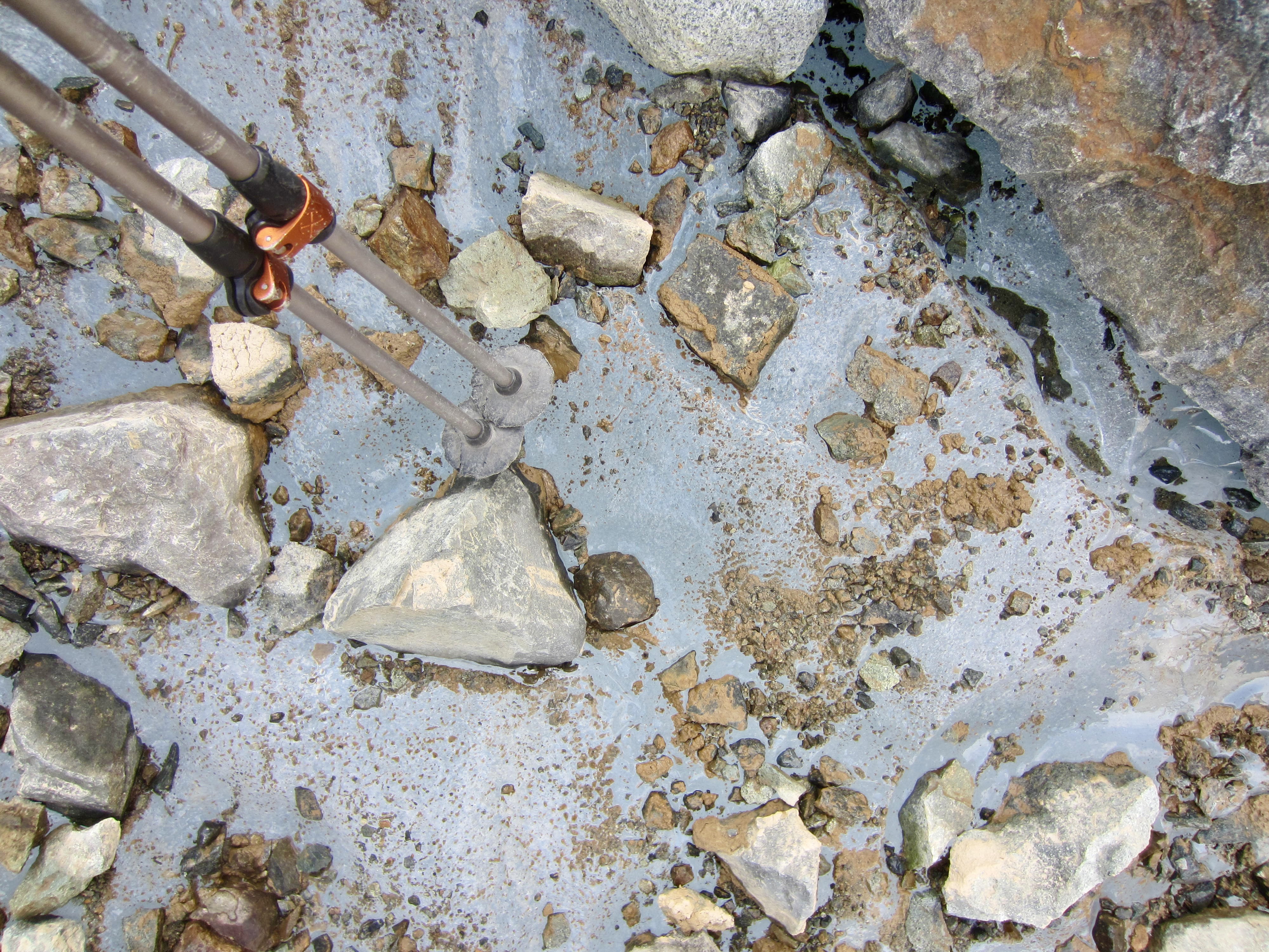 Numerous stone ducks and cairns mark the path through the lower and middle parts of the couloir. Farther up, we encountered the remnant icefield and began working around its left edge. Because the adjacent boulders (a combination of talus and morainal debris) were frighteningly unstable, we found it better to walk on the ice margin. Close inspection revealed that the icefield consists of crystal-clear ice embedded with angular rocks—much like an “ice breccia.” Our chosen route succeeded, but in retrospect, it would have been even safer and faster to crampon directly up the center of the icefield (Andrew wisely took this approach on his climb).