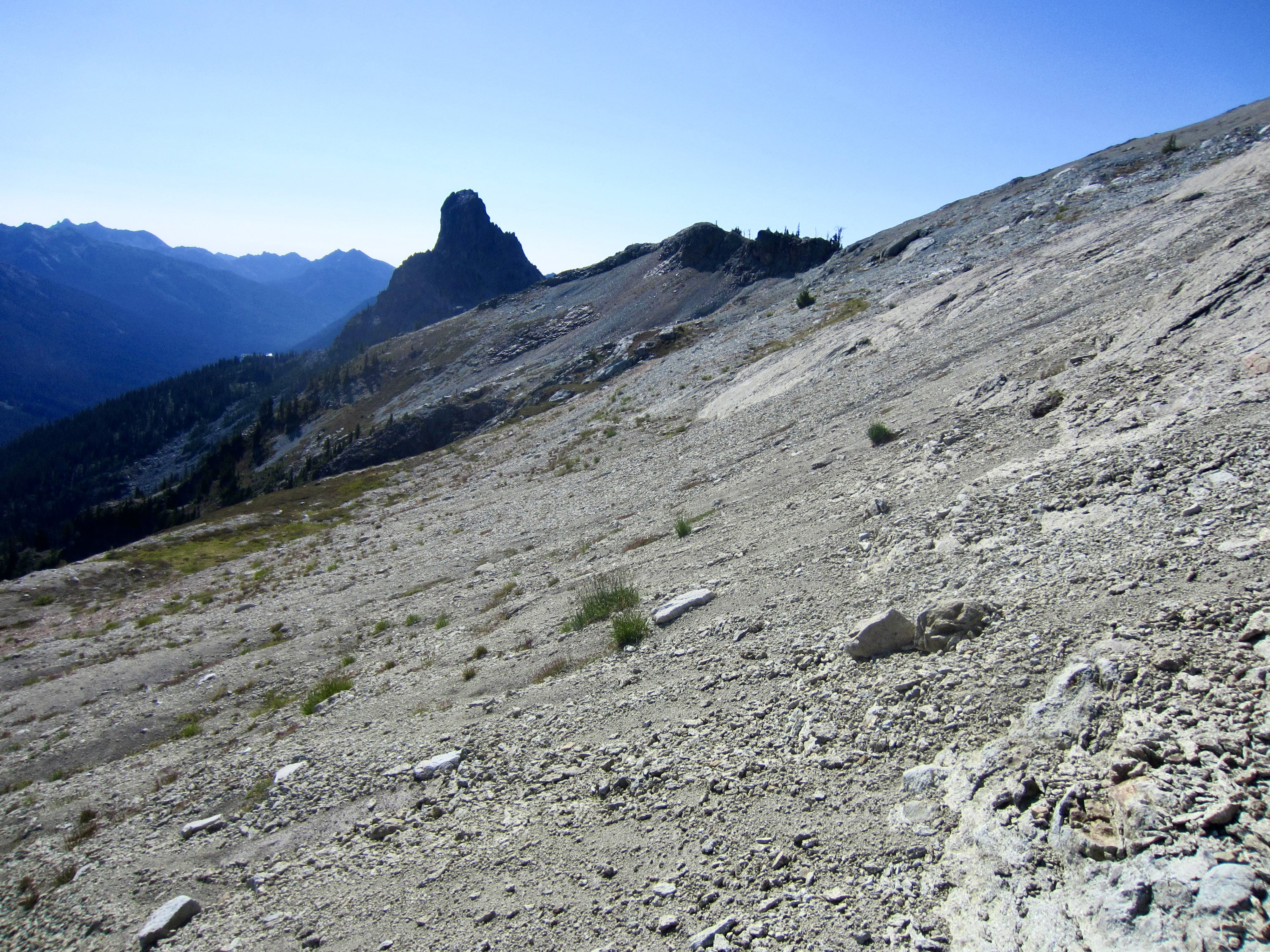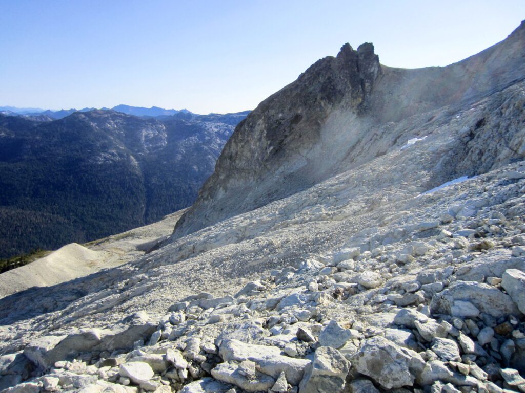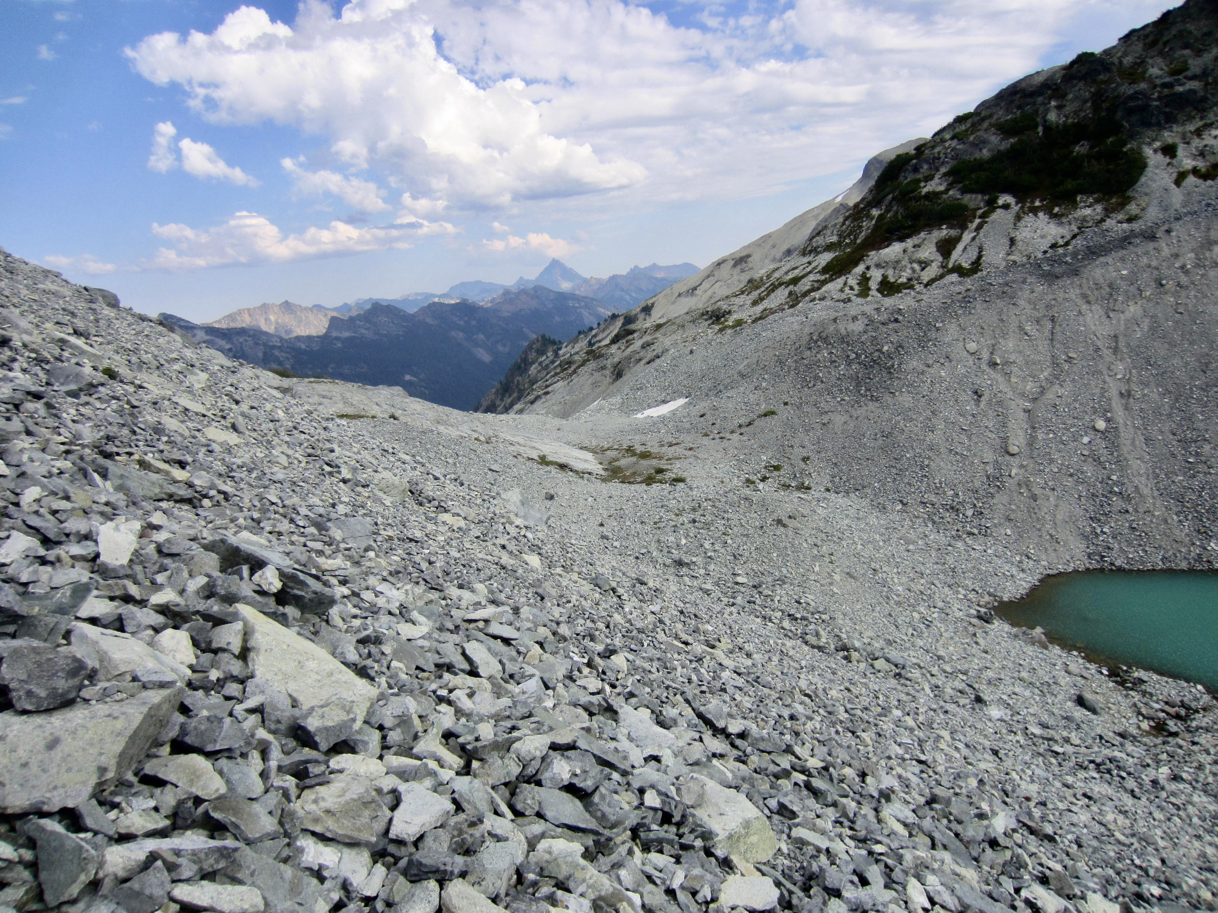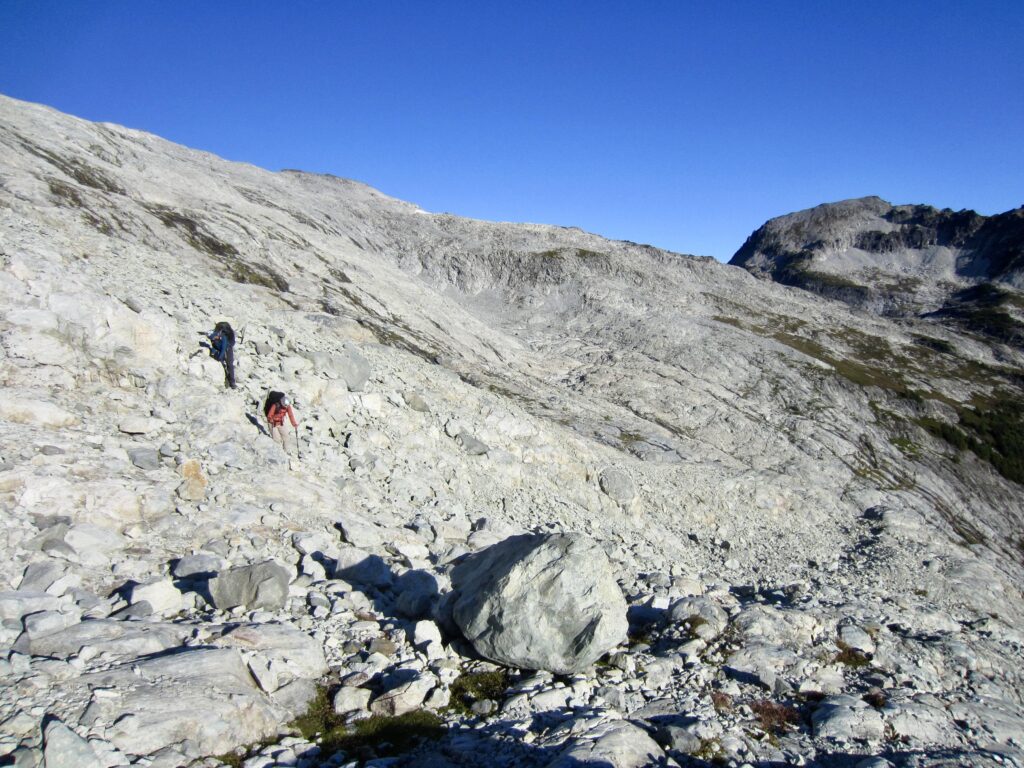 Once across the rock rib, we finally put the treacherous terrain behind us and had only to cross a broad slope of talus and scree in order to reach Pea Soup Pass. This didn’t necessarily equate to an easy crossing, however; the unstable slope tended to form small avalanches below our feet, and Lisa took a long ride atop a “screevalanche” at one point.