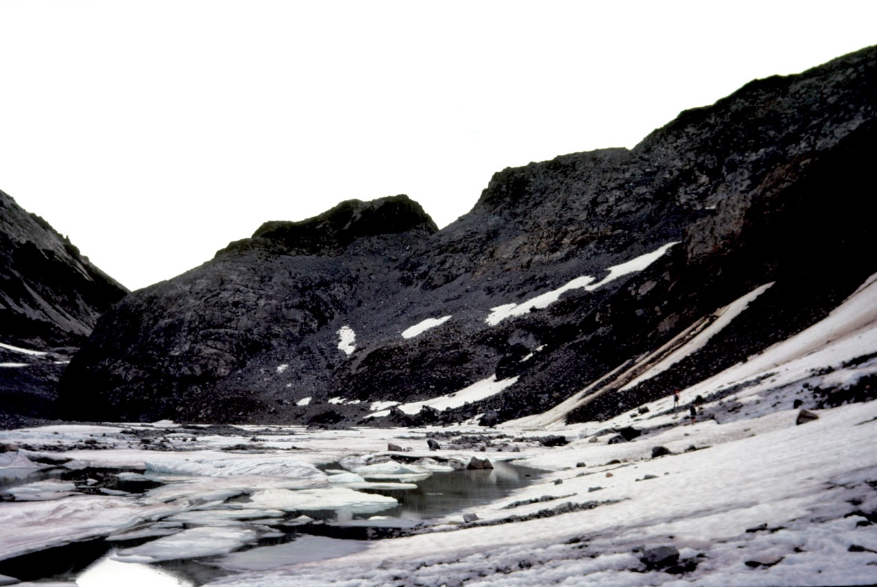 As a quick illustration of how the terrain has evolved over the past several decades, consider the three photos below. The left and middle photos show conditions on the northern side of Mt. Daniel in 1978 and 1984, respectively, whereas the right photo shows the conditions we encountered in 2024. You can see that the Lynch Glacier has shrunk dramatically, and Pea Soup Lake has lost both its ice floes and its characteristic color.