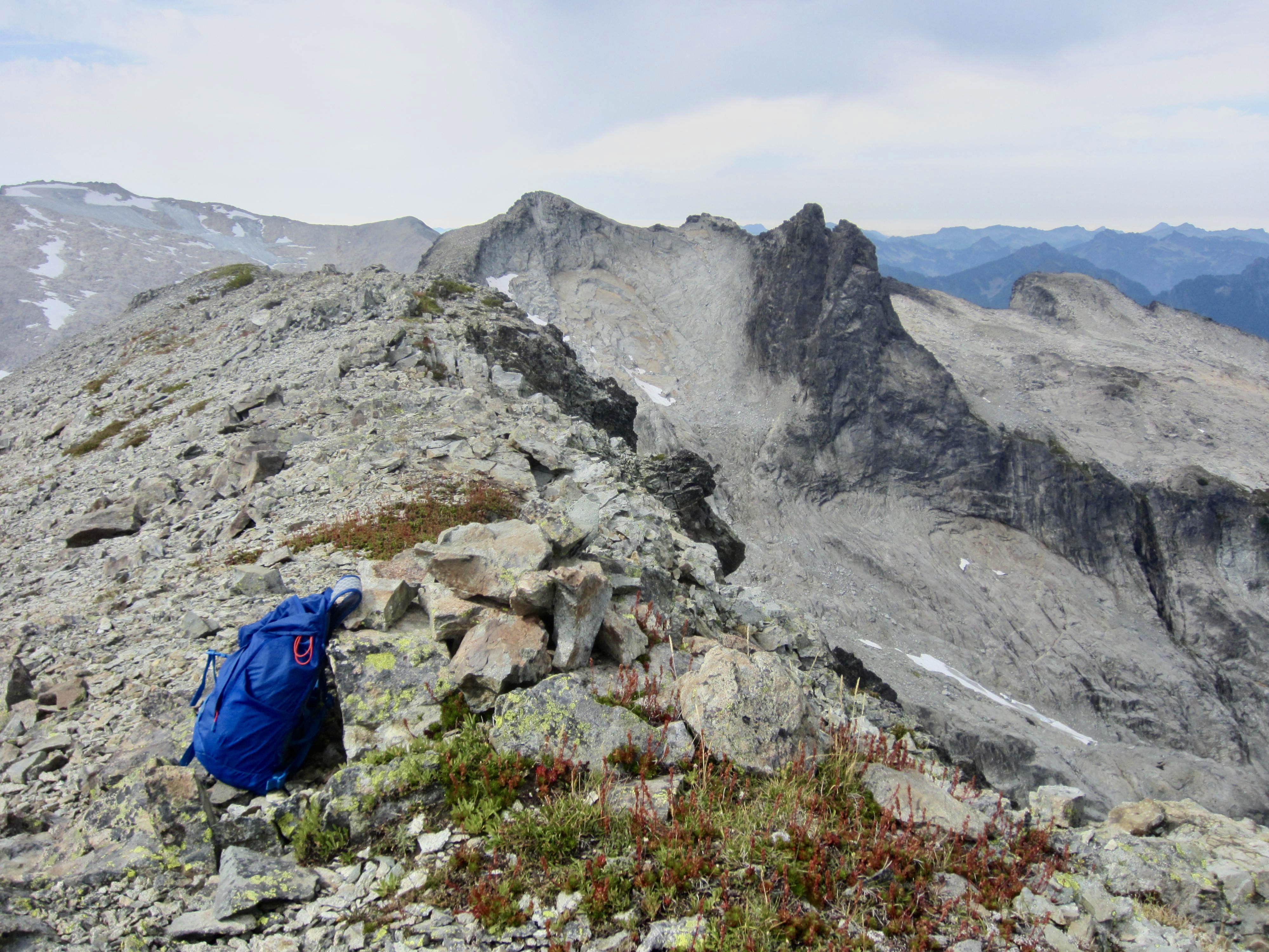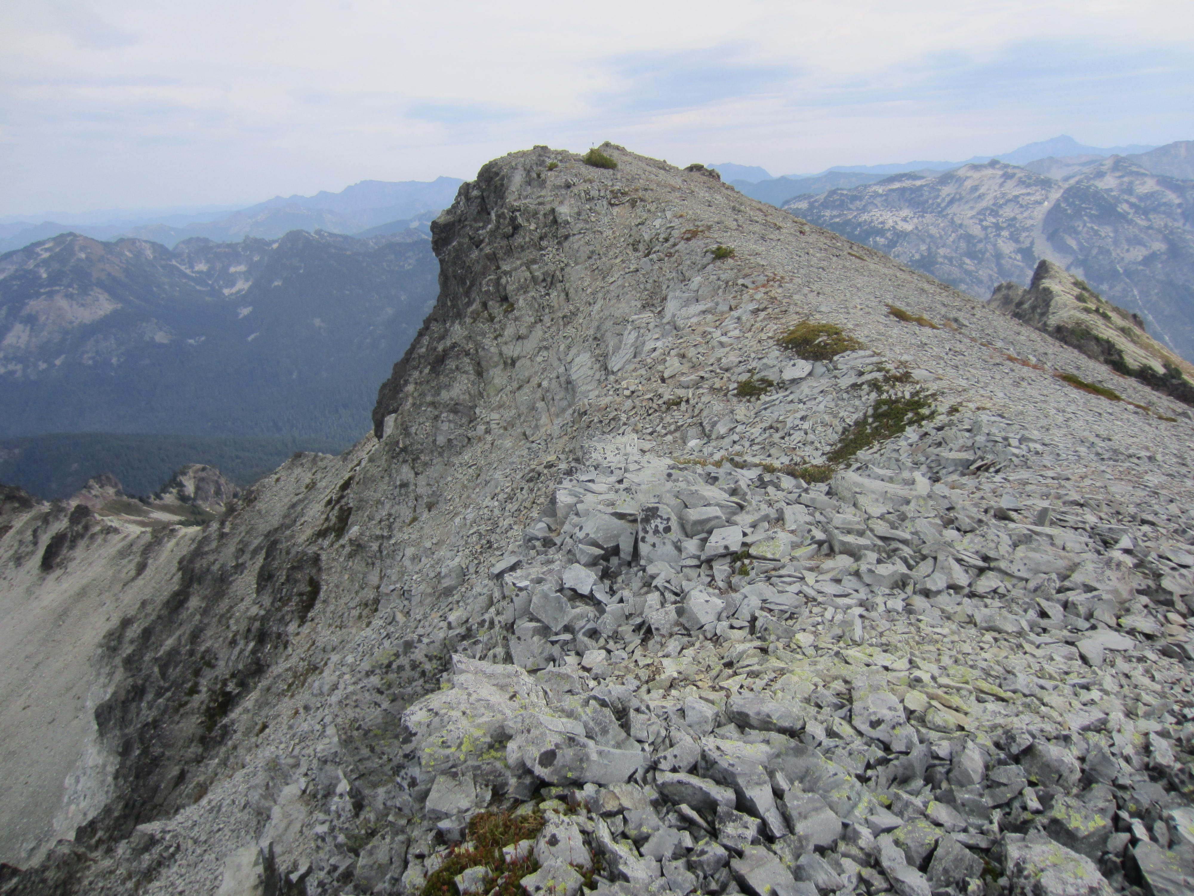 Lynch Peak provides a great view over to Dip Top Peak and Mt. Daniel and down the Dip Top Couloir to Jade Lake. Unfortunately, there was a lot of haze in the air today, along with threatening clouds overhead. Rainfall began minutes later. The summit register was placed in 2021 and showed only one or two ascents per year. I was the first person to sign in this year.