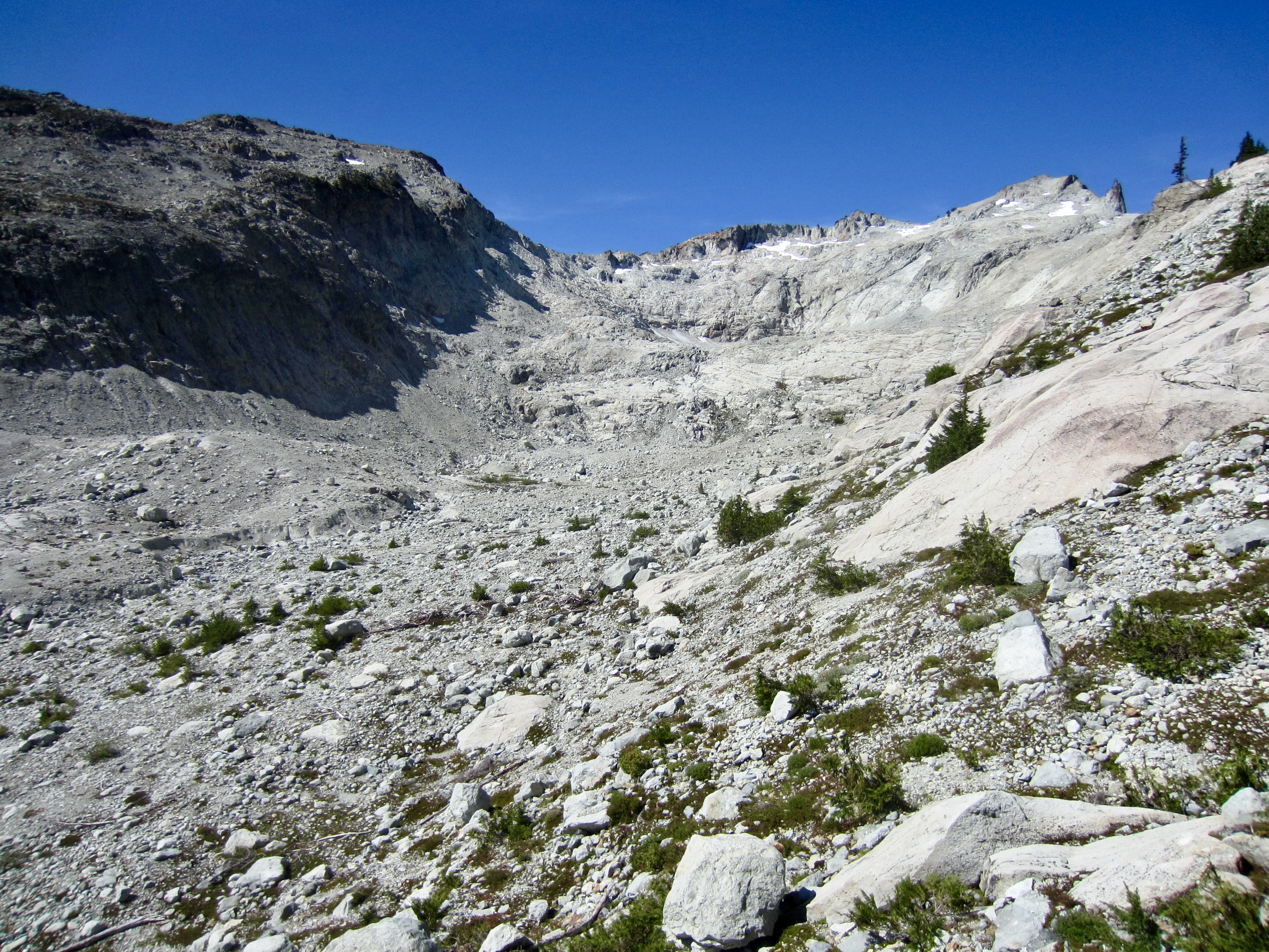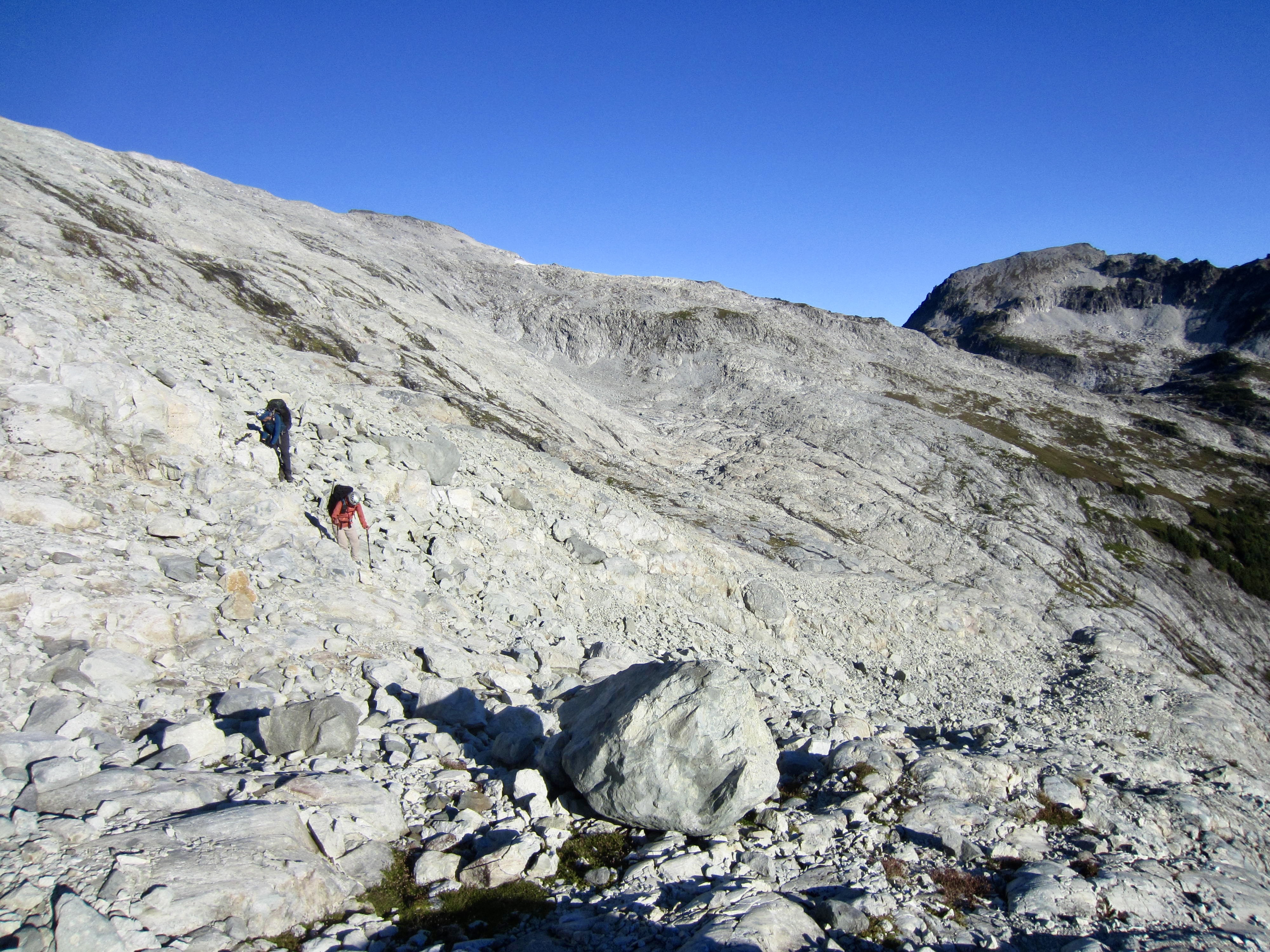 We descended slabs and talus to reach the 6200-foot bowl, which is cradled by a distinctive terminal moraine. This bowl has some flat ground and a few water trickles, so it would provide a decent campsite for future trekkers. We continued contouring around the nose of the ridge, staying at 6300 feet most of the way.