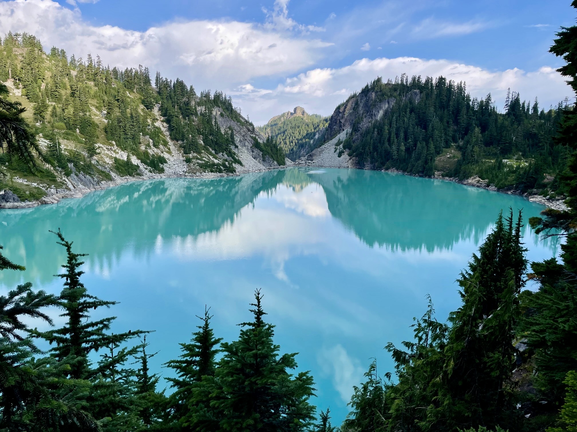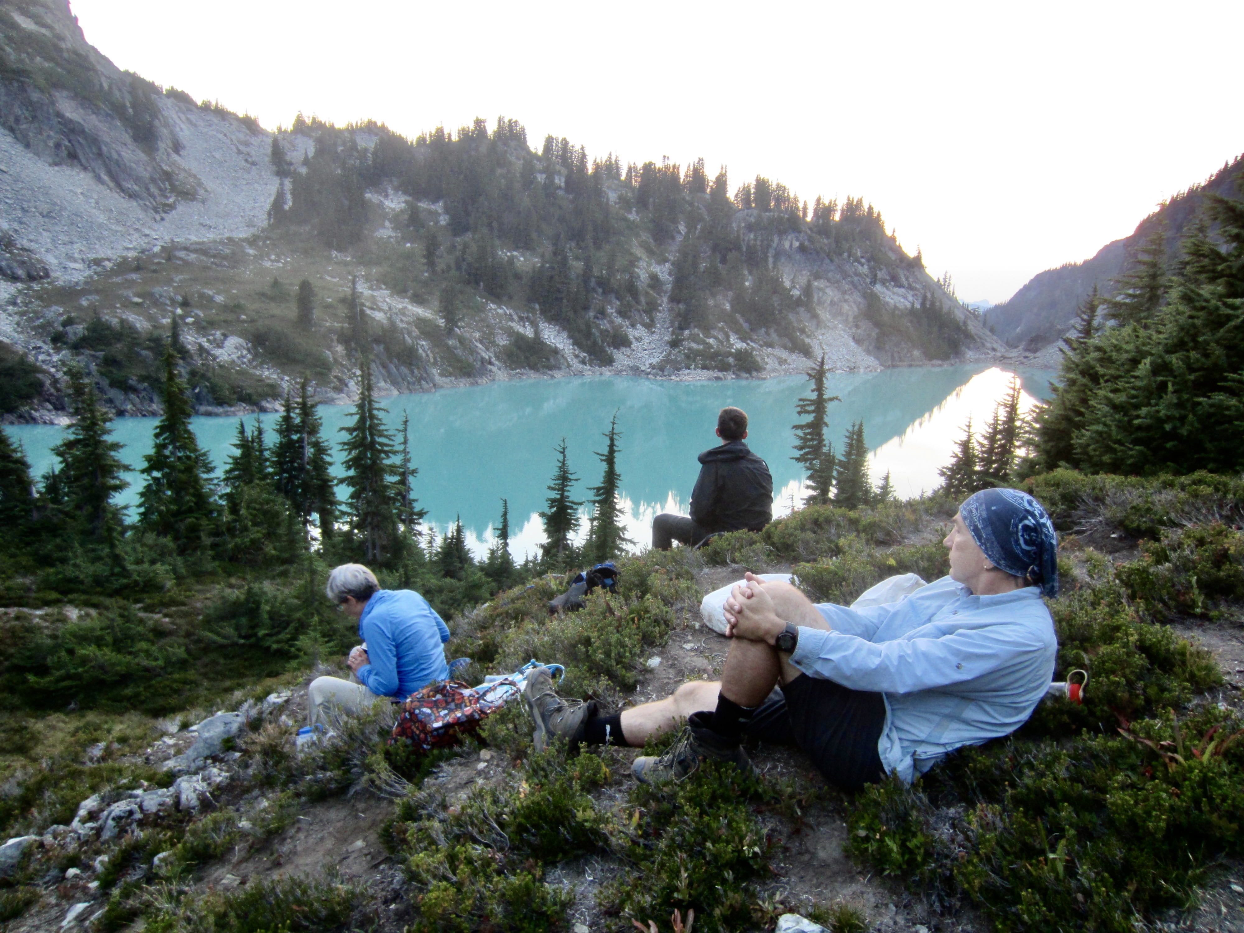 From Peggy’s Pond, we located the exit trail and hiked over to Cathedral Pass, then down past Squaw Lake to our starting point at Tucquala Meadows Trailhead (9.0 hours + 900 feet from Camp 2). Andrew was waiting for us there, having climbed Mt. Daniel yesterday and spent the night at Peggy’s Pond. Our routes from Jade Lake to Peggy’s Pond were very different, but both of them had served up all the adventure that we could handle!