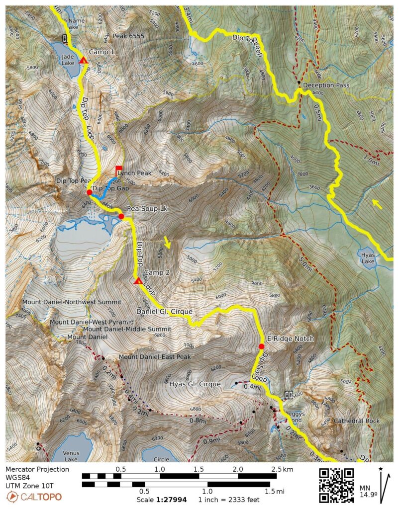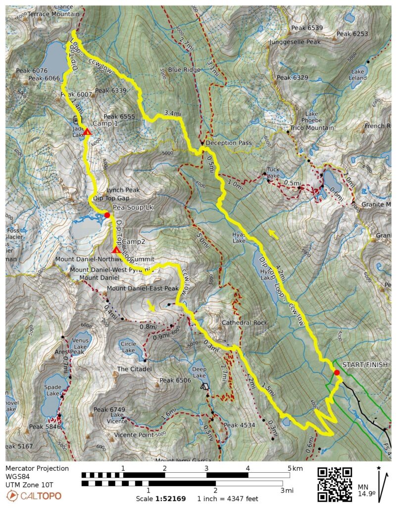 The Dip Top Loop is a moderately classic mountaineering trek in the heart of the Alpine Lakes Wilderness. Traditionally, it begins and ends at Tucquala Meadows Trailhead in the Cle Elum River Valley. The core of this loop consists of an alpine high route from Marmot Lake, over Dip Top Gap, down to Pea Soup Lake, around Mt. Daniel, and down to Peggy’s Pond. Accessible summits along the way include Lynch Peak, Dip Top Peak, Mt. Daniel, and Cathedral Rock.
