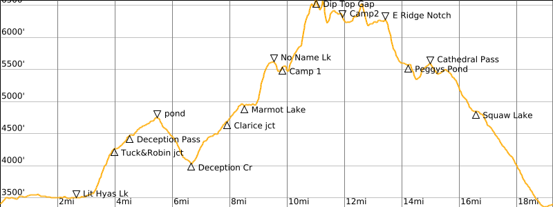 Our foursome headed up the Deception Pass Trail together at noon, but Andrew soon hurried ahead for the purpose of making a few sidetrips today. Lisa, Kevin, and I proceeded through the afternoon heat at a slower but steady pace, encountering scores of hikers coming out from either Tuck and Robin Lakes or Marmot and Jade Lakes. We reached Deception Pass in mid-afternoon (2.5 hours + 1100 feet from TH) and turned onto the Marmot Lake Trail.