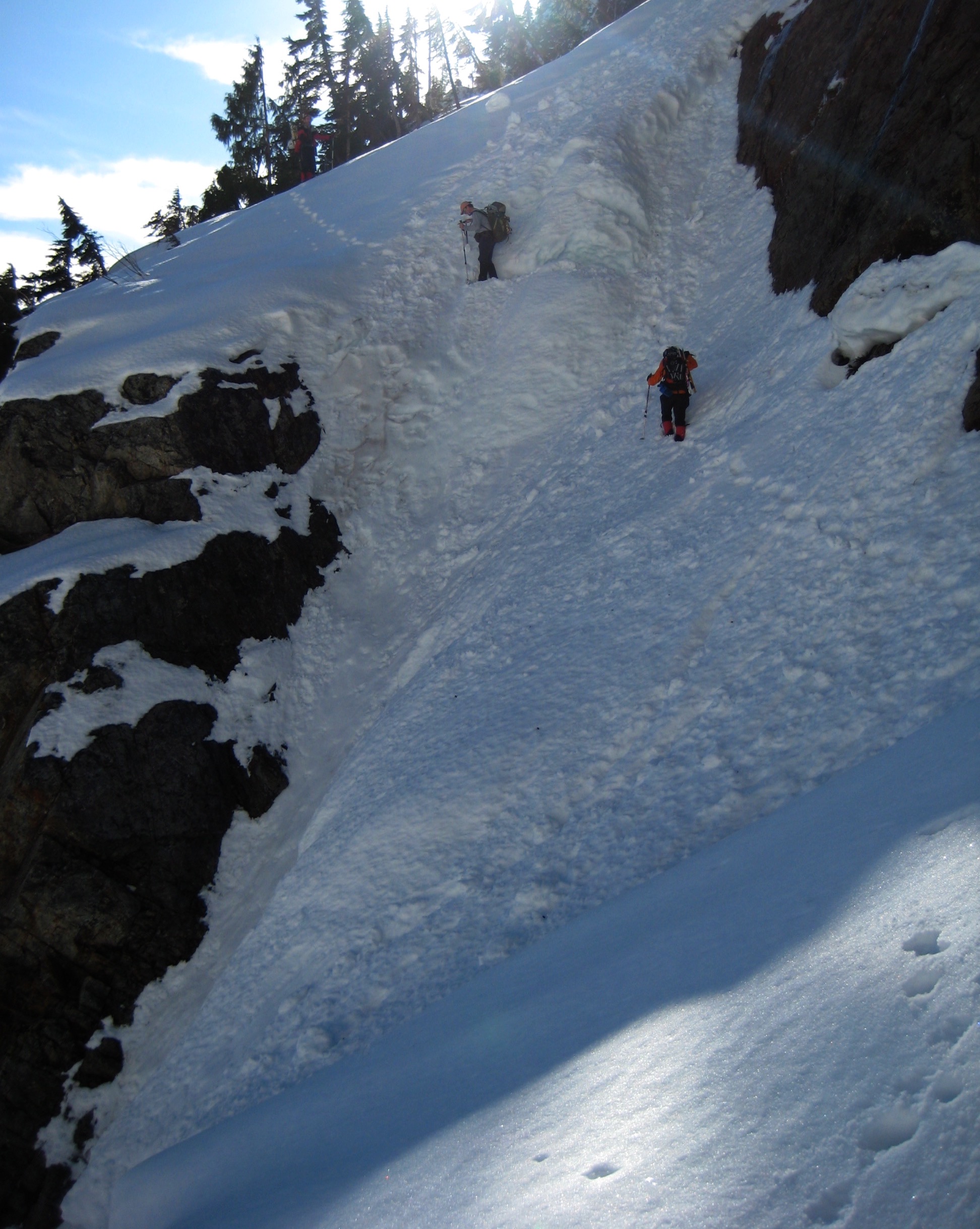 Once across, we walked southeasterly through forest for a mile to Dry Creek, then headed upward through the lower basin and through a hidden snow chute to reach the upper basin. We made a rising snowshoe traverse to the south until directly below Dry Creek (Northeast) Couloir.