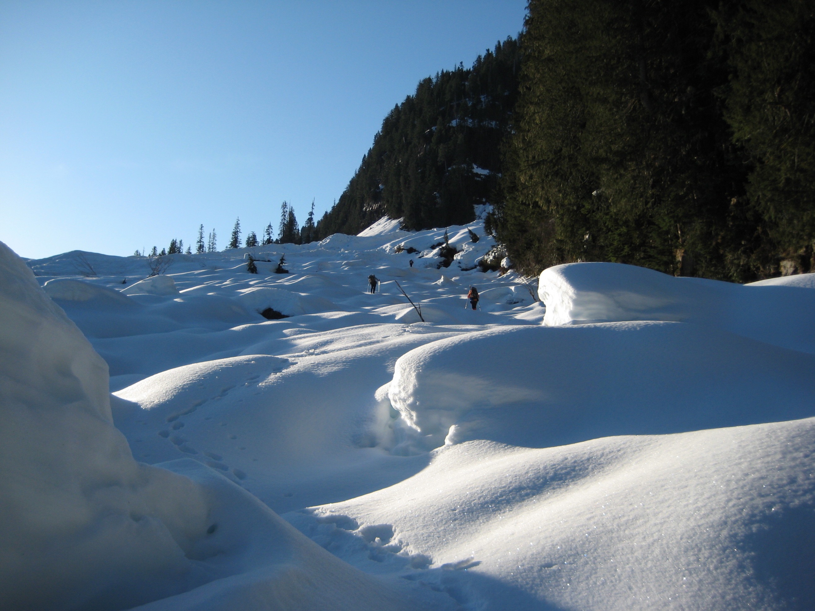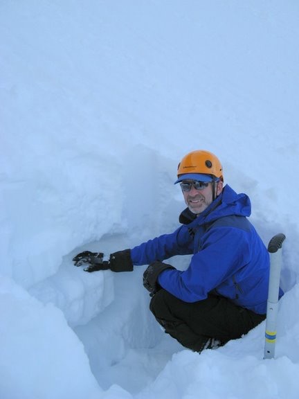 Seeing several natural avalanches in the couloir, I elected to dig a test pit. The findings were not encouraging: fresh snow over breakable crust over deep sugar snow. After a group confabulation, we reluctantly decided to retreat, retracing our route back to the river crossing.