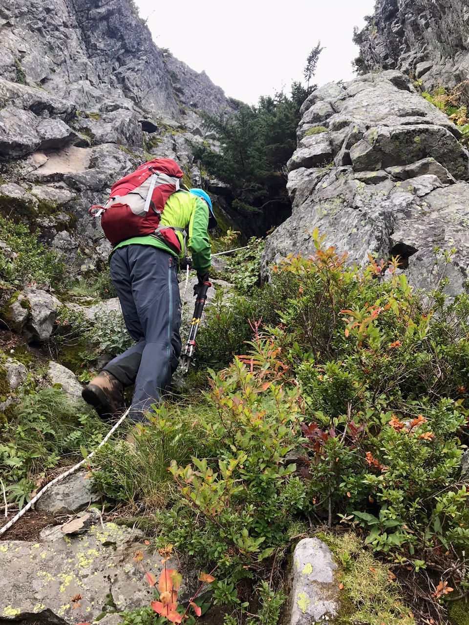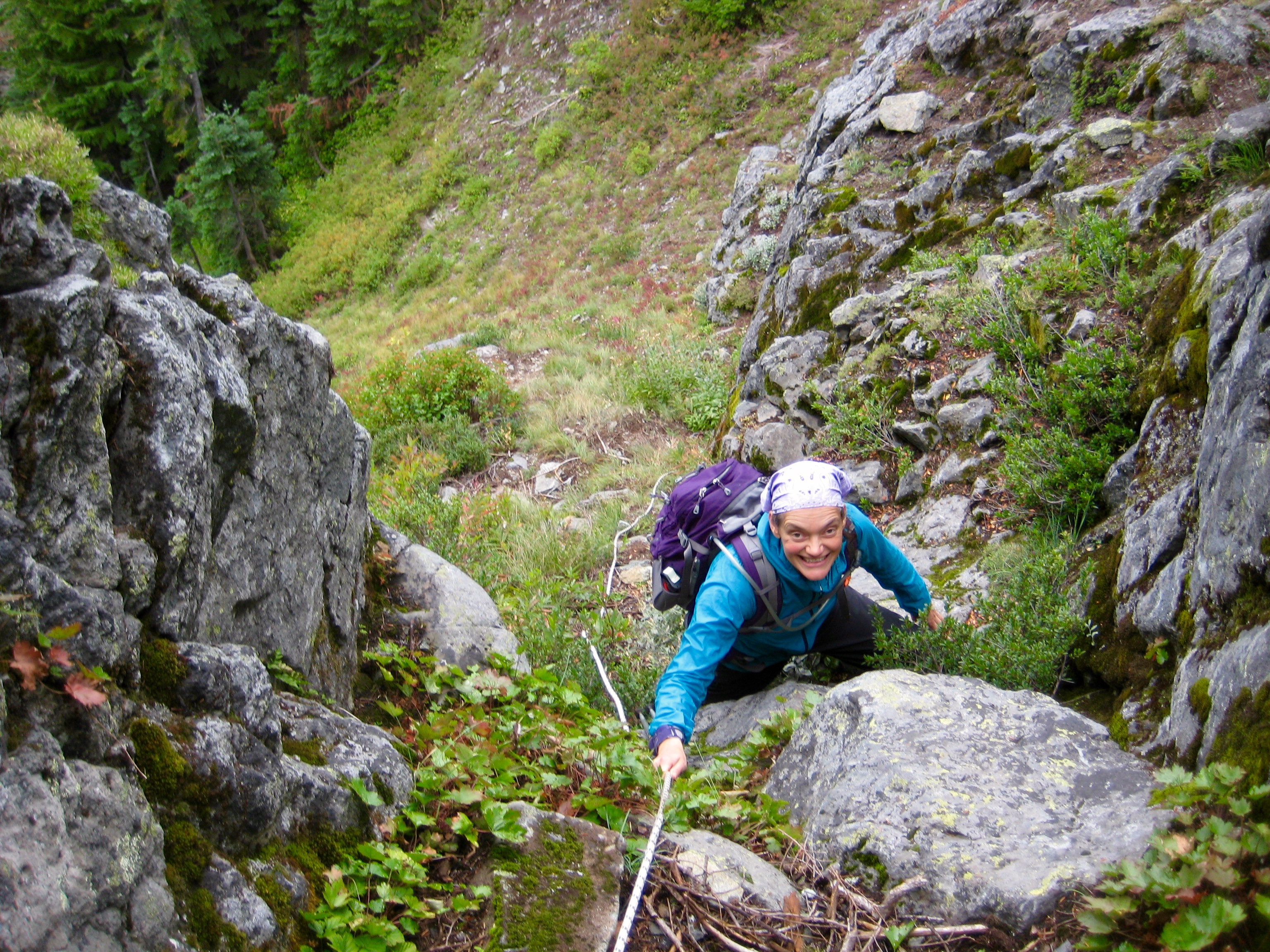 When the ridge got rocky and steep, we traversed around to the right side on heather slopes. The cliffs above were nearly vertical and appeared highly impassable, but we were surprised to spy a rope hanging down a hidden slot that sliced through the Cliffs of Insanity.