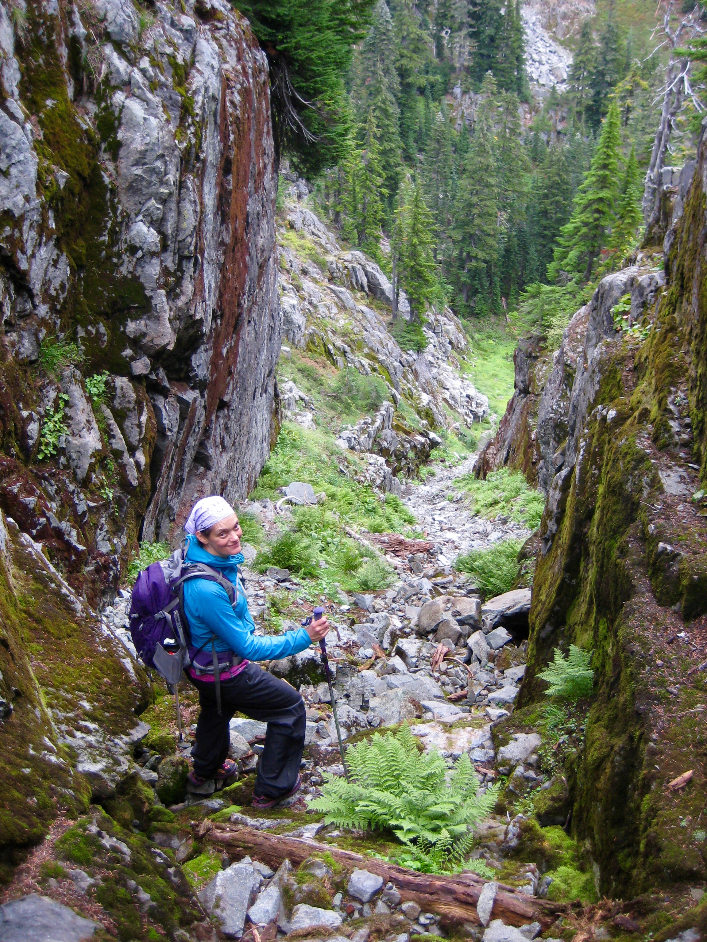 We managed to zig-zag down and around most of these cliff bands but were stymied by a larger cliff near the bottom. Our only options were to go back up or to try descending a rocky ravine to the left. Carolyn had a “positive gut feeling” about the ravine, so we jumped in and headed down.