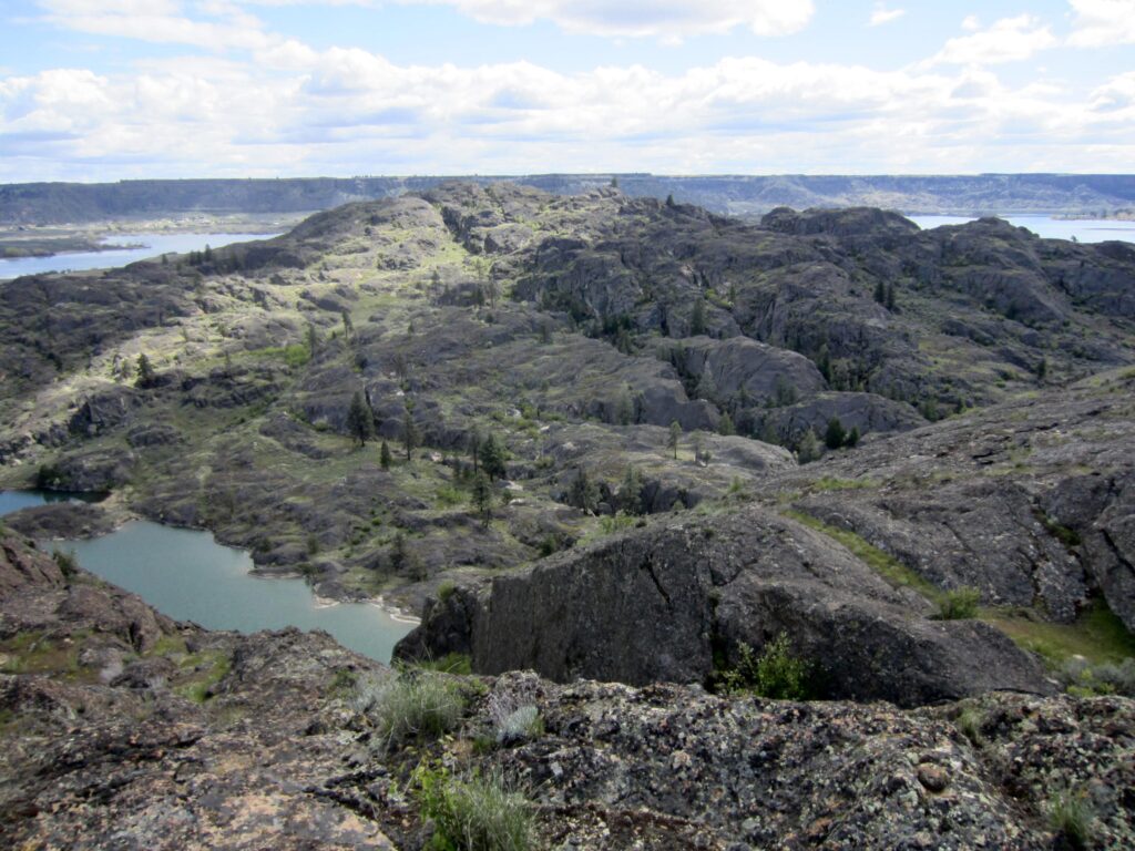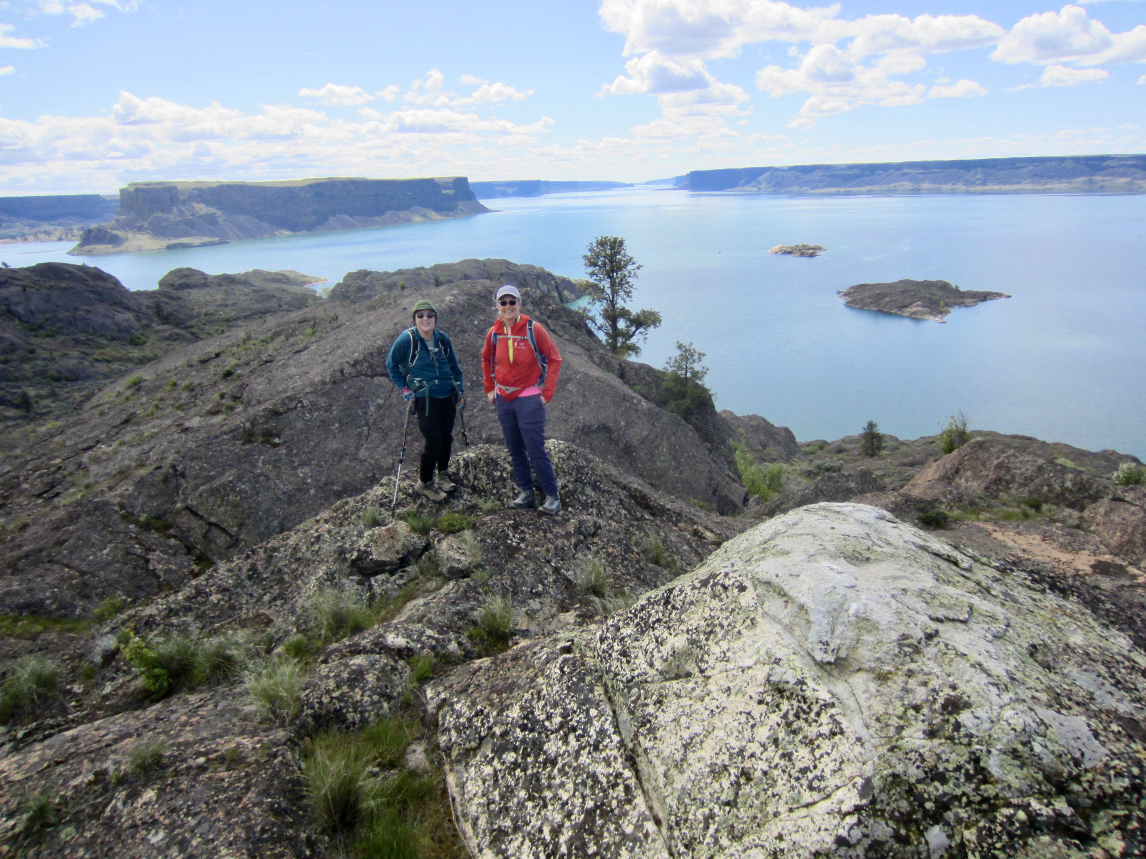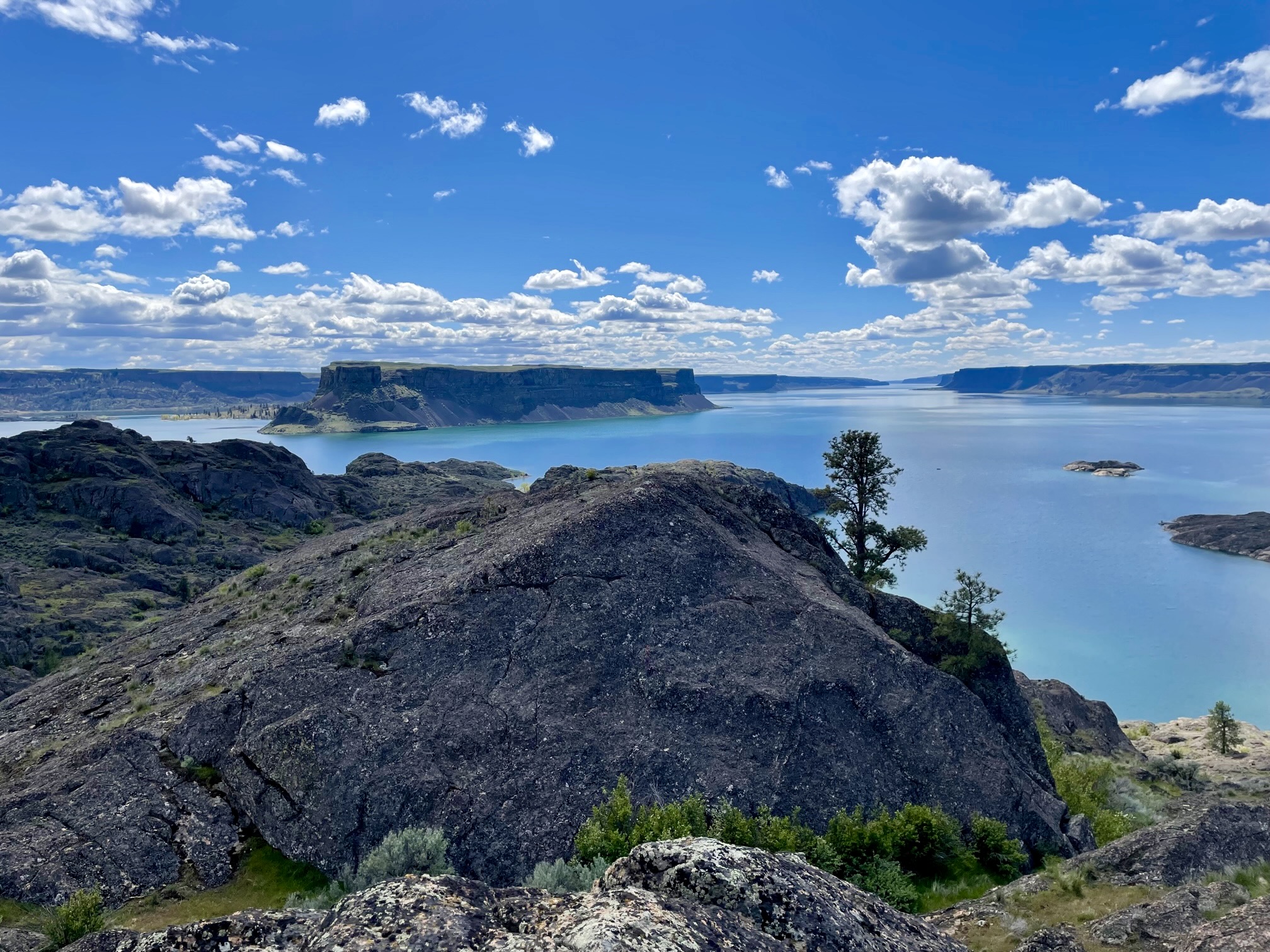 We stepped onto the summit in early afternoon (2.2 hours + 750 feet from boat launch) and took in the views of Banks Lake from this unique perspective.