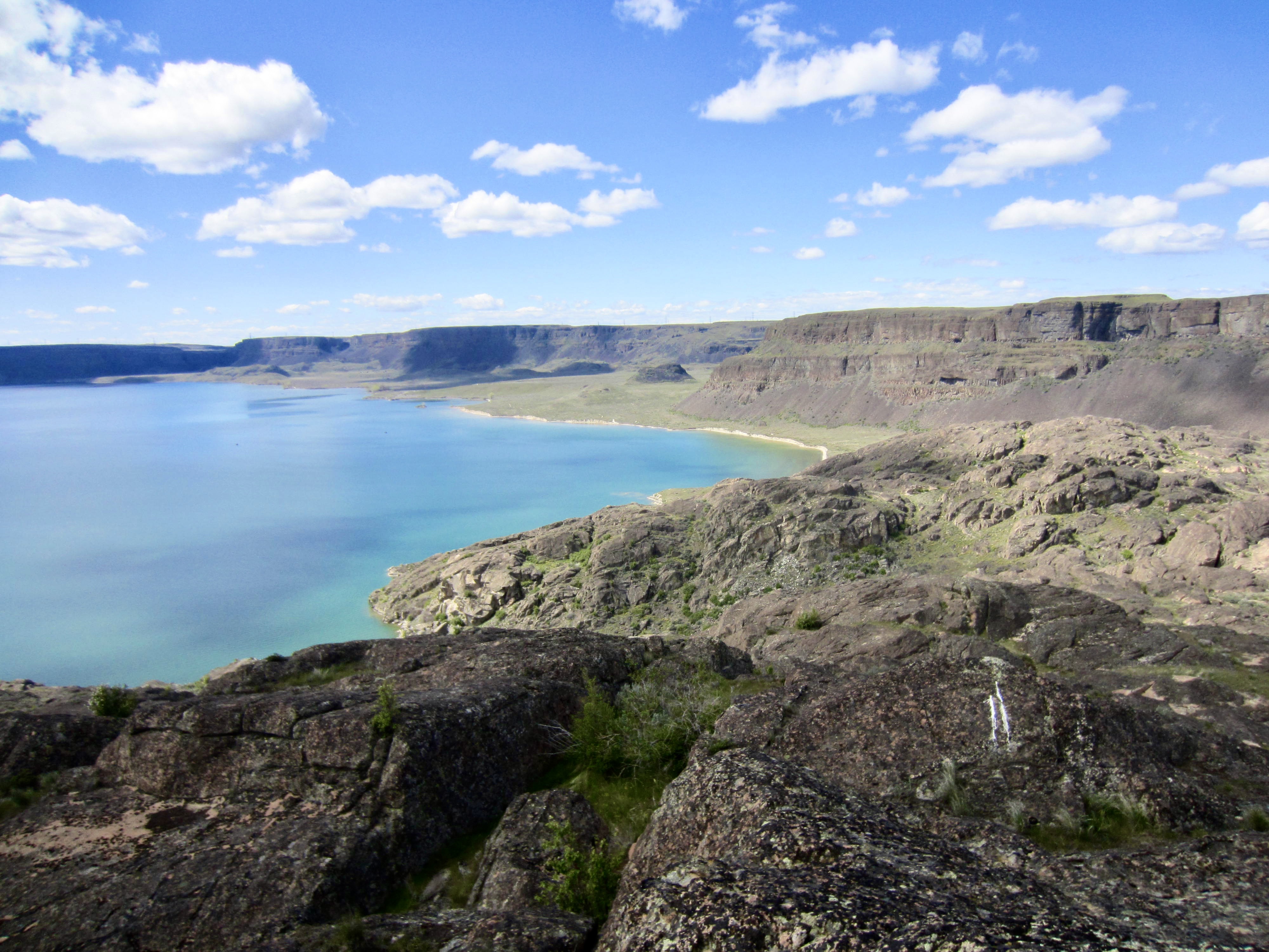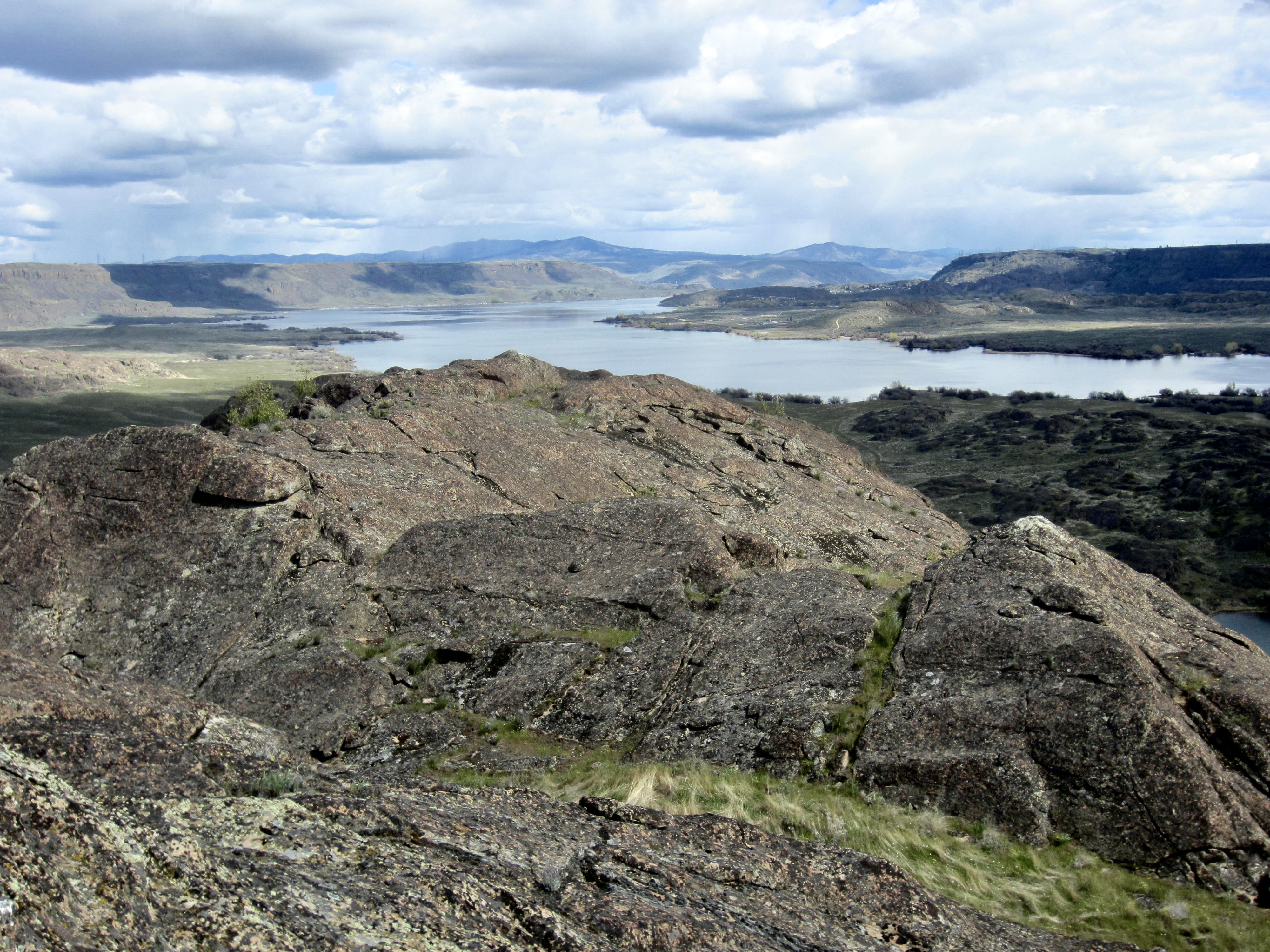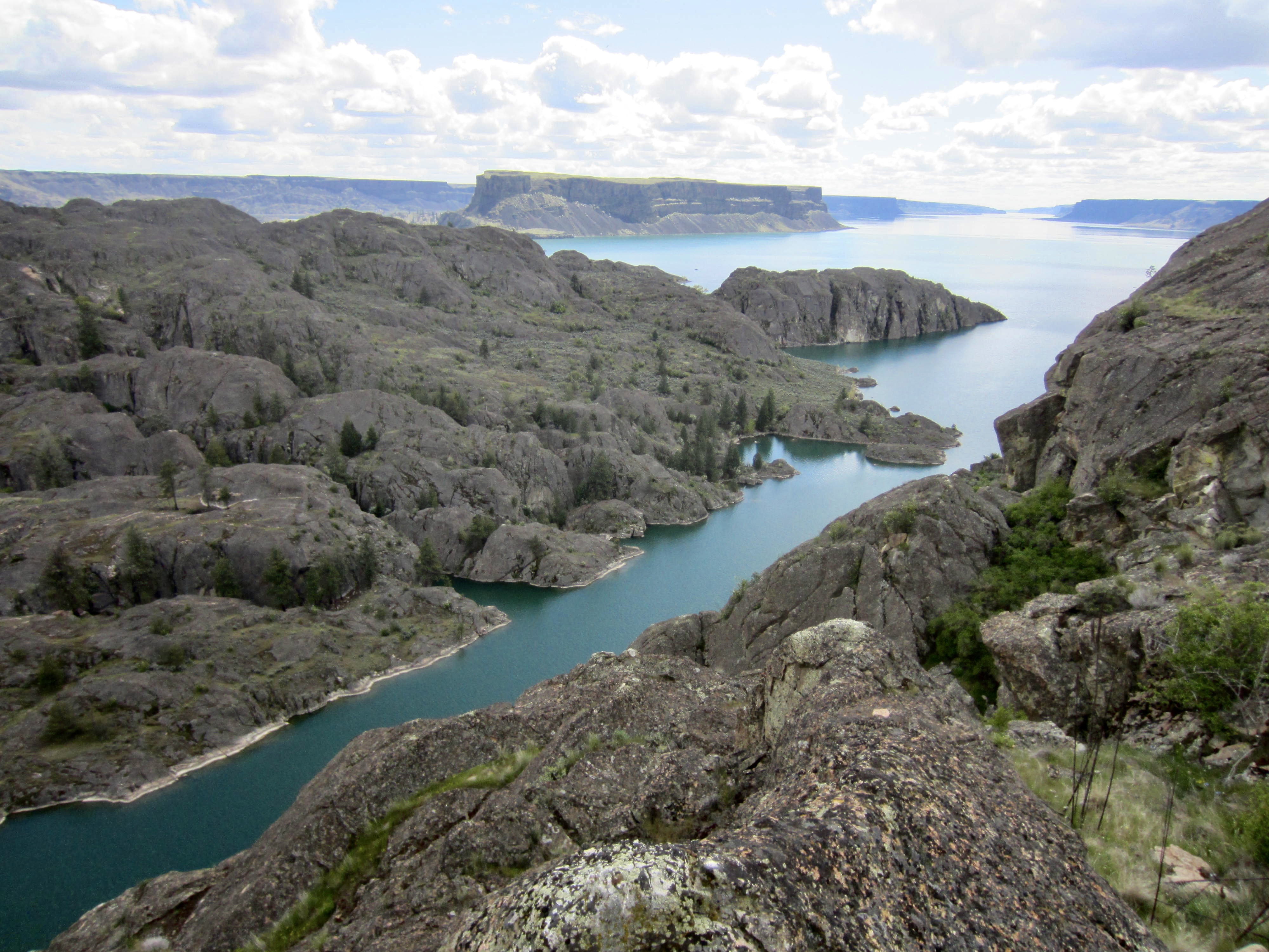 We stepped onto the summit in early afternoon (2.2 hours + 750 feet from boat launch) and took in the views of Banks Lake from this unique perspective.