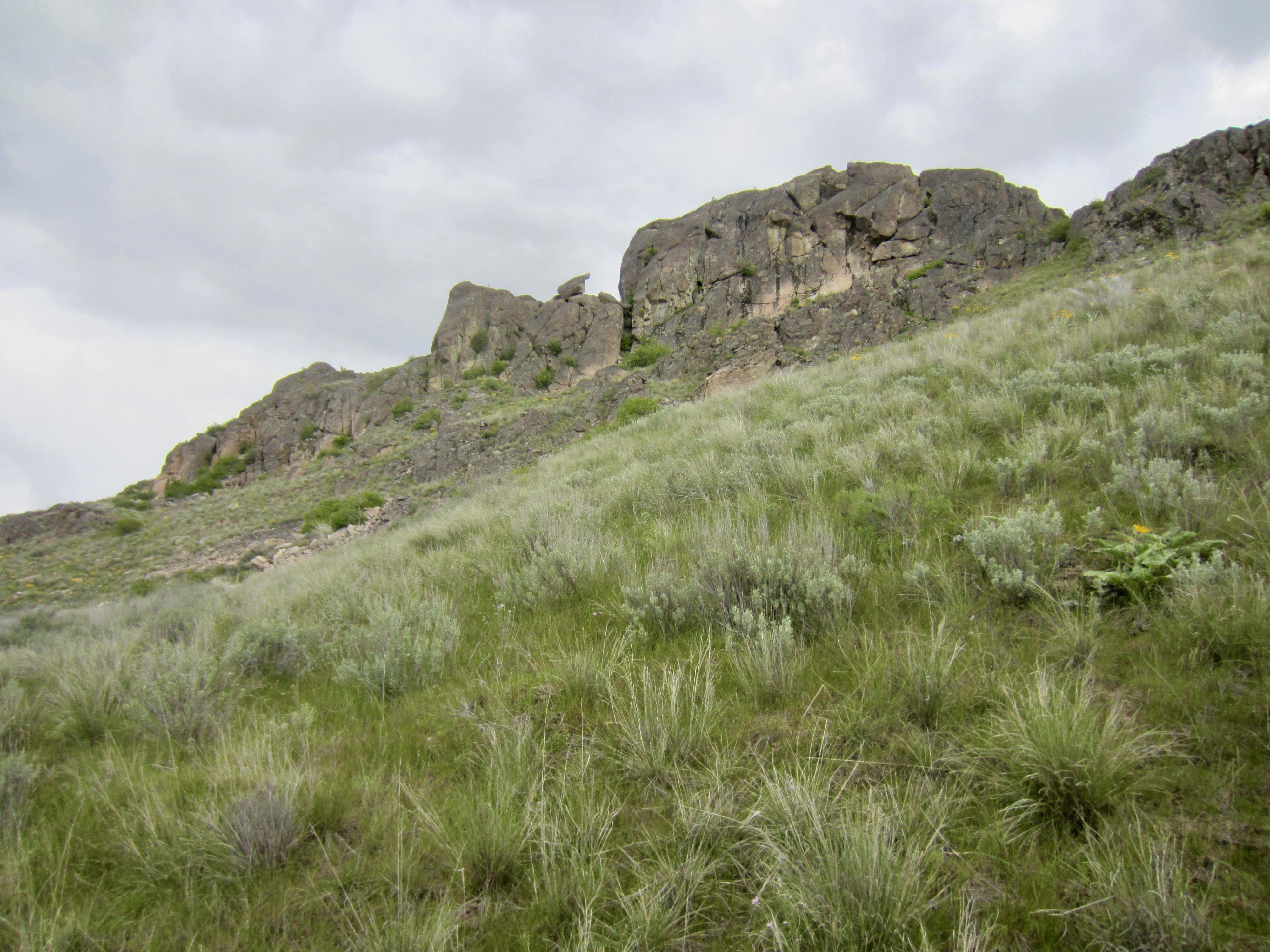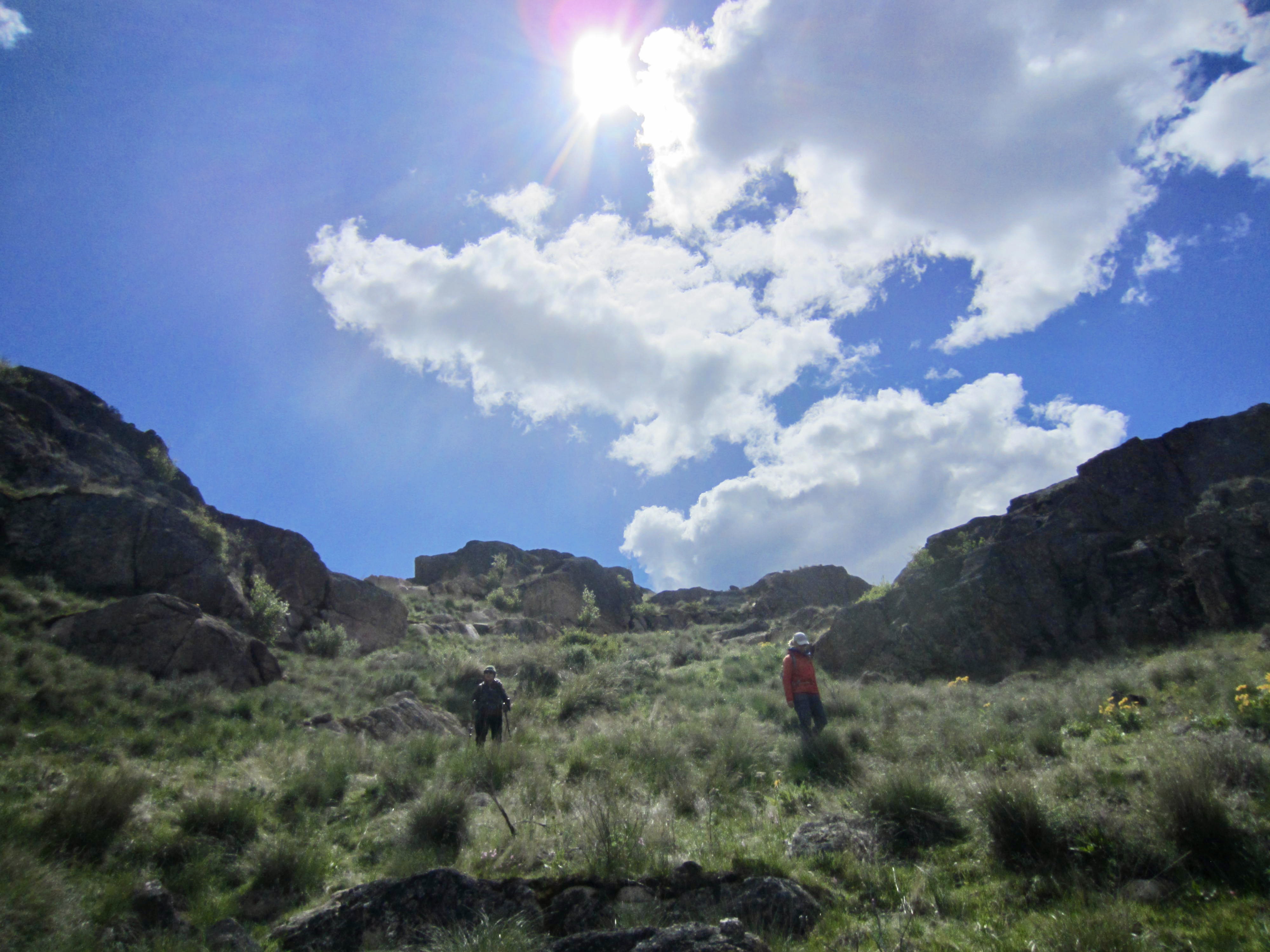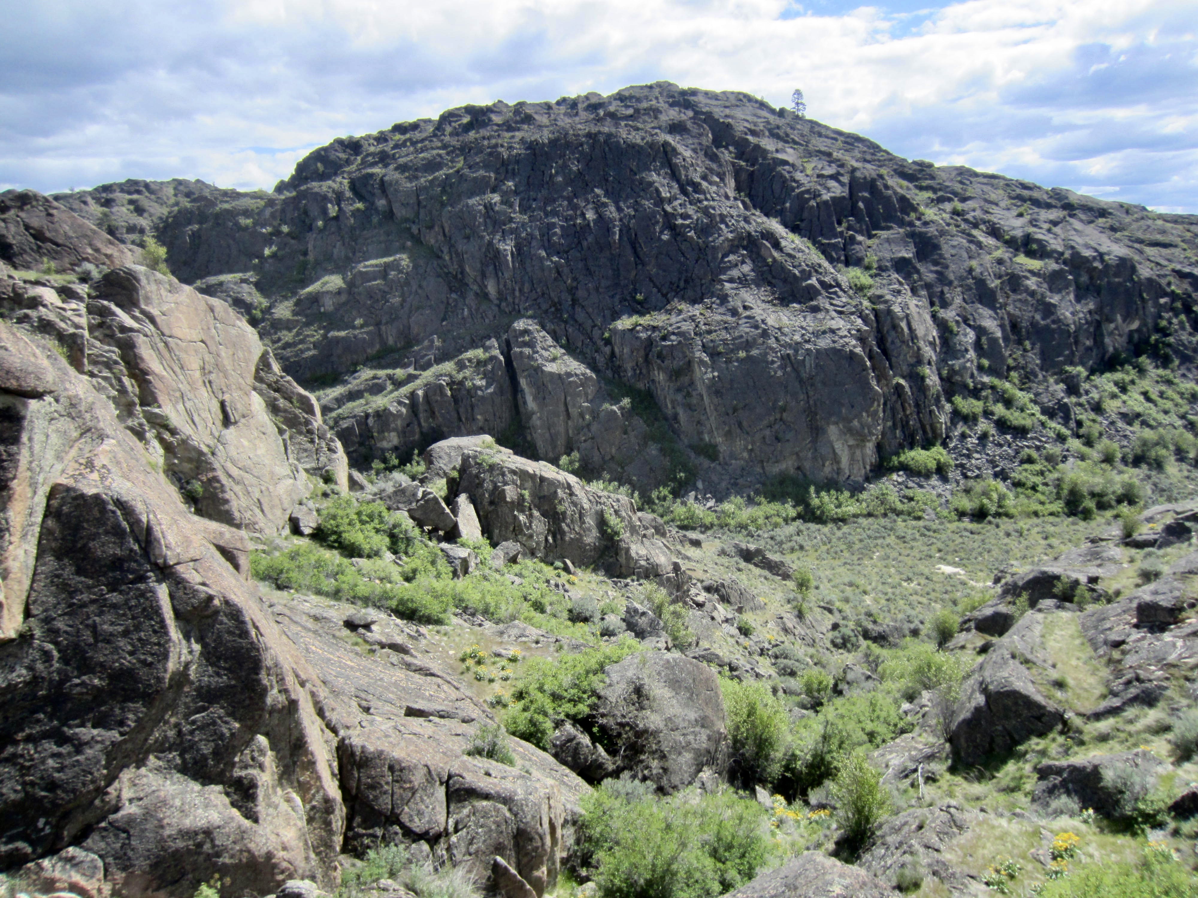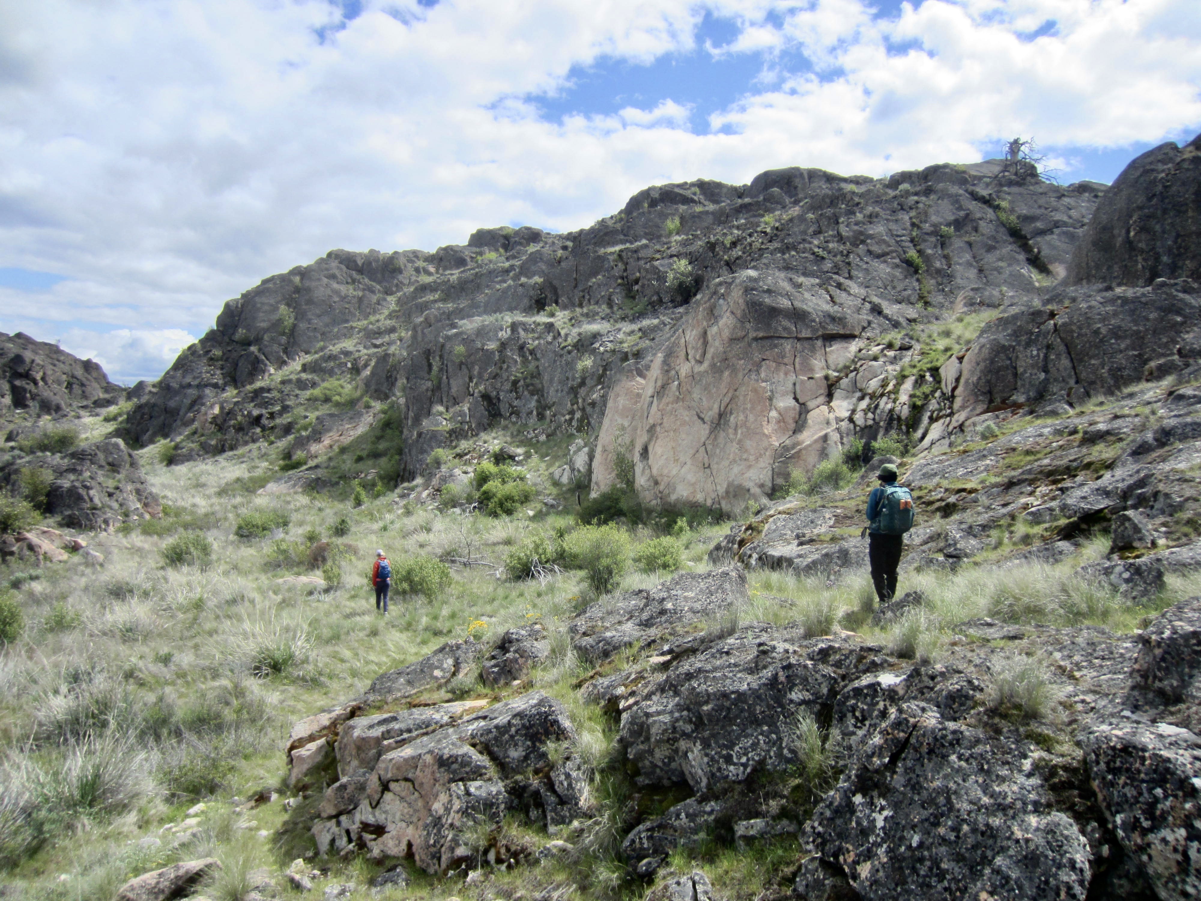 After 1½ level miles, our road veered to the left and went over Barker Gap, a 1700-foot grassy saddle that separates the basaltic rampart of Barker Butte from the granitic Barker Knobs. At the top of the gap, we left the road and began traversing over the northern shoulder of West Barker Knob. This involved a combination of easy cross-country hiking and enjoyable scrambling.