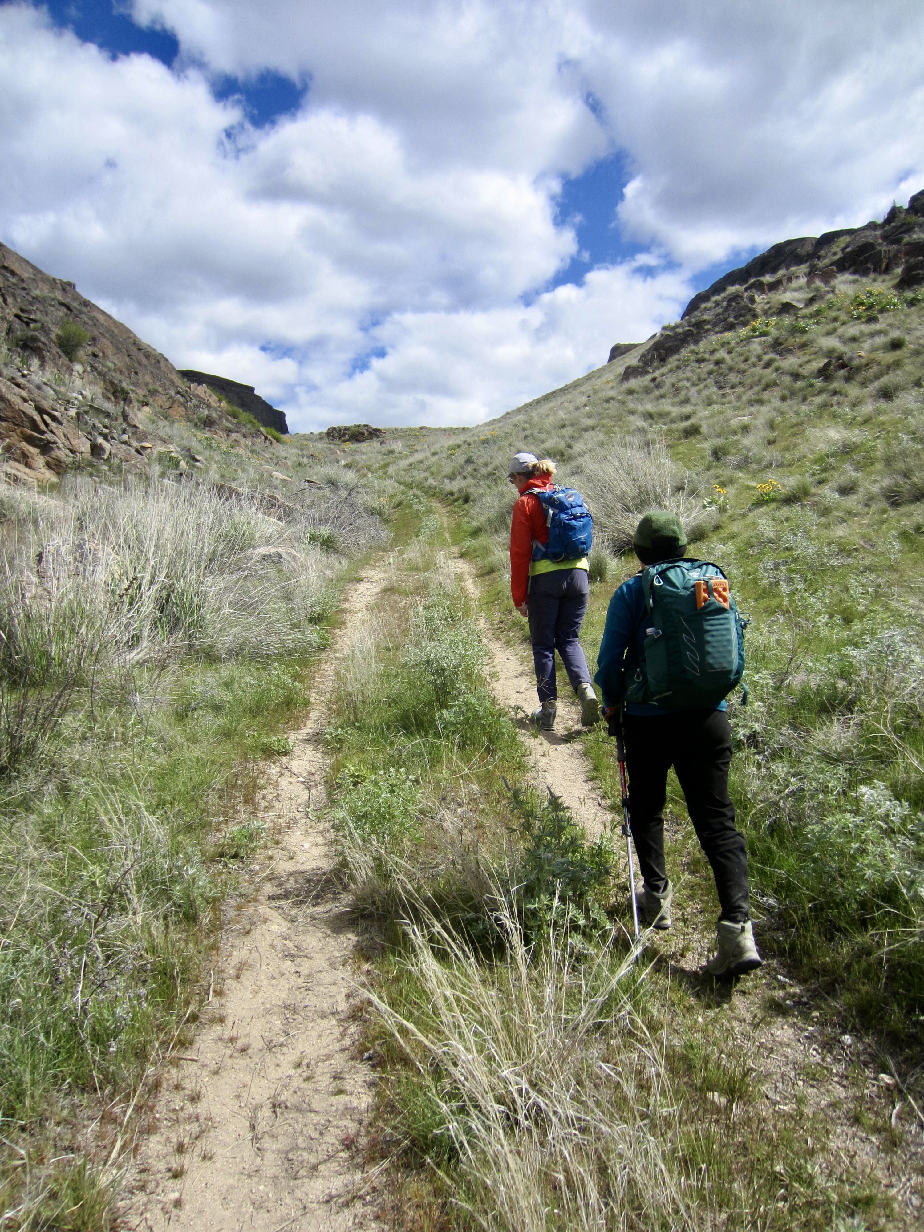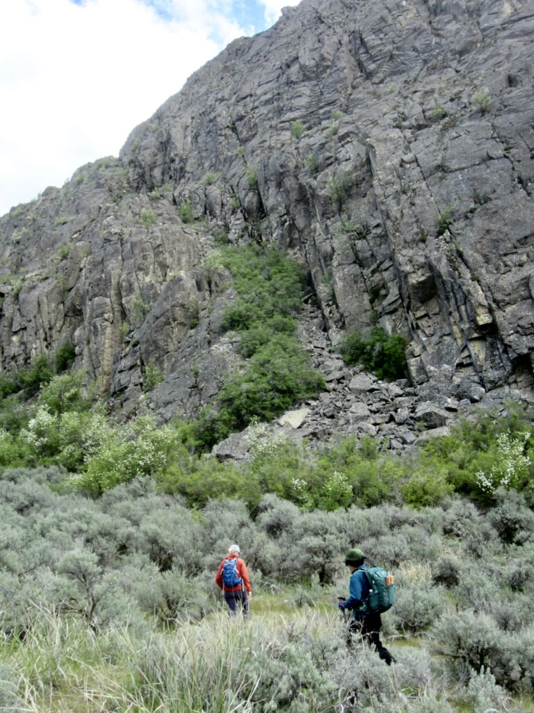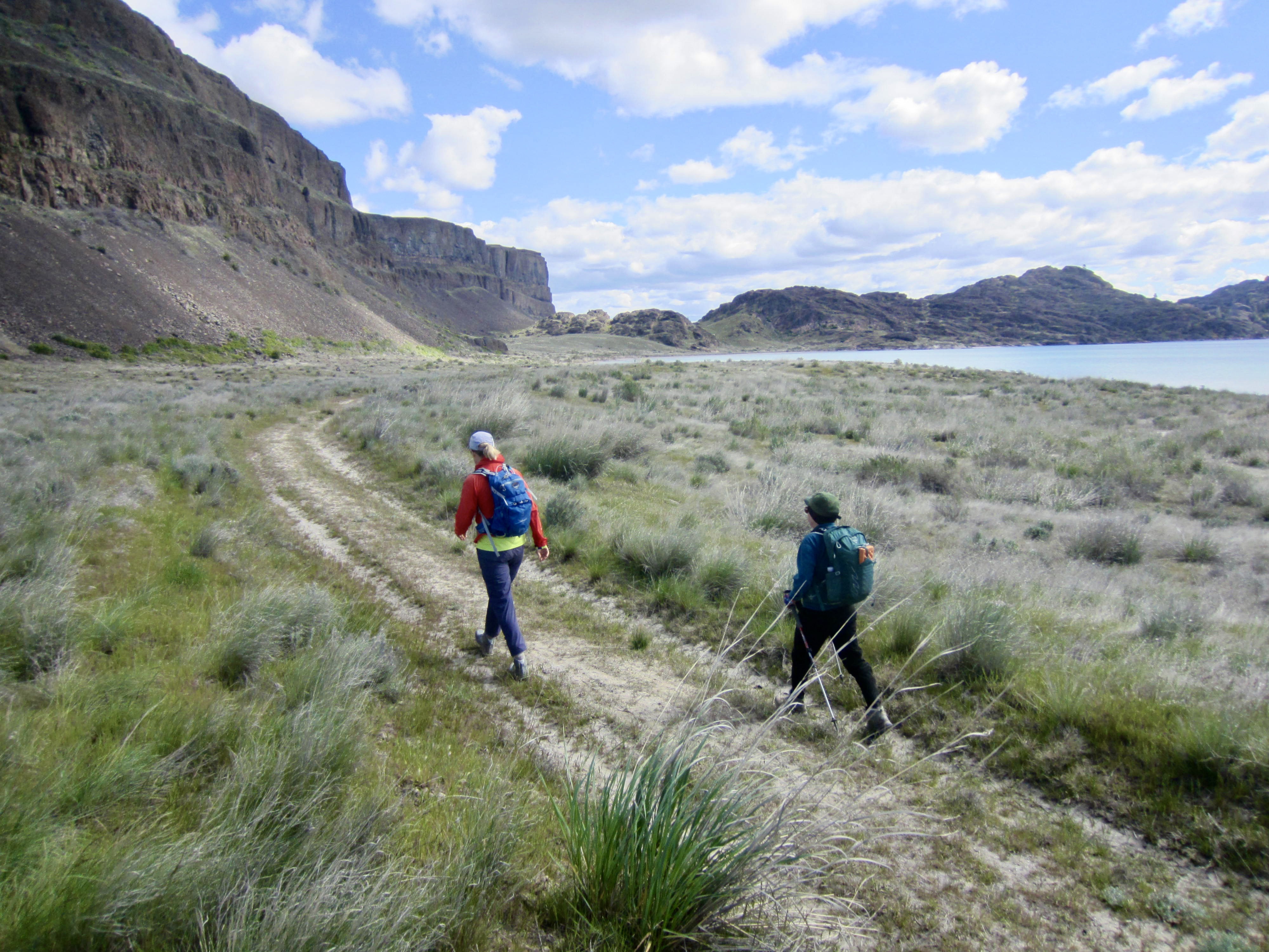 From our campsite at Steamboat Rock State Park in Upper Grand Coulee, Fay and Eileen and I drove around the northern end of Banks Lake and down Barker Canyon Road to a boat launch on the lake’s western shore. It was slightly amusing that, after one hour and many miles of driving, we were now only 3½ miles from our campsite! Anyway, today’s objective was East Barker Knob, one of several large granite knobs projecting into Banks Lake closely north of Steamboat Rock. These knobs could be seen ahead as we hiked along an abandoned road that parallels the lakeshore. Fay had climbed two of the knobs several years ago, but Eileen and I had never even been in the vicinity.