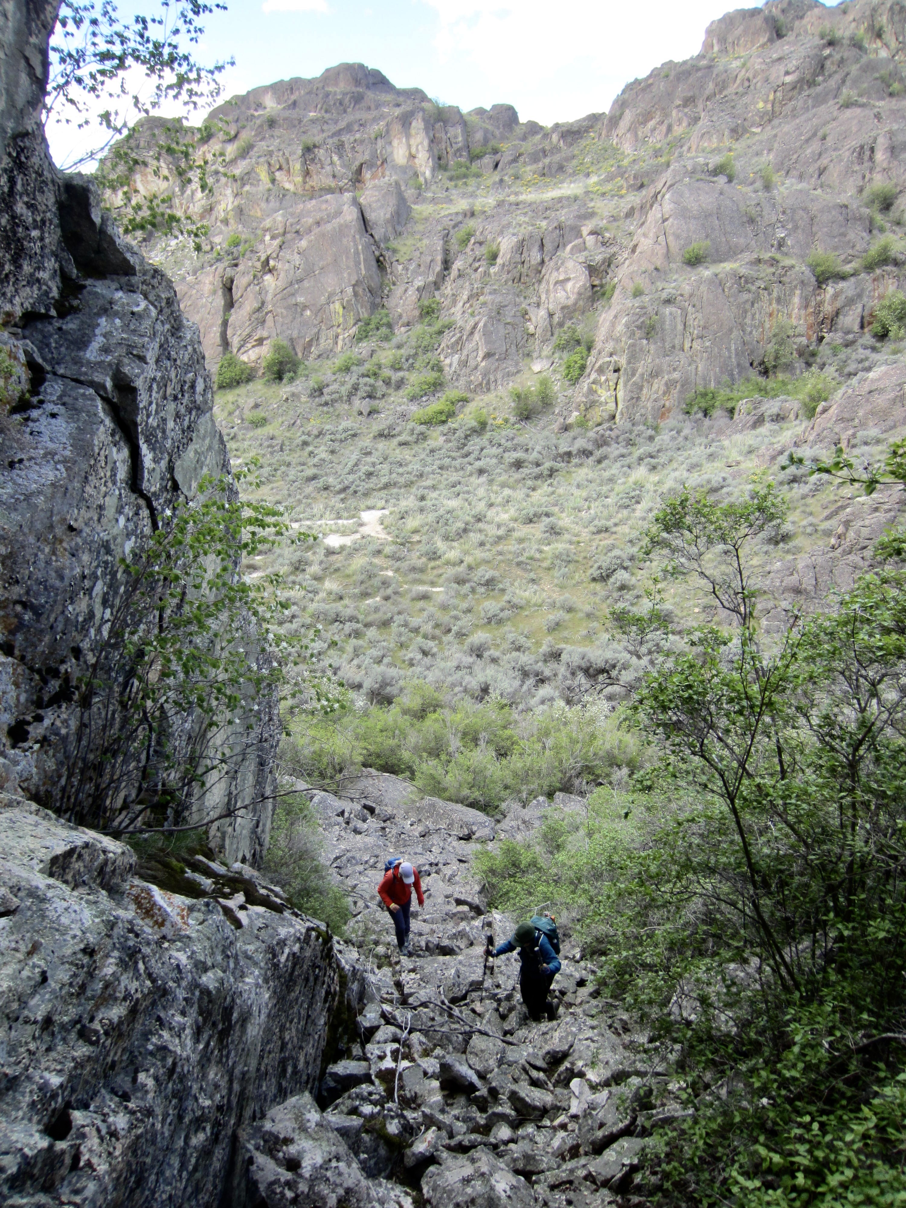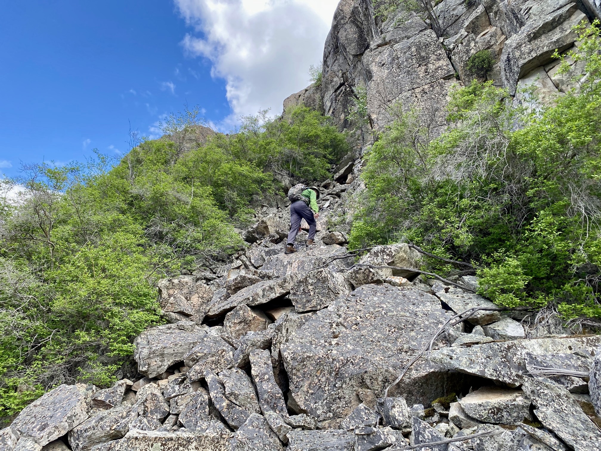 A left-slanting talus ramp could be seen cutting up through the large granite wall in front of us. We headed up this ramp, hoping that it would continue around the corner. This turned out to be a good gamble, although there were some dense patches of scraggly trees along the way.