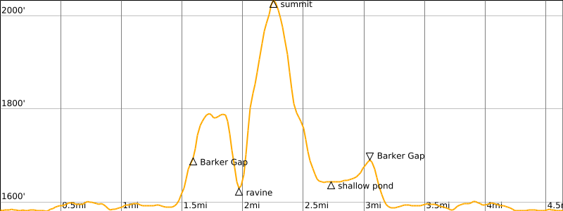 Way Points: Barker Gap & West Barker Knob shoulder & Barker Knob ravine & East Barker Knob summit; return via shallow pond & Barker Gap (trail hike & off-trail hike & rock scramble)