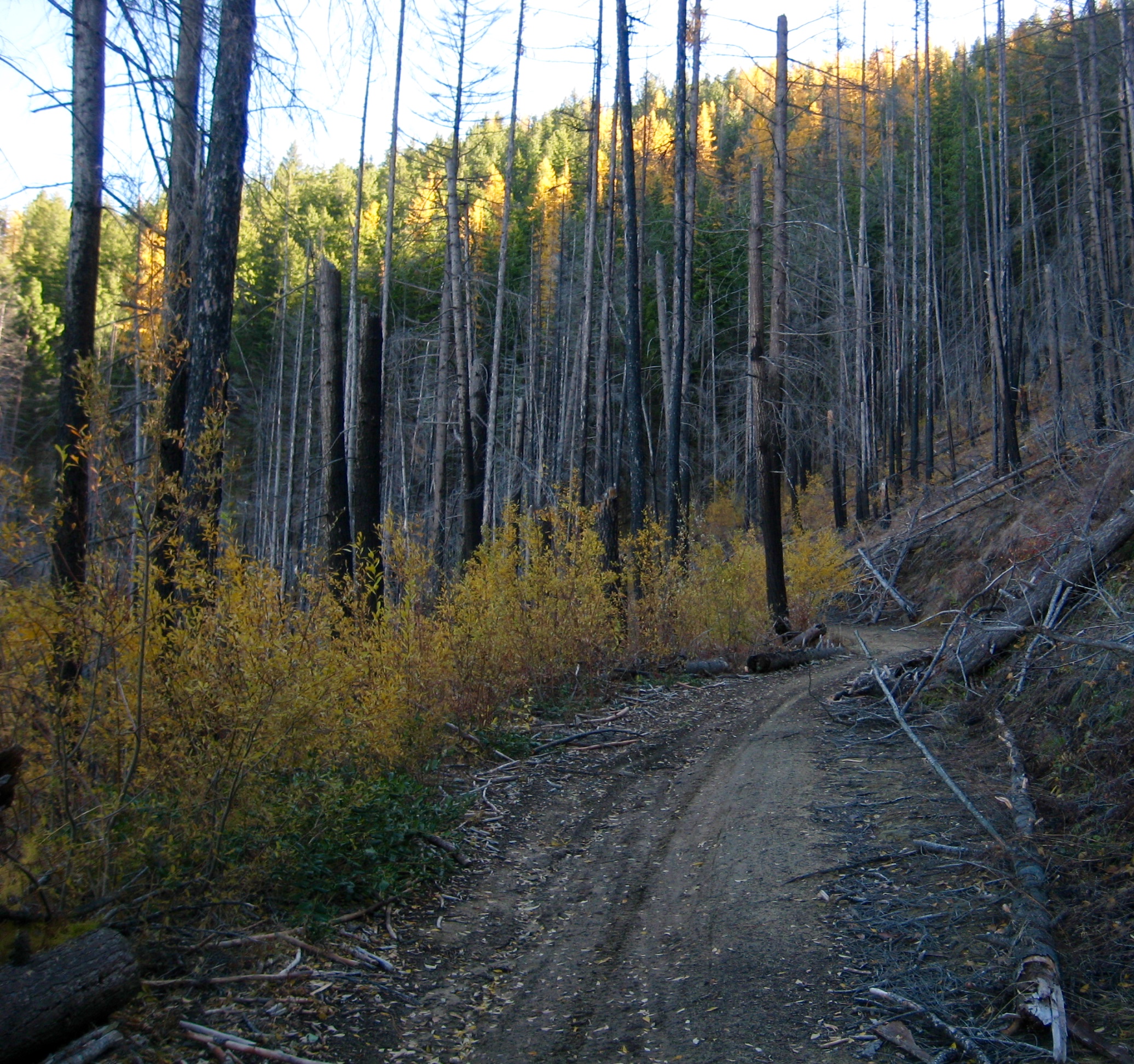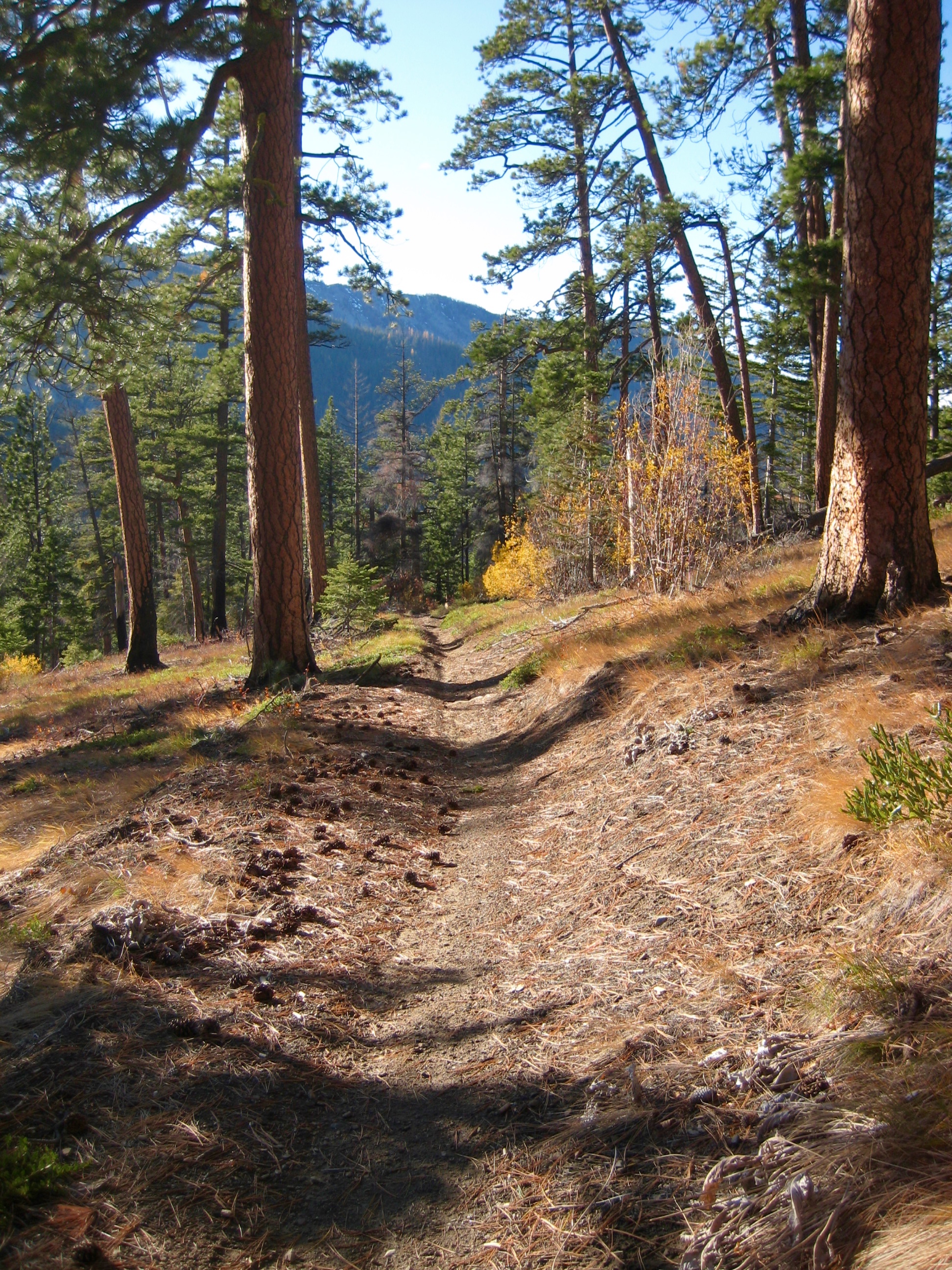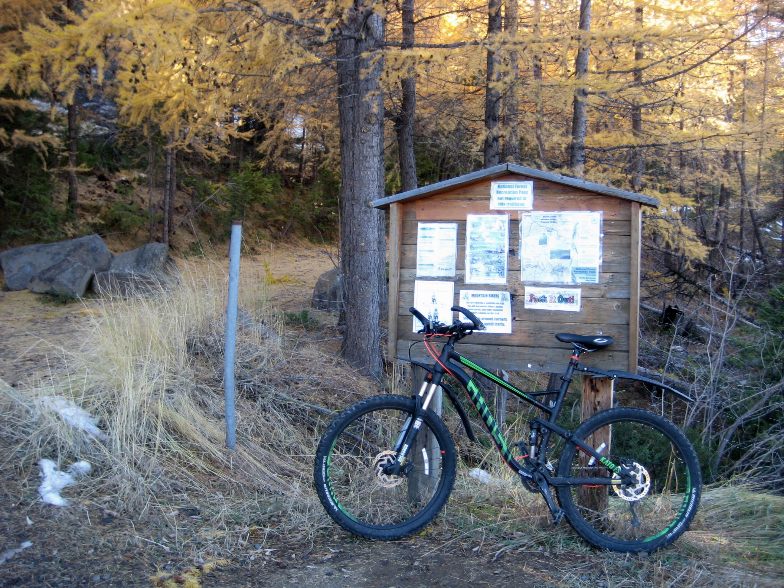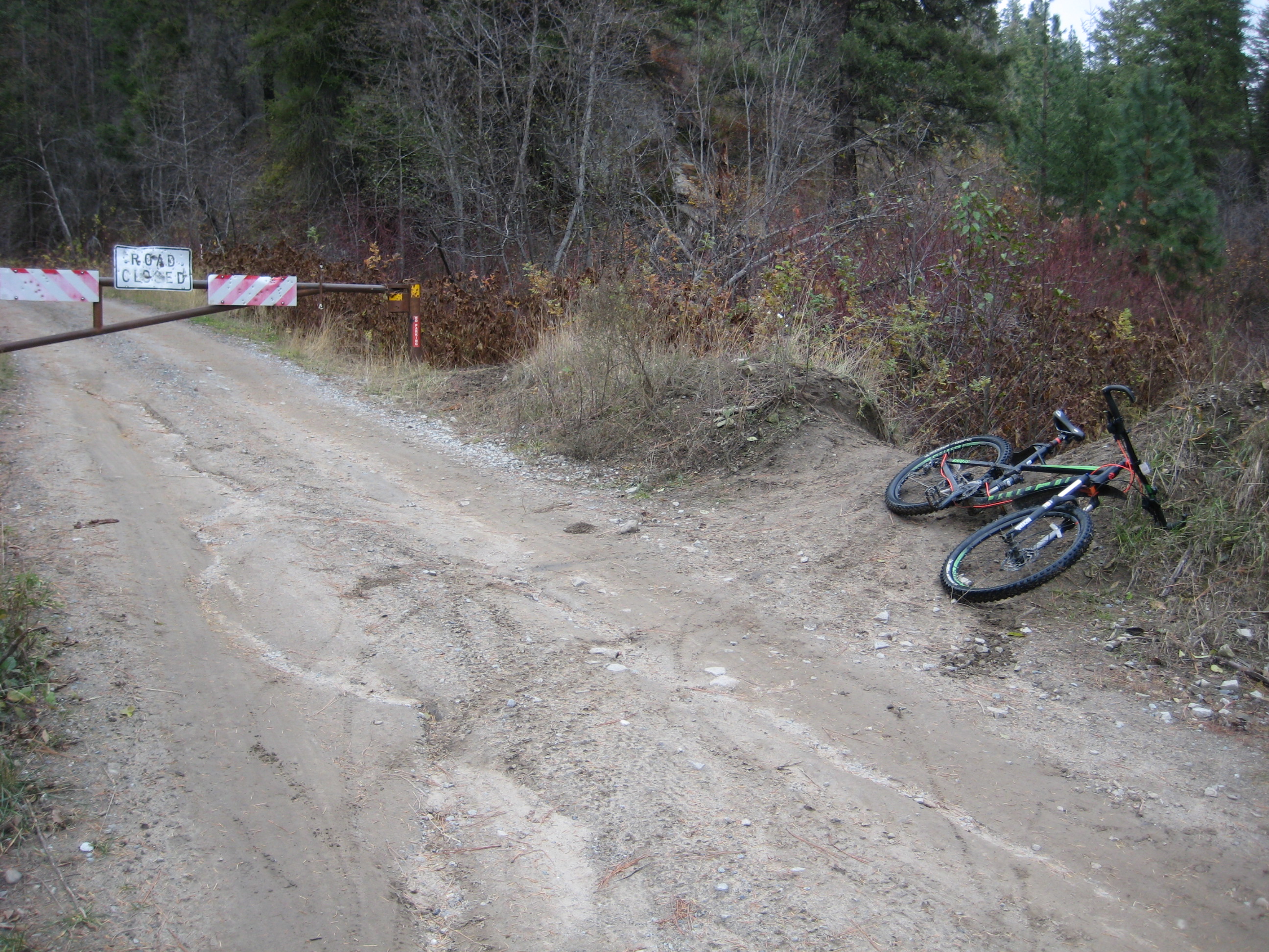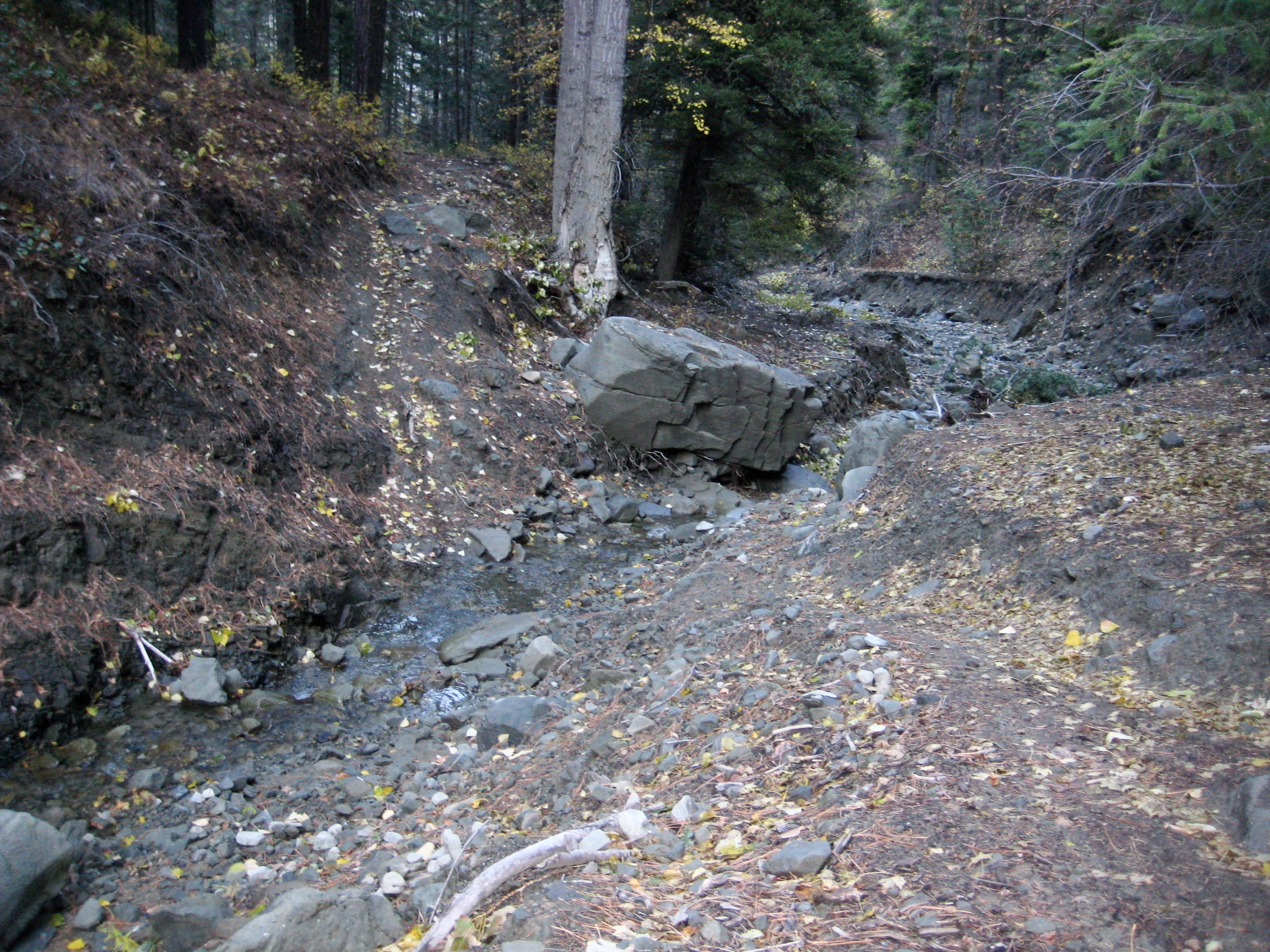 Heading out from the lower trailhead parking lot on a sunny October morning, I pointed my bike up Mission Creek Road 7100.  The remarkably smooth dirt road makes a gentle ascent alongside East Fork Mission Creek for 2.3 miles, at which point it reaches a discreet junction with Road 7101.  This critical junction is easily missed; keep your eyes open for a steel gate (usually open in the summer) across the road.  Just before passing through the gate, look for a low dirt berm with tire tracks branching off to the right.  What initially appears to be nothing more than a rogue path is actually the continuation of Road 7100—washed out and abandoned long ago—and is now the unofficial start of the East Mission Gulch Trail.