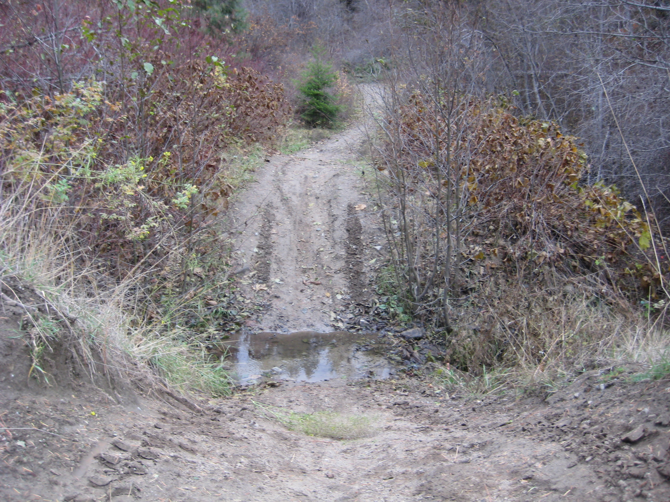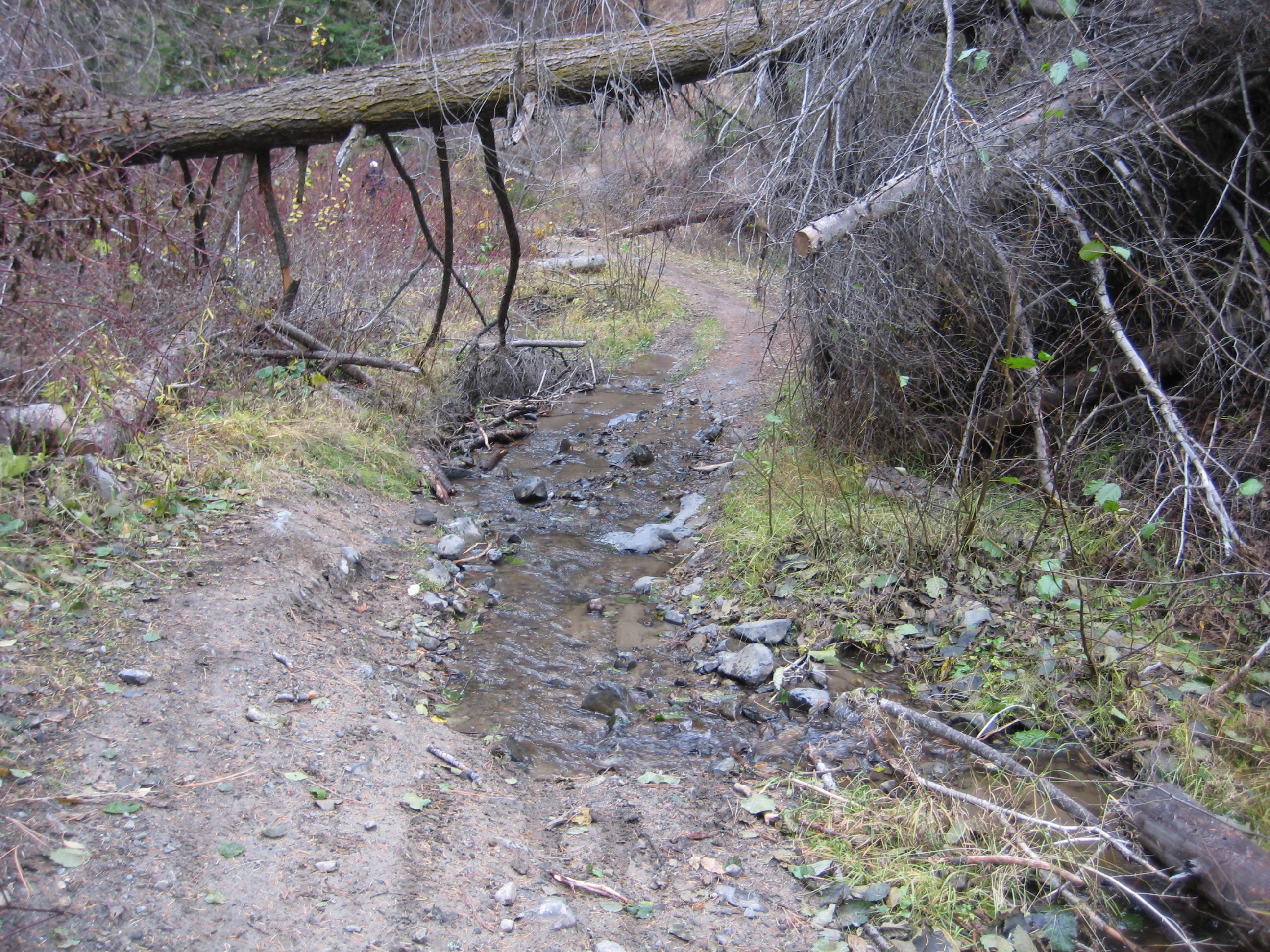 Turning onto the trail, I went over the berm, dropped down a steep bank, splashed across a drainage swale, and began riding upstream.