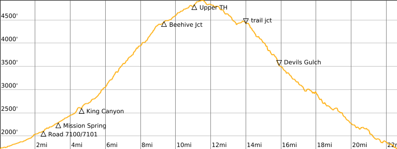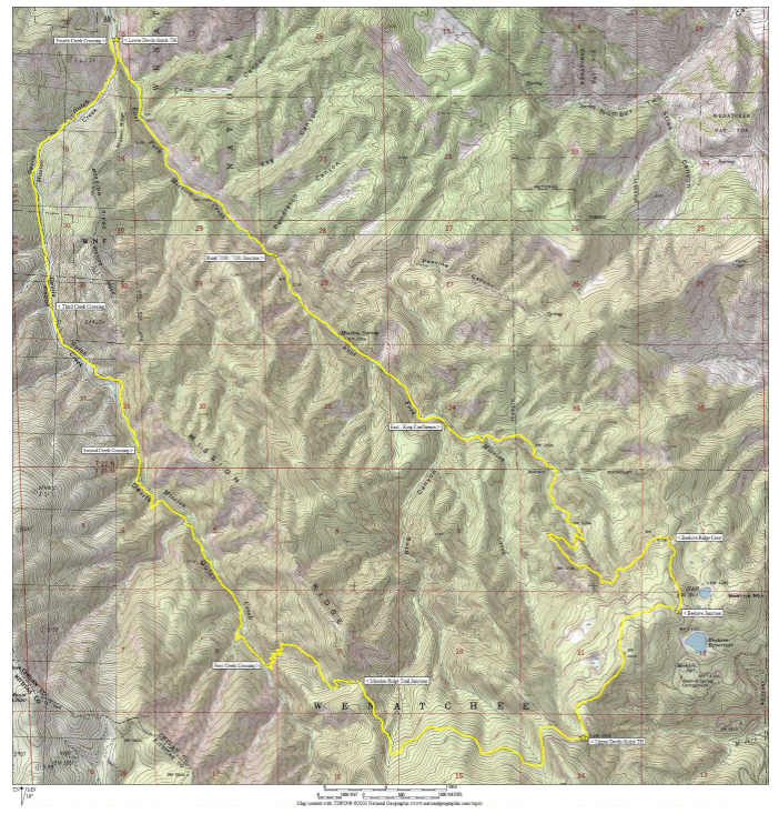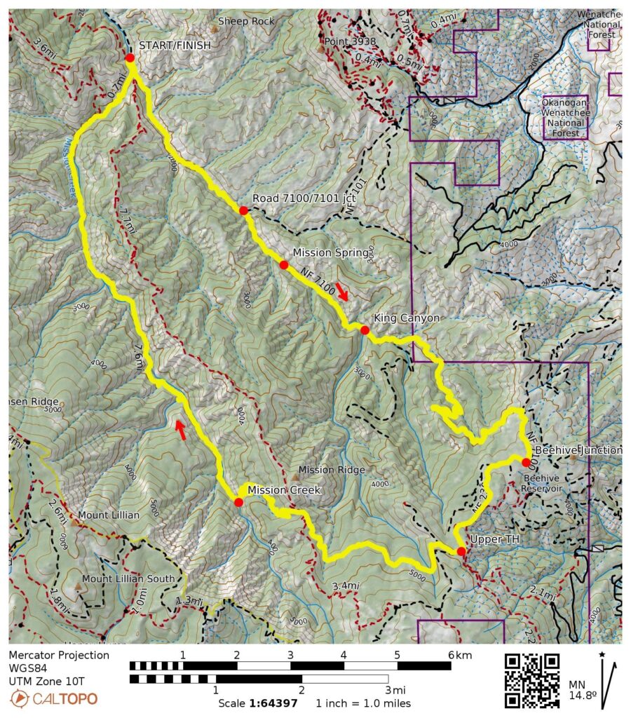 Way Points: Mission Creek Fork & East Fork Mission Creek & Road 7100 / Road 7101 junction & East Mission Gulch & Mission Spring & King Canyon mouth & Beehive Ridge & Beehive Junction & Upper Devil’s Gulch Trailhead & Upper King Canyon & Mission Ridge Trail junction & Lower Mission Ridge & Main Fork Mission Creek & Devil’s Gulch & Mission Creek Fork & Mission Creek Bridge (bike ride)