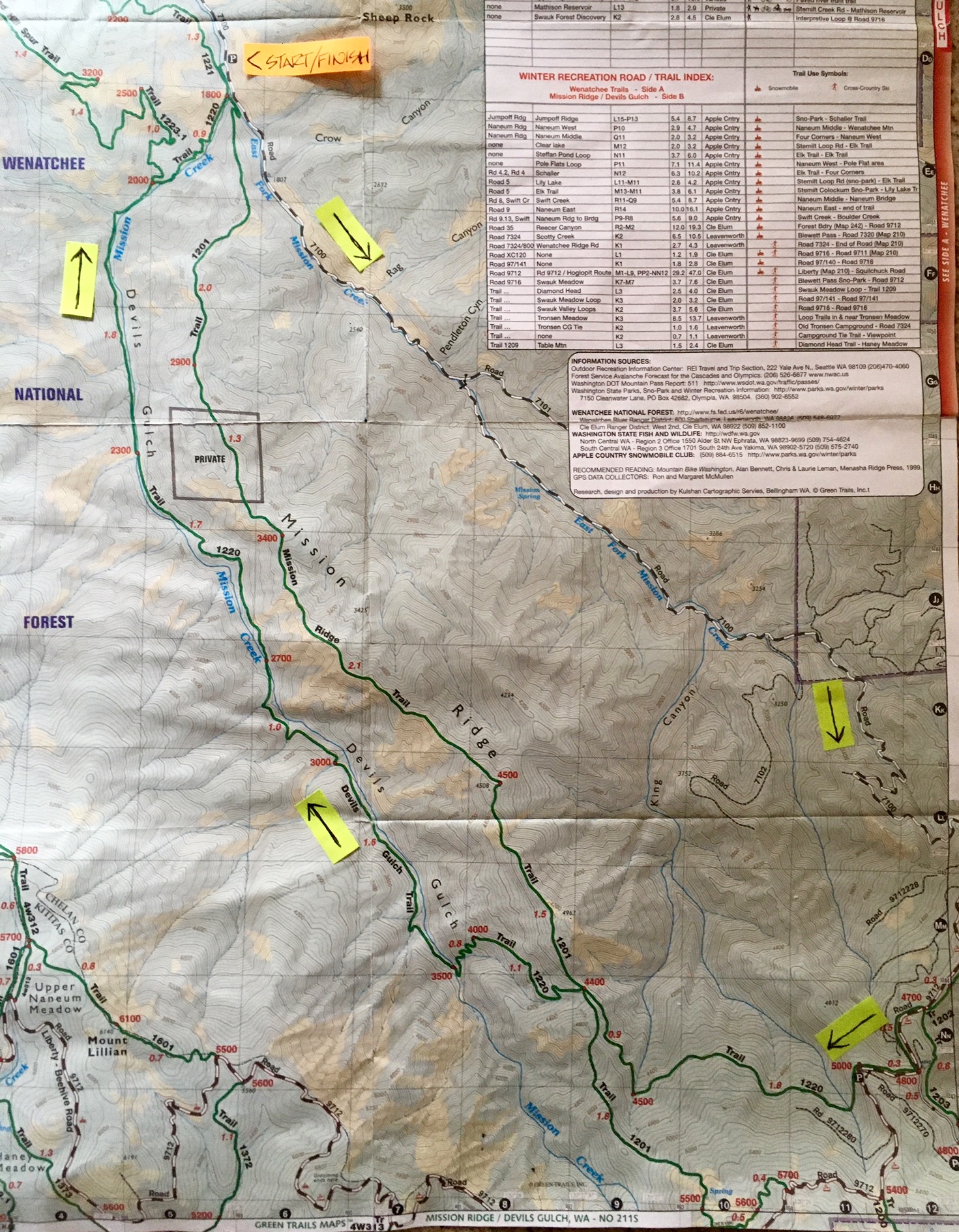 In the Mission Creek watershed—an area blessed with many good mountain bike trails—the East Devil Loop stands above all other rides.  This bike loop offers three distinctly different components: the first is a sustained workout as it climbs through East Mission Gulch; the second is a scenic traverse along the crest of Beehive Ridge; and the third is a thrilling descent of uber-classic Devil’s Gulch.  The ride logically starts and ends at the Lower Devil’s Gulch Trailhead, which is easily accessible from Cashmere via Mission Creek Road, and most of the route follows well-graded single-track or double-track trails.