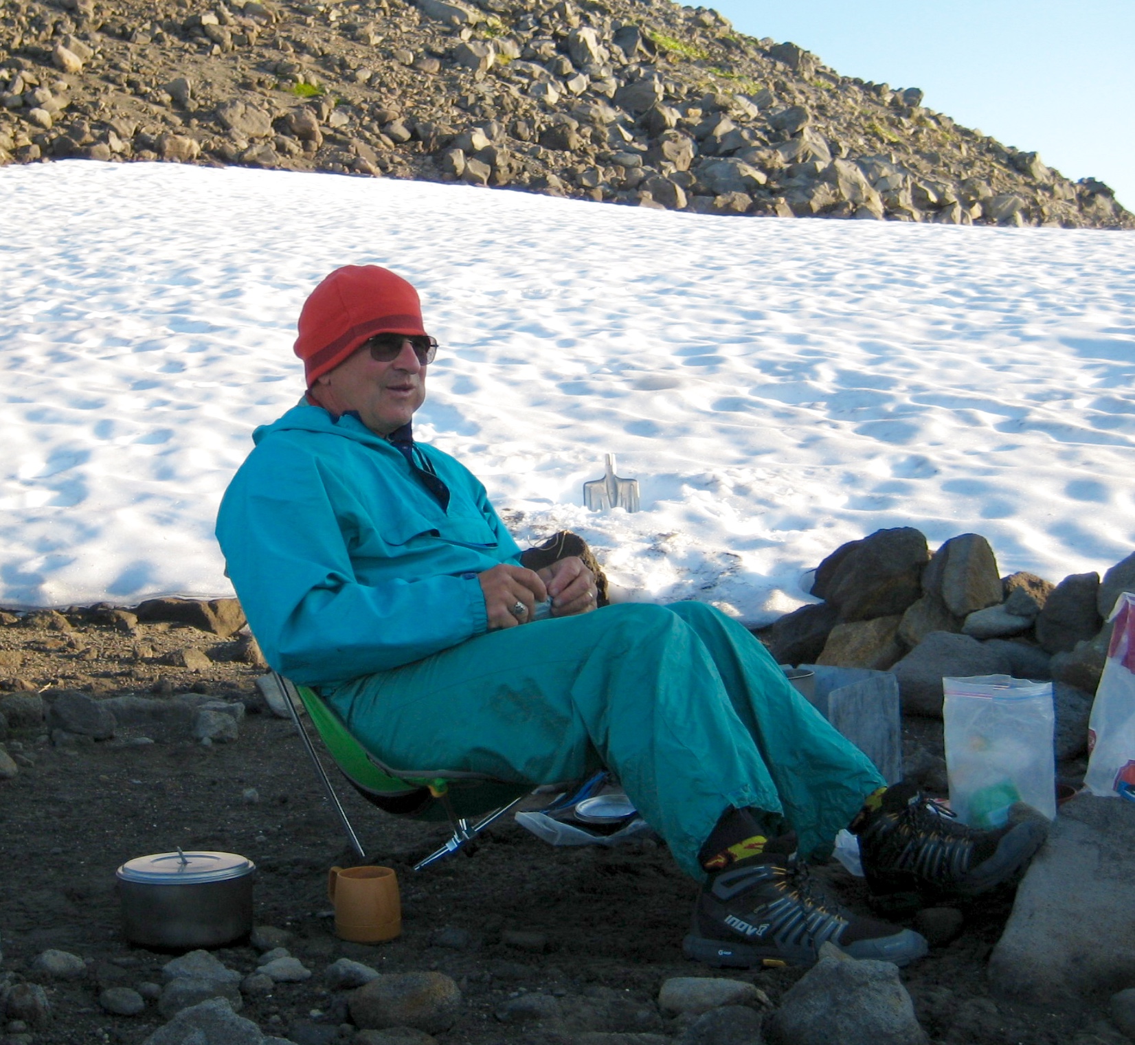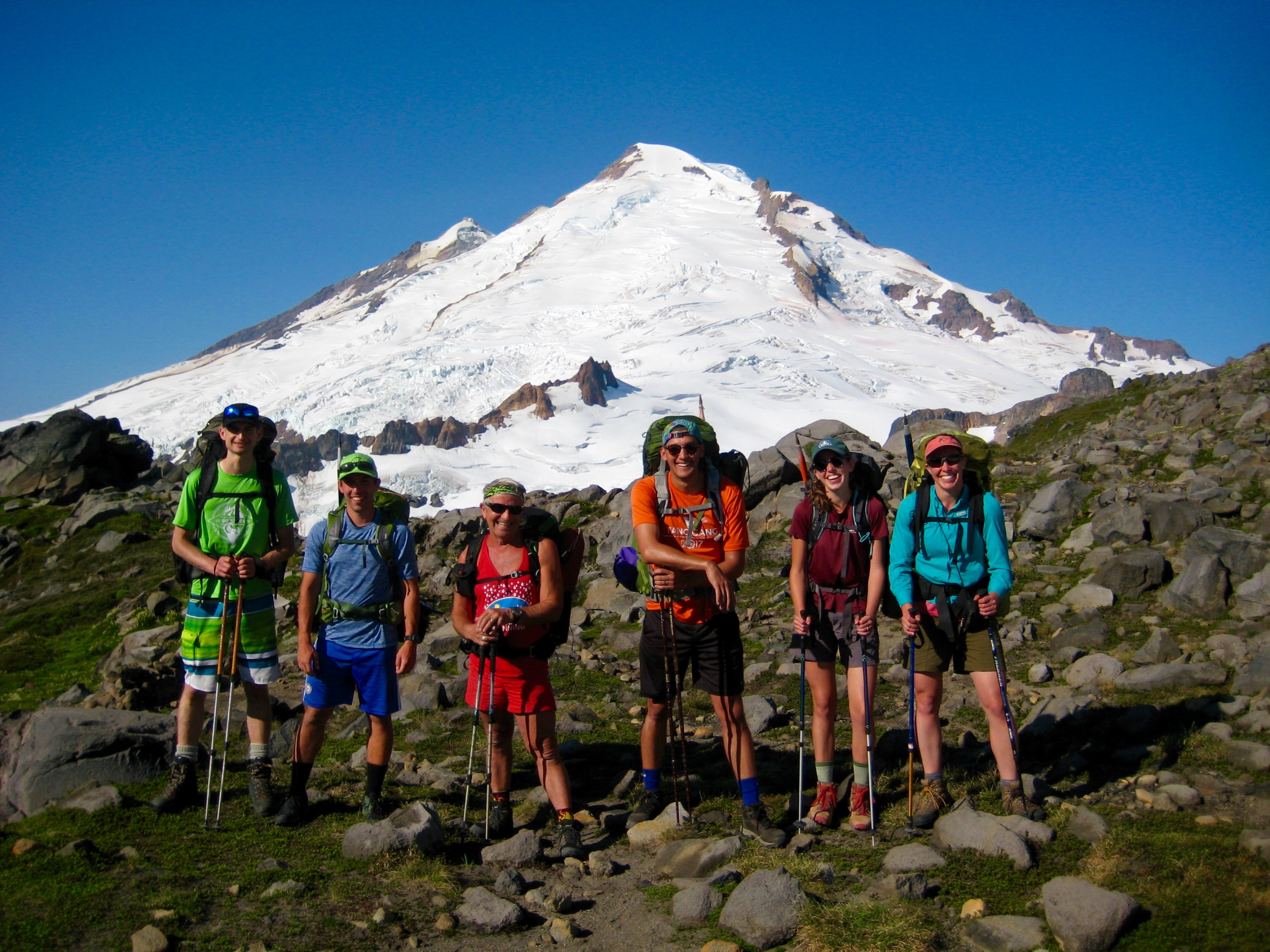 I joined Doug M. and his group of five young adults for a short but delightful backpacking trip in the Mt. Baker Wilderness. Doug is a fellow geologist who spent over 40 years teaching earth sciences in the Bellingham area, along with a stint of guiding glacier climbs. As such, few people can match his knowledge of Mt. Baker geology and his ability to convey that knowledge onto others. Of course, this gift comes with a price: you must suffer through his vast arsenal of geologic puns. I was more than willing to pay up, and I managed to land a few “PUNches” of my own in return.