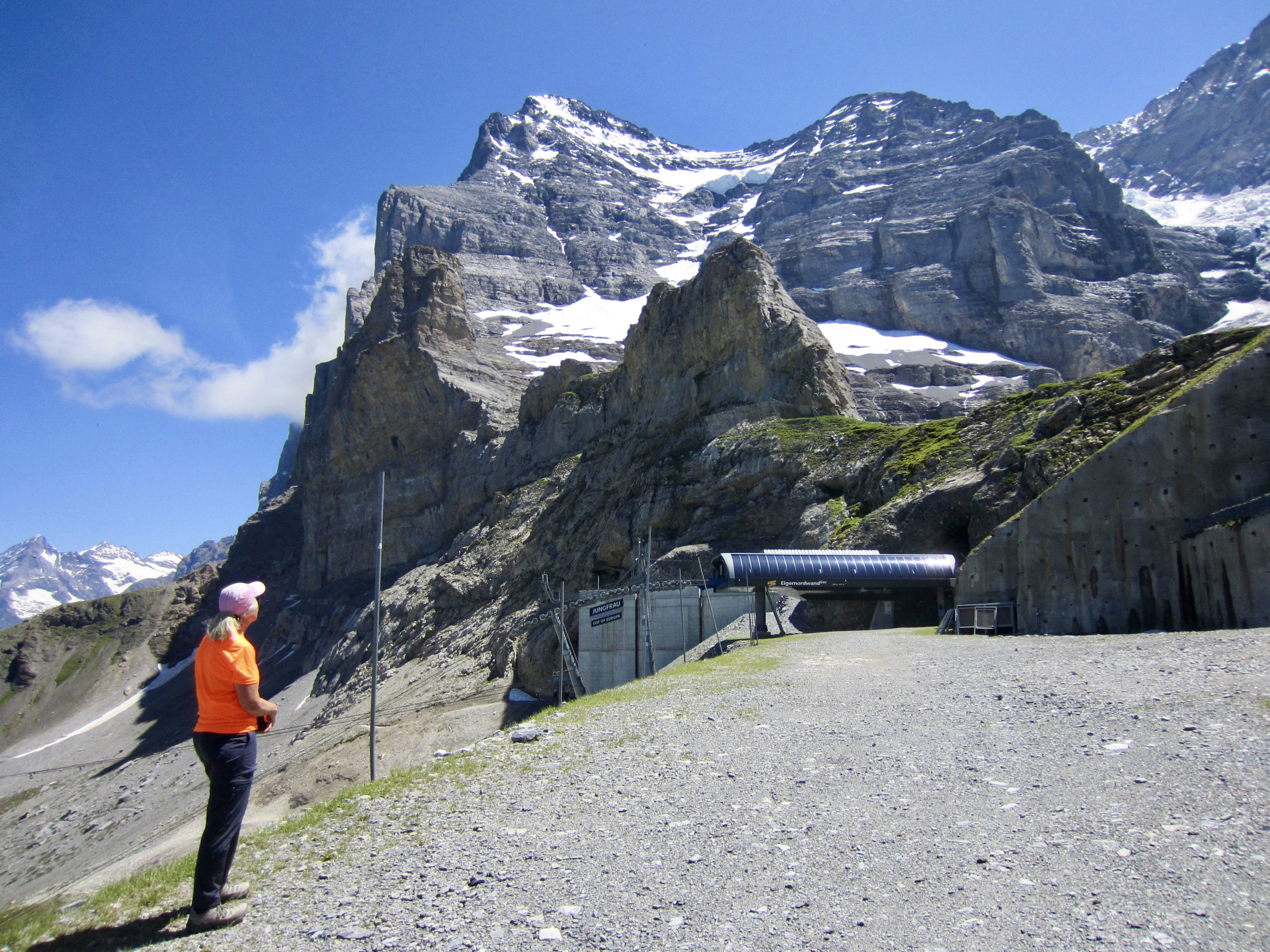 Eigergletscher Station lies at the upper terminus of the relatively new Eiger Express gondola, which whisks hikers to an elevation of 7650 feet / 2330 meters. From this high station, the Eiger Trail curves around the building and up to a gravel landing called The Walk of Fame.