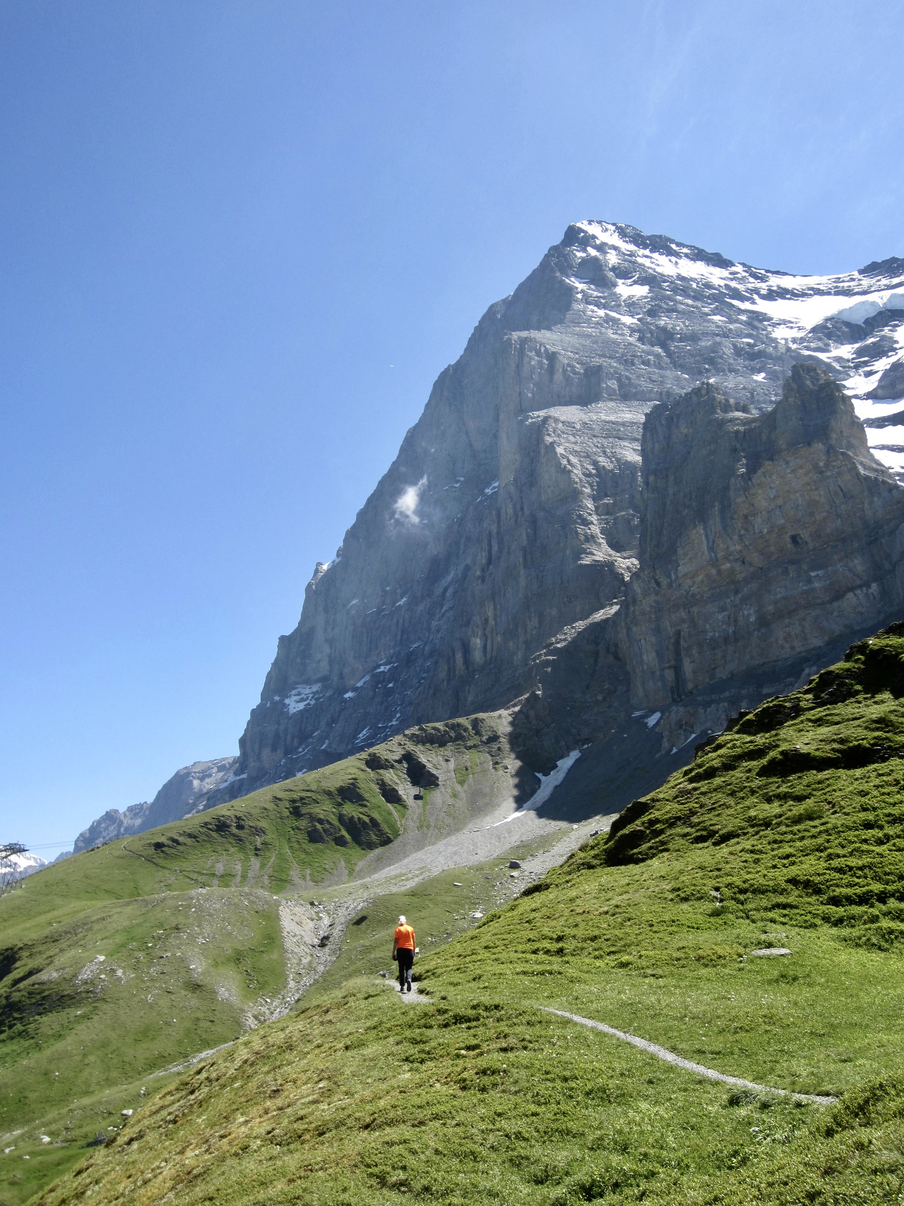The Eiger Trail is a very popular hiking route in the Bernese Alps of south-central Switzerland. Due to the wishbone configuration of the trail, it offers three possible starting and ending points. This provides six different hike options, ranging from one hour to several hours, thereby accommodating a variety of itineraries. All options give hikers a close-up view of the massive and ominous north face, or nordwand, of the legendary Eiger. Furthermore, any of the starting and ending points is accessible by either train or gondola, which makes it very convenient to do a one-way traverse.
