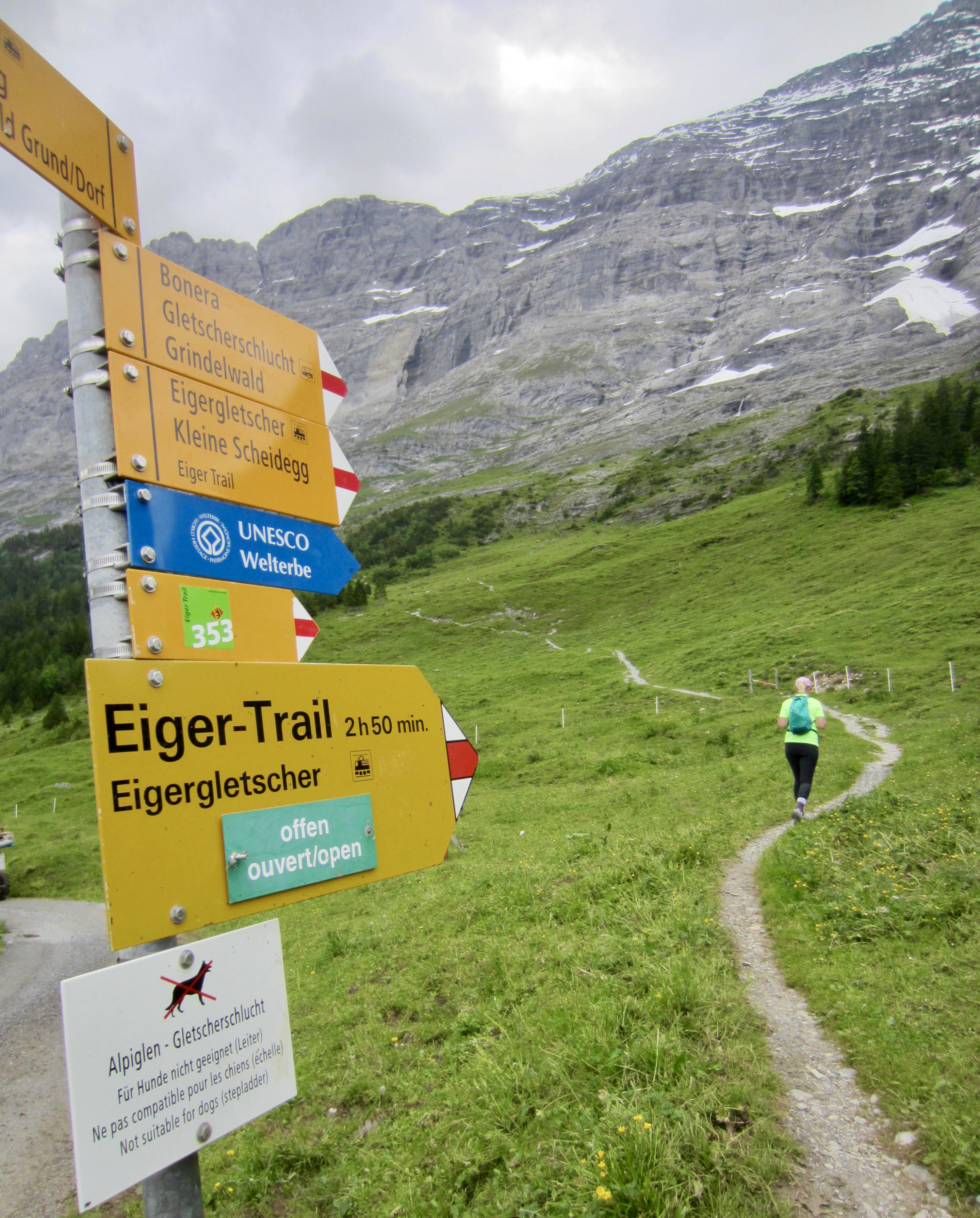 Alpiglen Station lies on the route of the Jungfrau-bahn cog train that runs uphill from the Grindelwald Grund Terminal. The Eiger Trailhead is located at the northern end of the depot building here. From this trailhead, the trail makes a switchbacking climb up a grassy hillside.