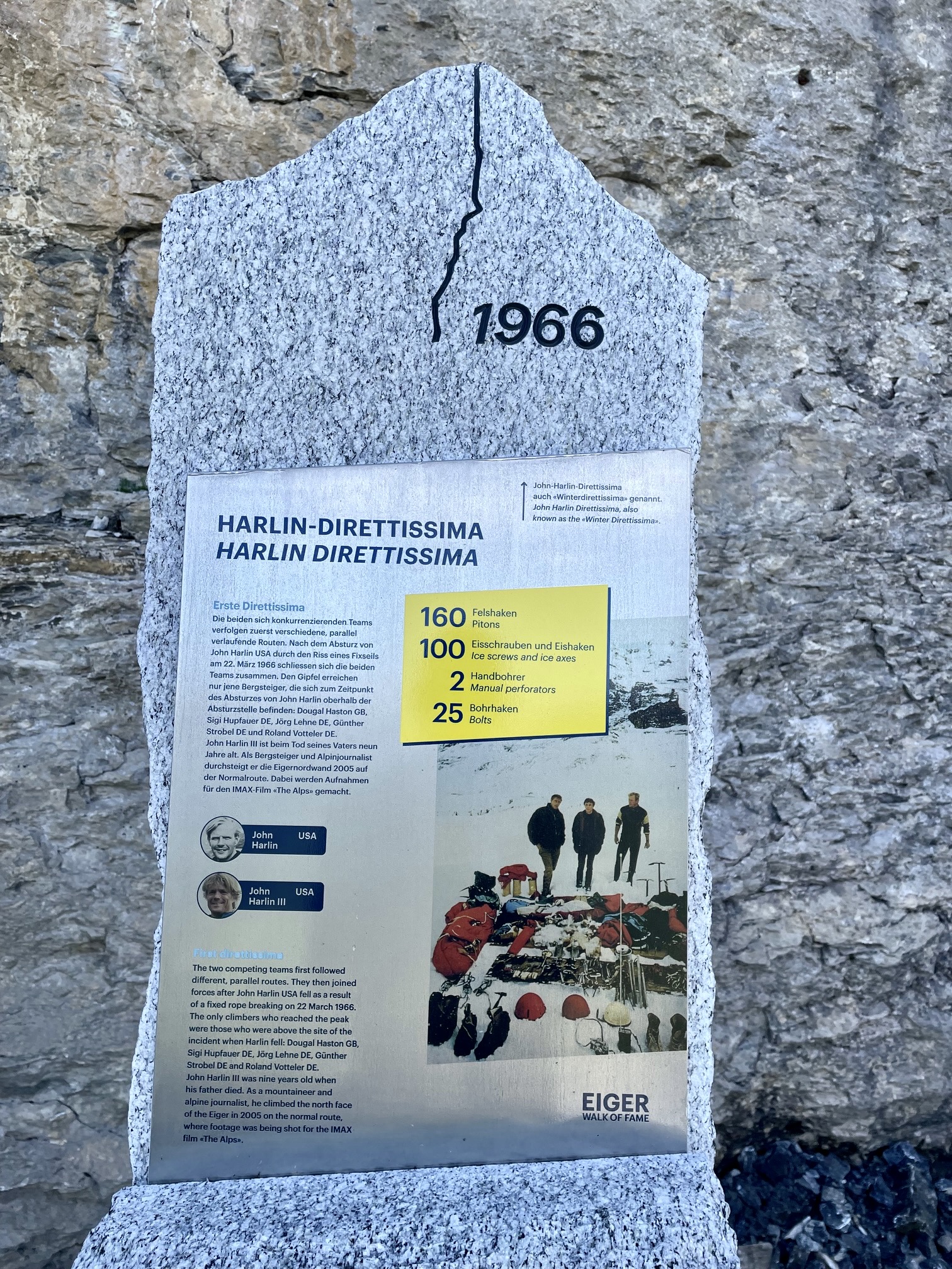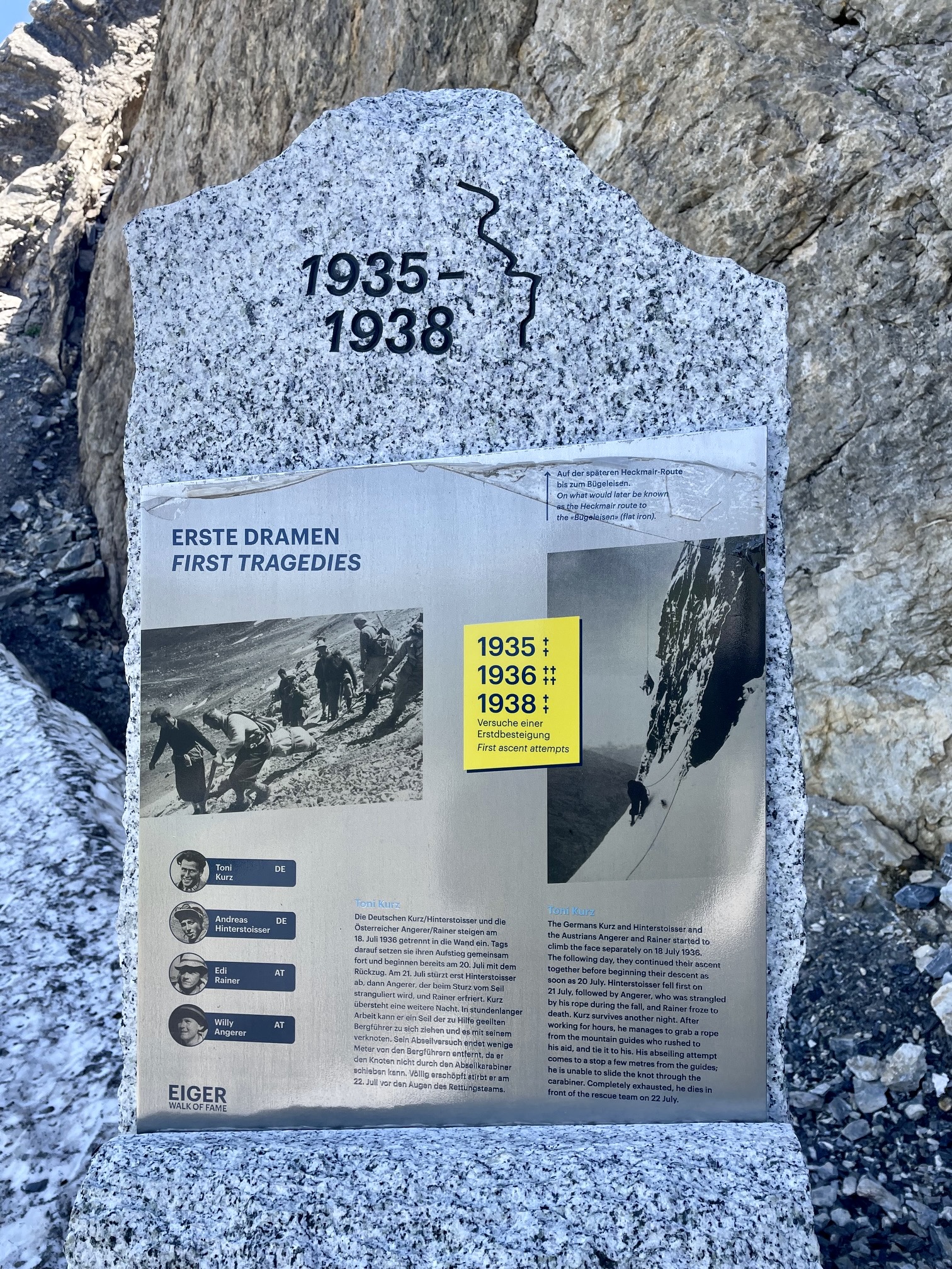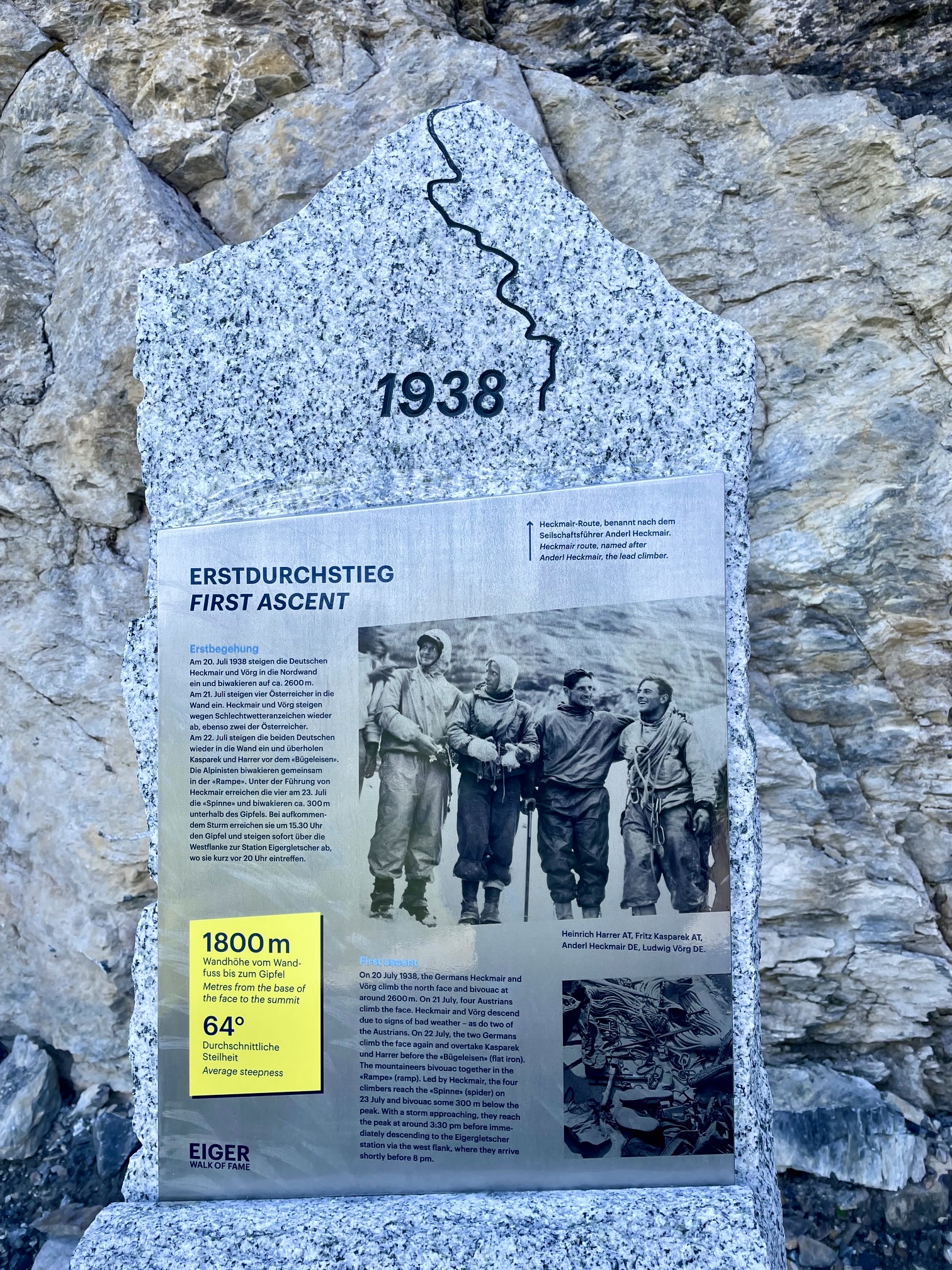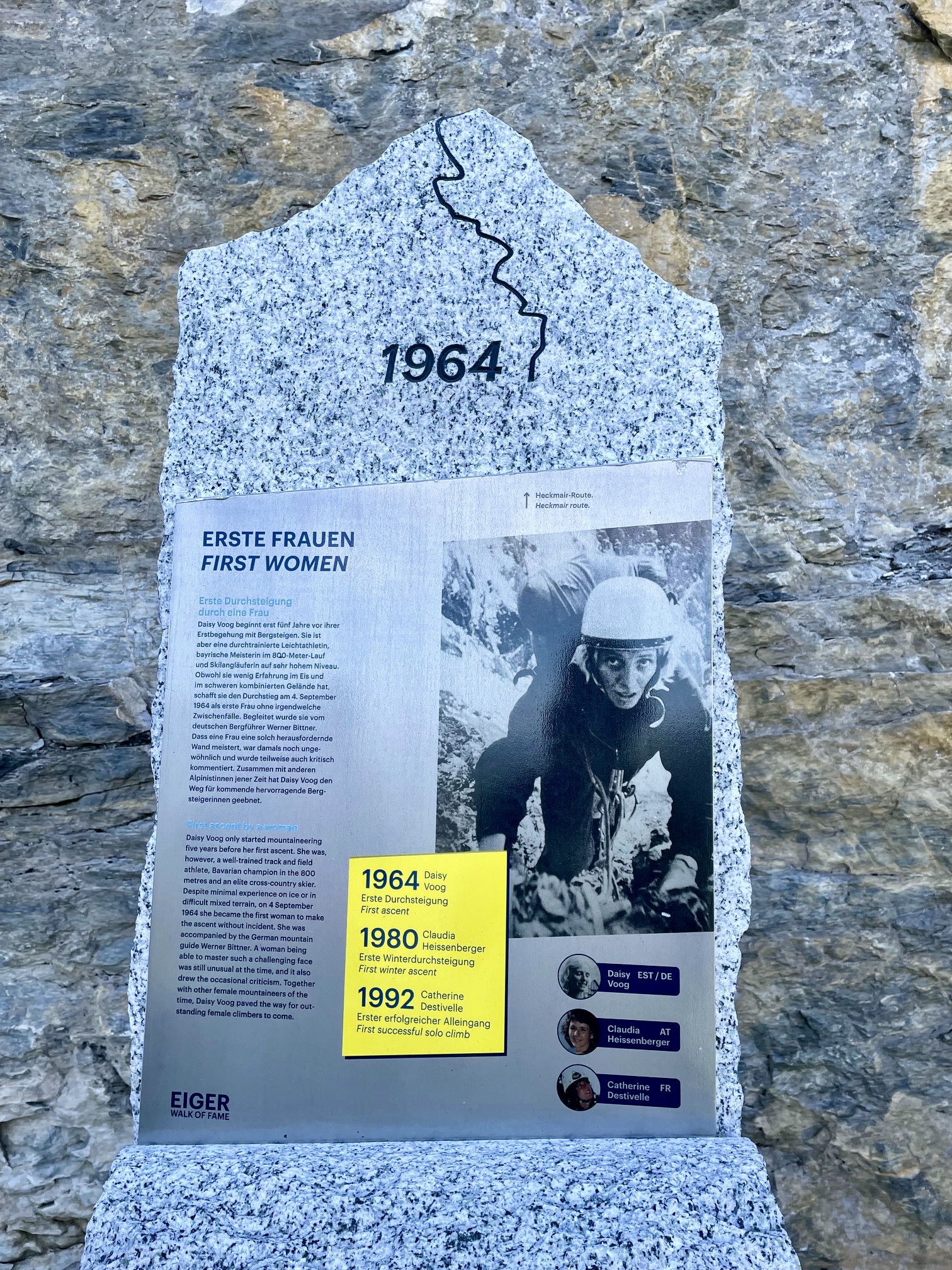 The Walk of Fame displays numerous monuments dedicated to key events and people associated with the Eiger’s north face. These events include the first attempt, the first successful ascent, and the first women’s ascent.
