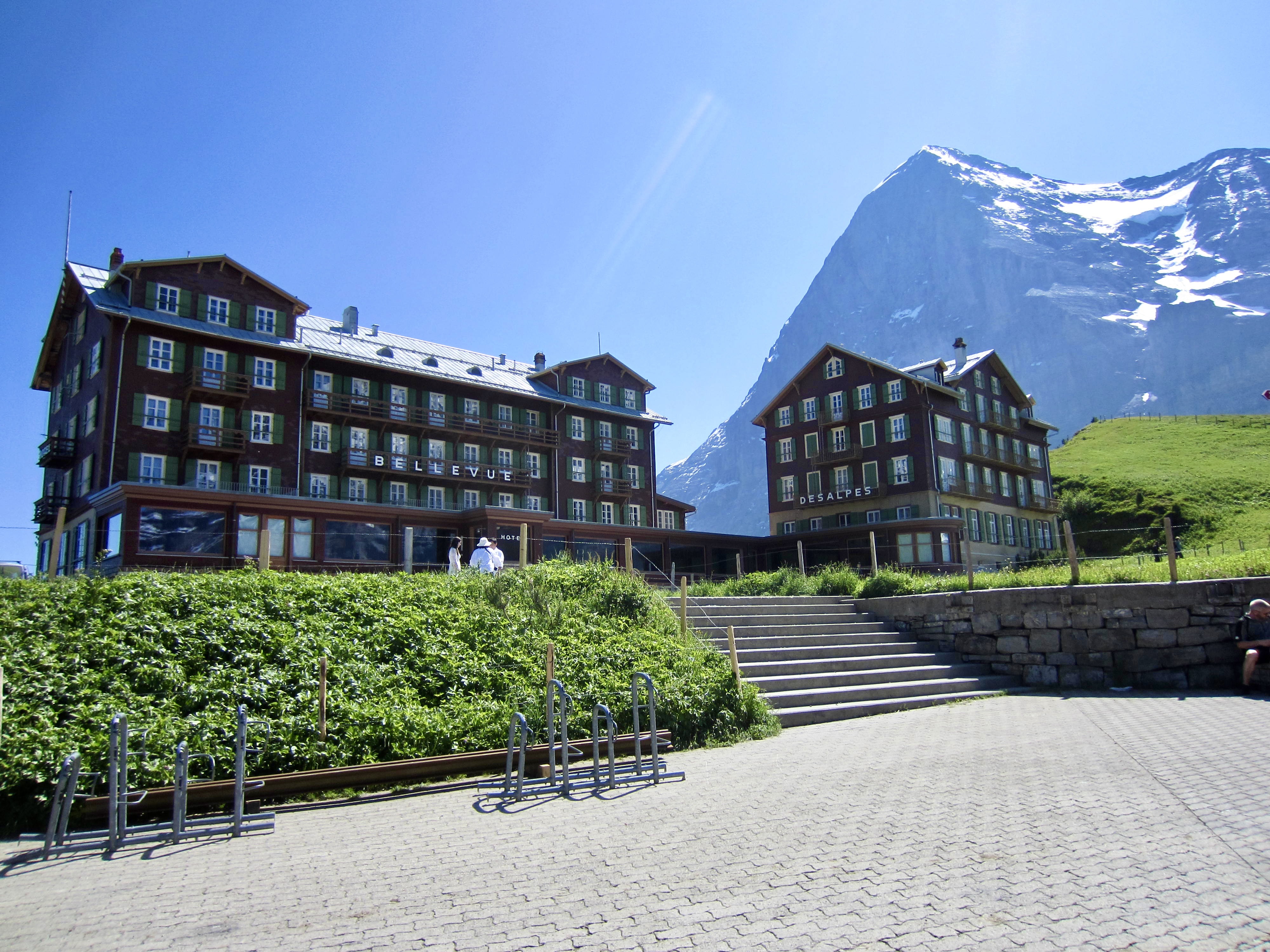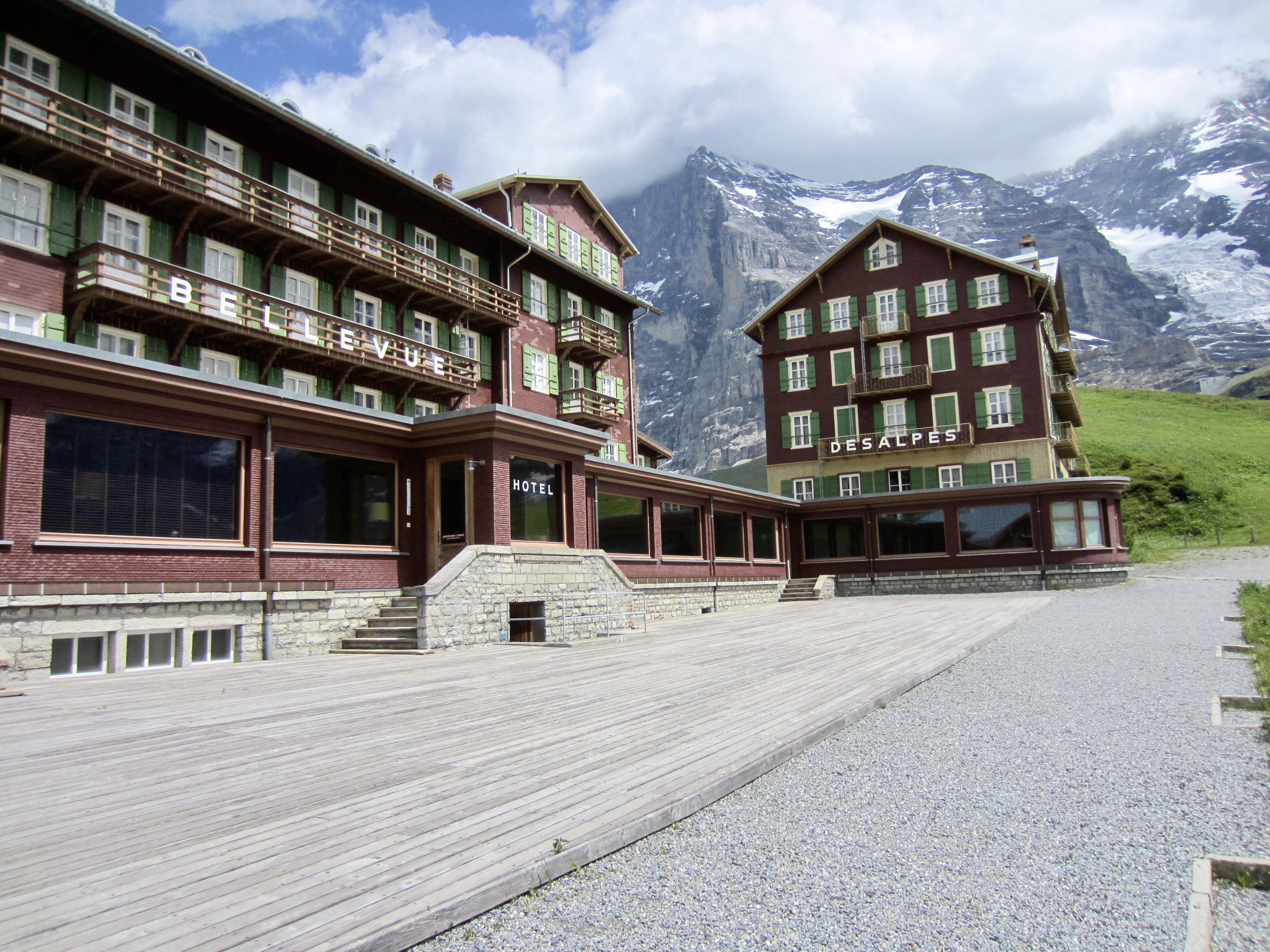 The little resort village of Kleine Scheidegg lies at the end of the Jungfrau-bahn cog train that runs up from the Grindelwald Grund Terminal. The Eiger Trailhead is located on the south side of the Bellevue and Des Alpes hotel buildings here. Both of these hotels were prominently displayed in Clint Eastwood’s cinematic masterpiece, The Eiger Sanction.